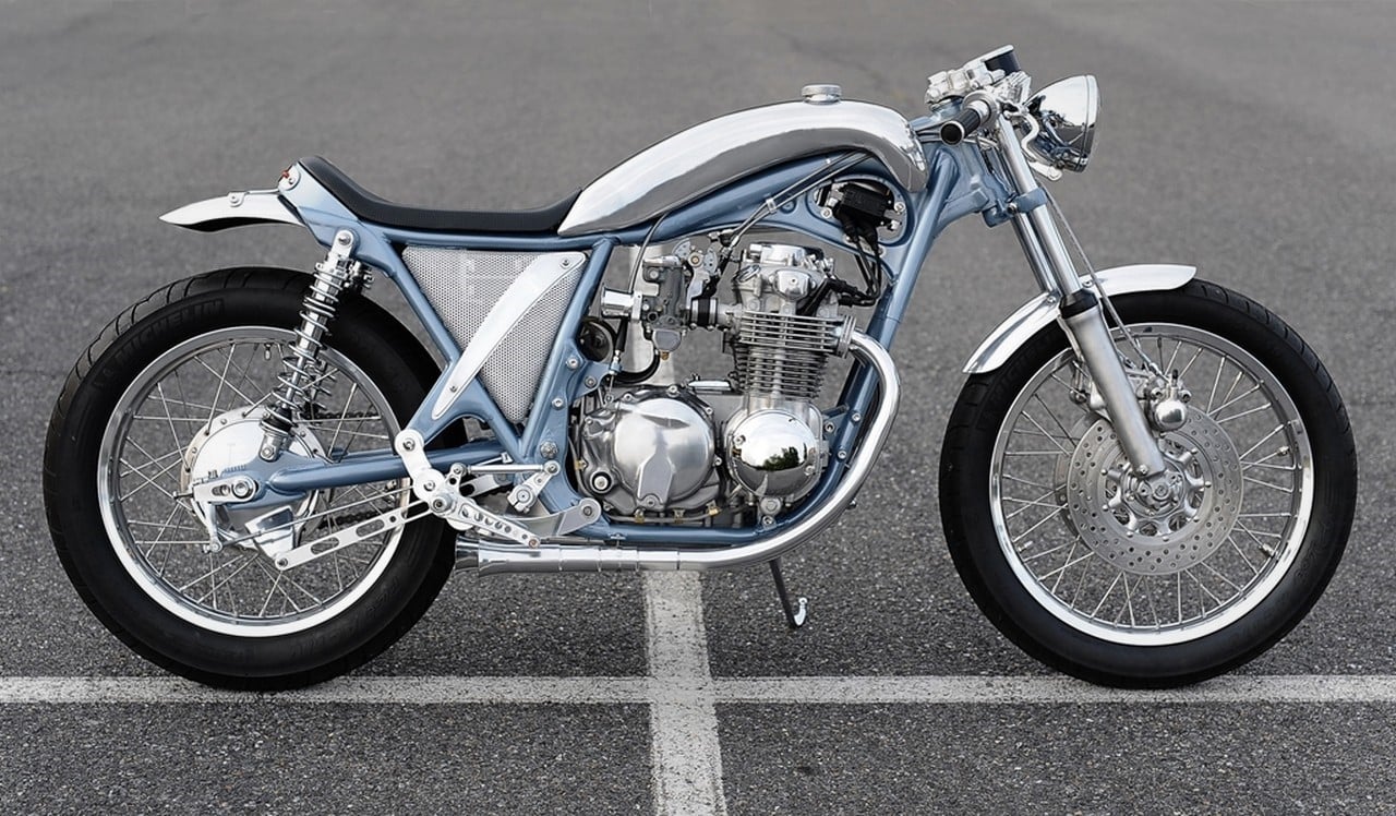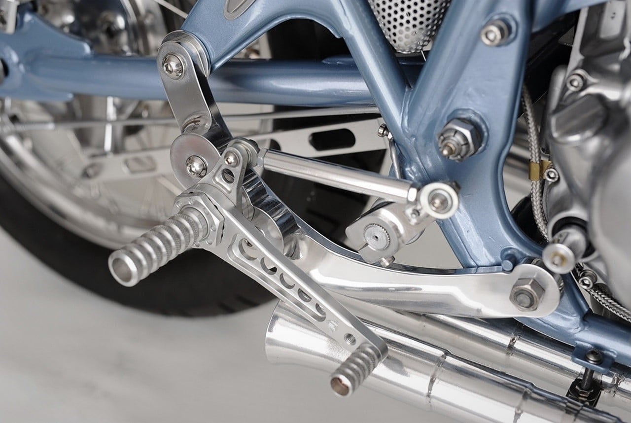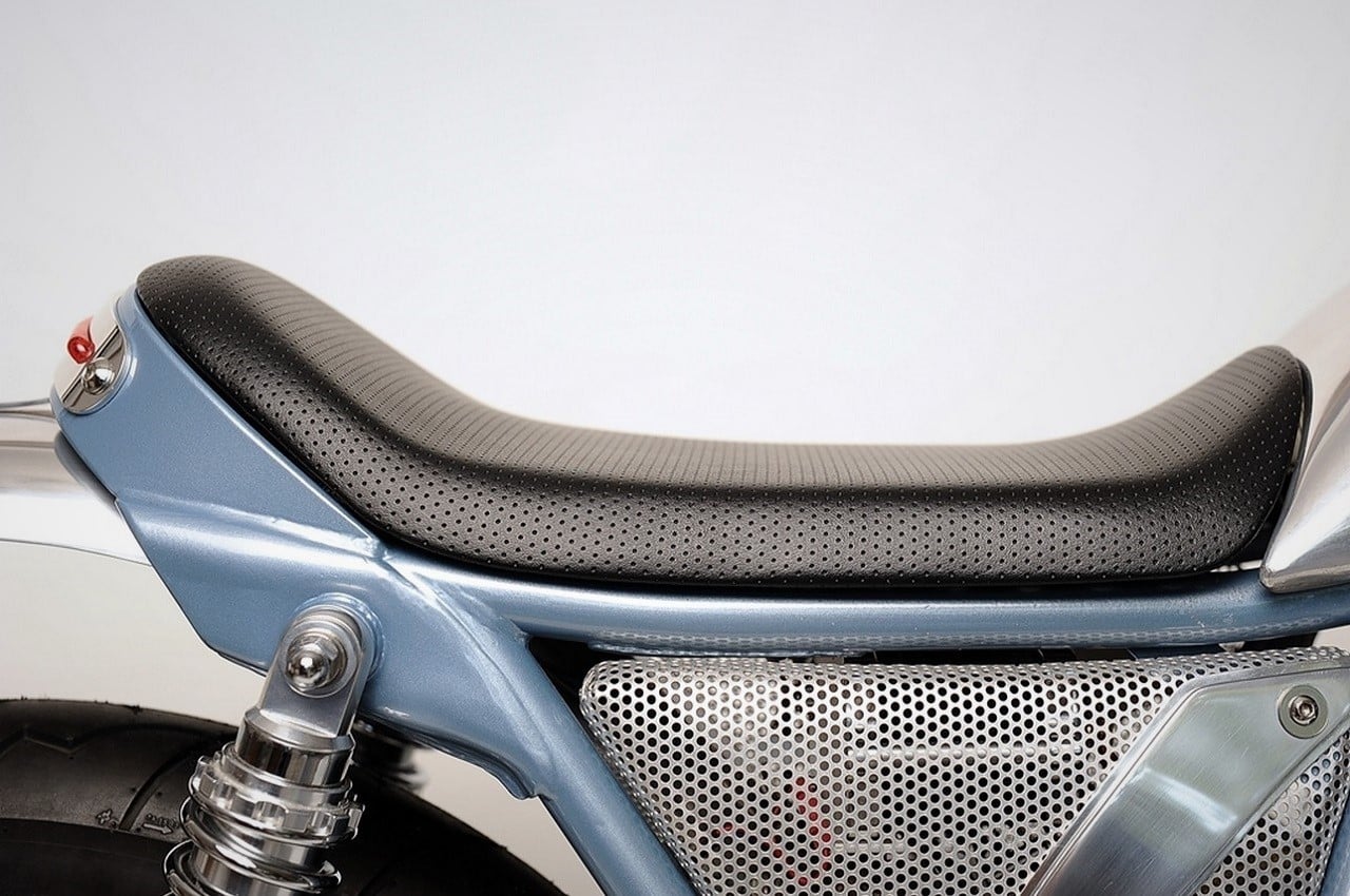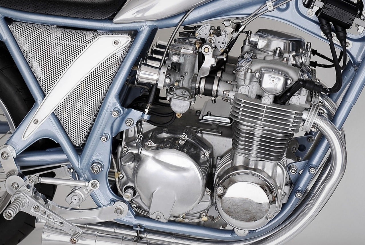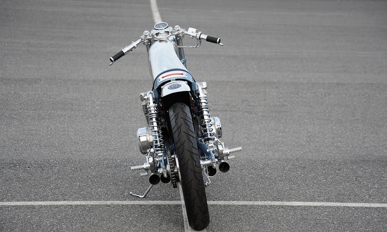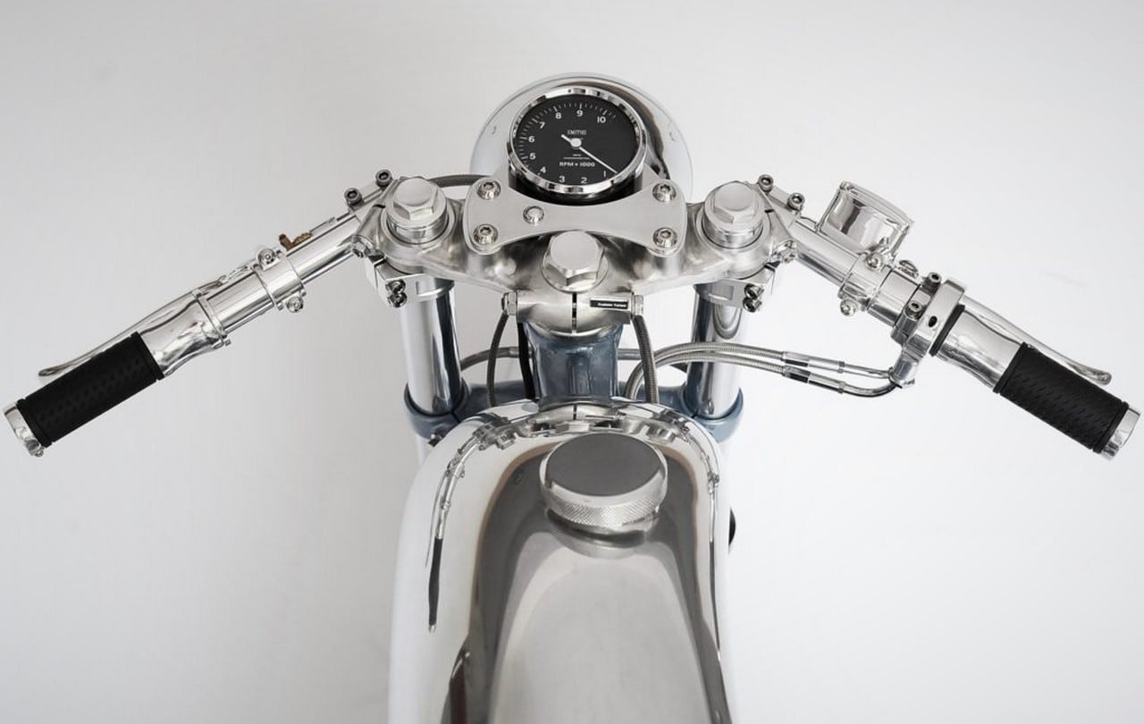 One side of the fuel tank has been removed to give a better view of the coil and the spark plug leads. The frame came from a 1972 Honda CB500 that had its rear part modified. The final coating of Powder Blue tops off a gorgeous and unique custom cafe racer that is still completely street legal.