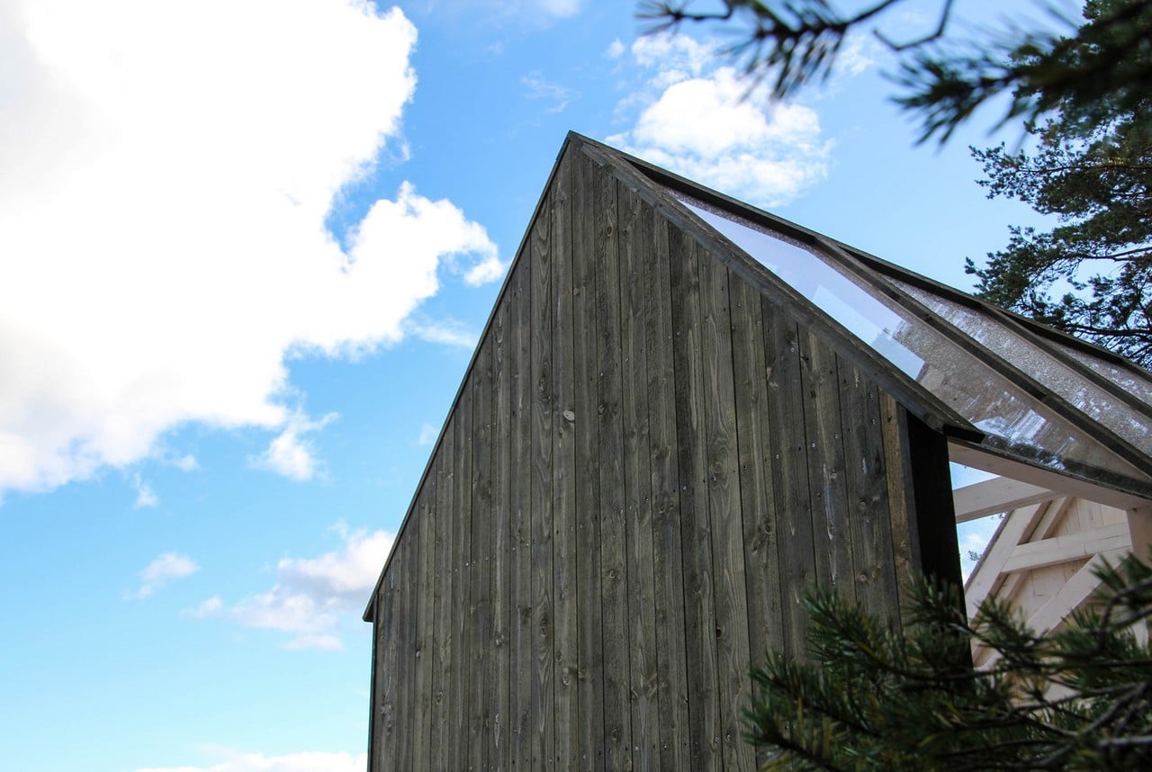 The tiny shelter is basically a 54 square foot (5 sq.m.) bedroom with both long walls and the ceiling made of glass for unabridged enjoyment of the scenic environs of the island forest and lake. The 72-Hour is built of locally sourced Norway Spruce with the boards spaced loosely to provide adequate ventilation and prevent over-heating the raised platform interior.