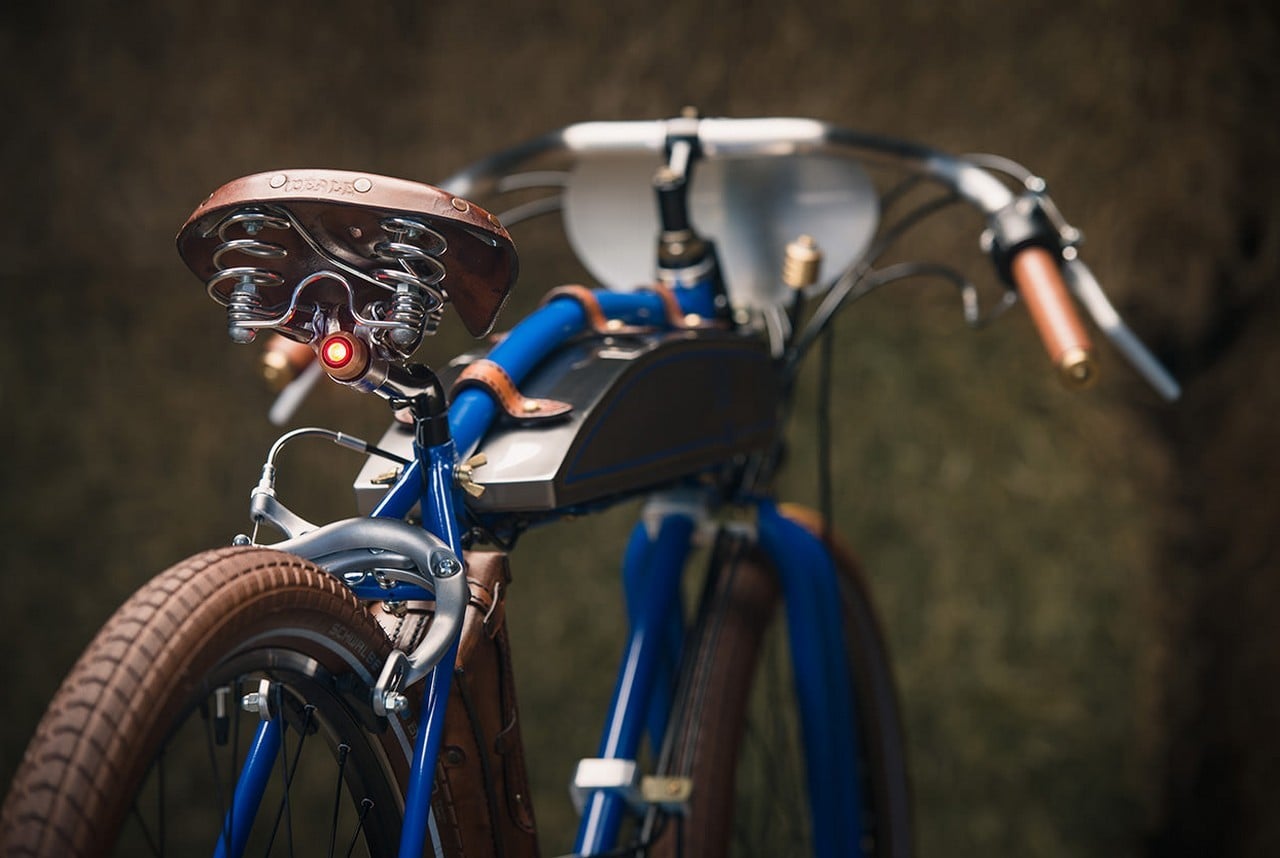 Other modern upgrades included the inclusion of a Denali tail light and micro-LED headlight. The 12V total-loss battery for the lights resides in a leather pouch behind the seat. The frame, while sound, did show some age damage, but any scars from the healing have been covered by the 1960’s Ducati Kingfisher Blue paint complimented by fine brass, aluminum, and stainless steel accents.The result is a flawless restomod that should bring a child’s smile to anyone riding it.
