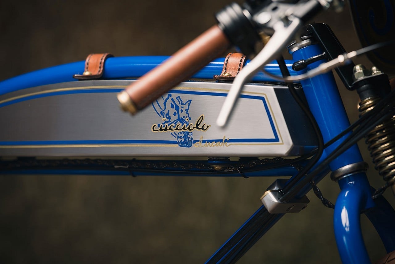An even more rarity in America, this Ducati Cucciolo (Italian for “puppy”) was brought to the hands of Chicago’s Analog Motorcycles by a frequent client. Among the refits were the streamlining of the lever setup with a Biltwell Whiskey twist throttle, clutch, and dual-pull brakes. The hand-crafted tank bears a painted version of the original logo.