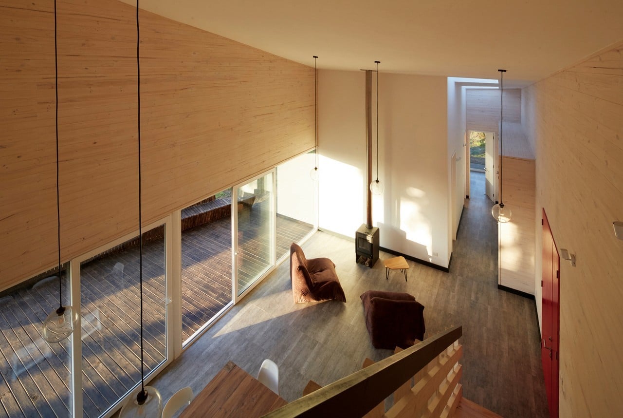 The structure is constructed almost entirely of wood with the first inner skin comprising pine, OSB structure walls, and insulating mineral wool with a zinc coating. The facade makes up the second skin and is dark brown dyed pine boards that flow between roof and wall surfaces.