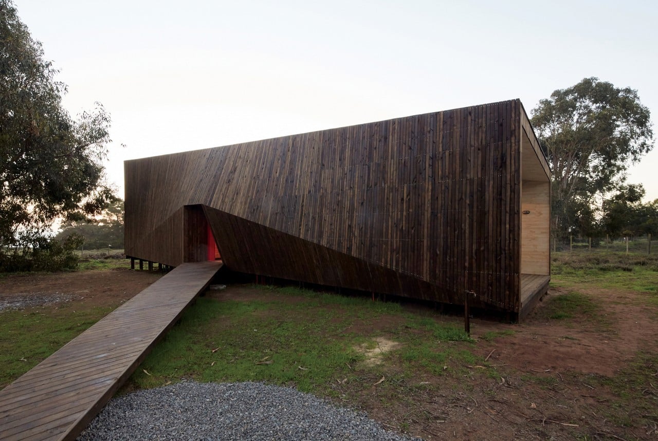 The angles and ventilated facade allow the Dos Pieles House to remain cool even at the height of the summer season. The highest point of the house is 30′ (9m) over the second-floor master bedroom and the lowest is a mere 13′ (4m). This oddly angled home looks as though it is being bent through strange dimensions.