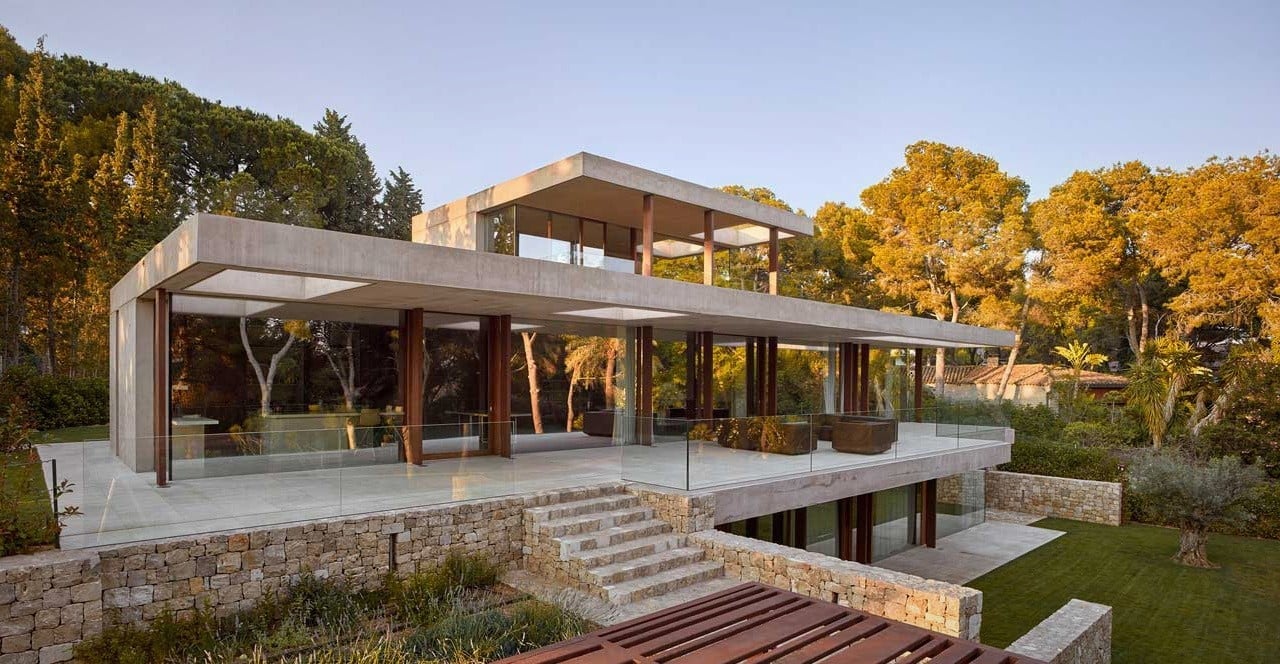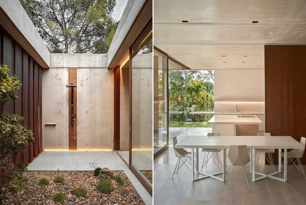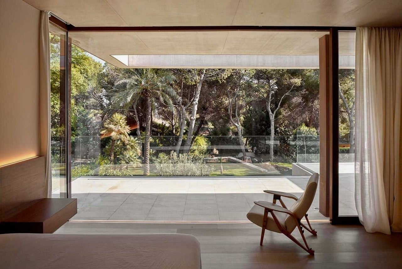 The “House in the Pine Forest” is contrasted by the cluster of young pine trees around the home that will only get better as the trees mature. The house looks out over a large Mediterranean garden and all the glass provides unfettered views of the surrounding garden and grounds.