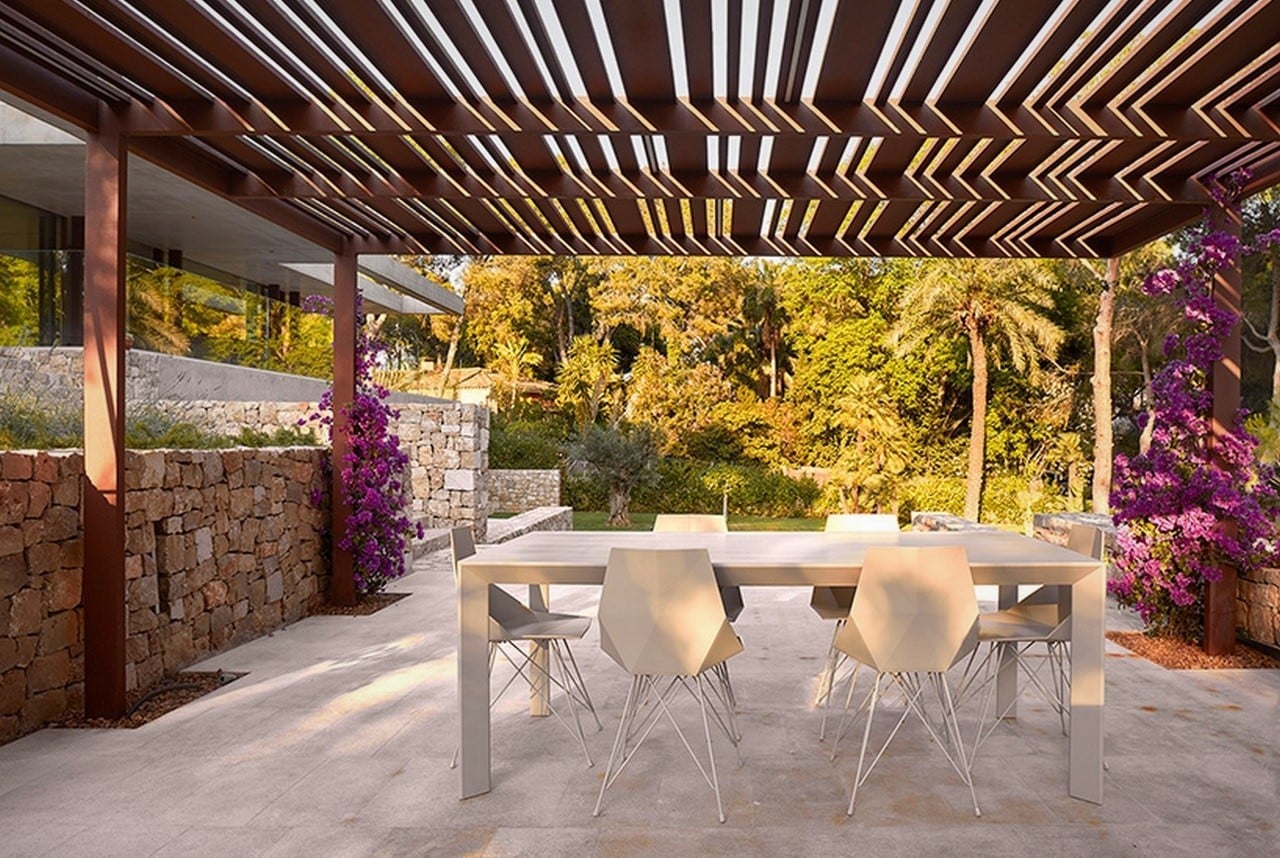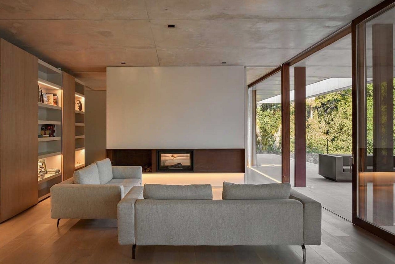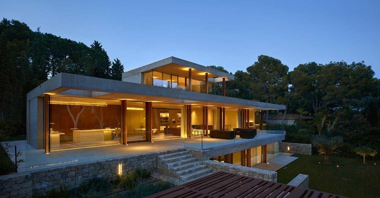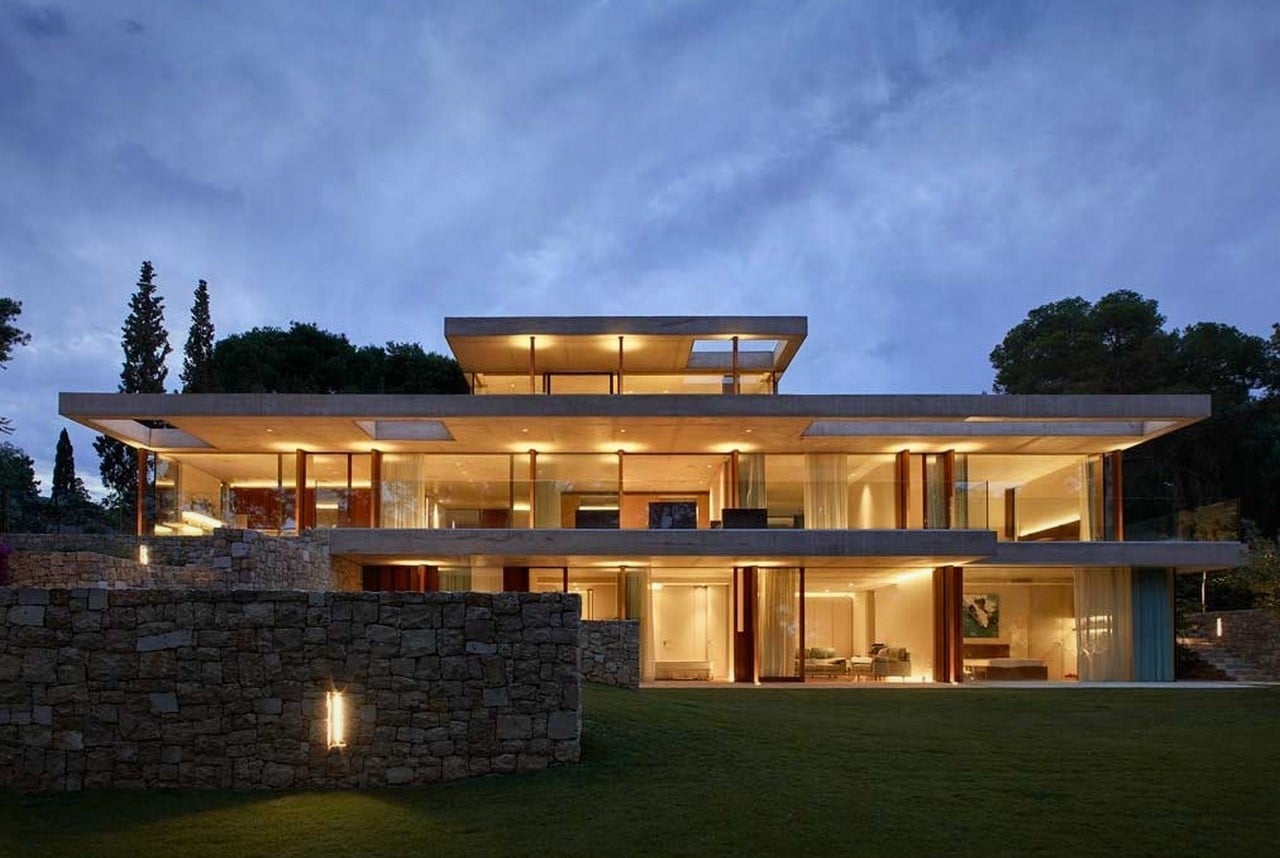 The “House in the Pine Forest” is contrasted by the cluster of young pine trees around the home that will only get better as the trees mature. The house looks out over a large Mediterranean garden and all the glass provides unfettered views of the surrounding garden and grounds.