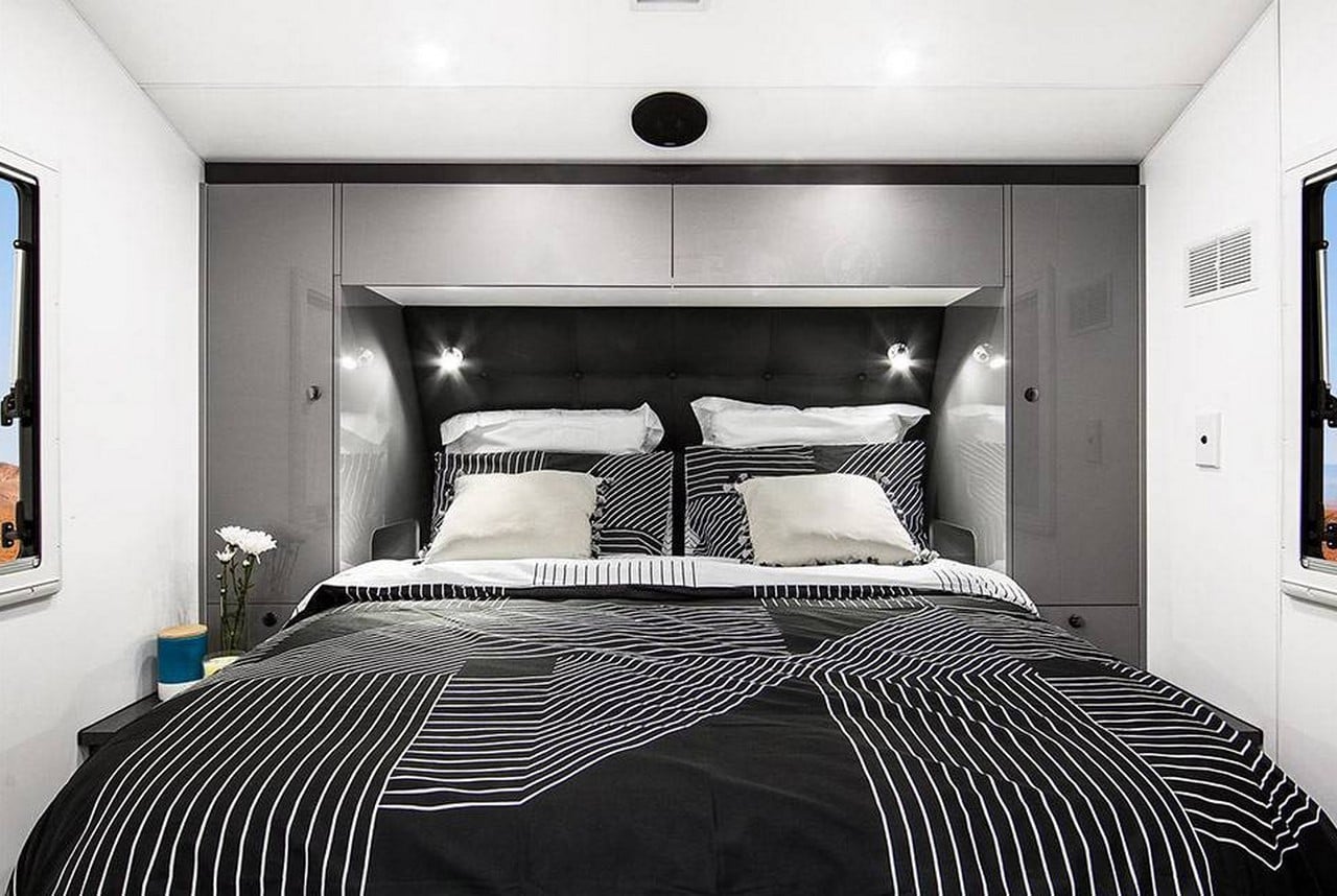 The trailer comes in eight sizes and floor plans ranging from 18’6″ up to 22′ for some unique customization of this off-grid home. The modern electrical system features a REDARC battery management system controlling a 200 amp lithium battery charged by a 600-watt solar panel system. The Trooper also has an Anderson plug for adding more portable solar panel power, and a push-button resettable fuse – a very effective safety precaution.