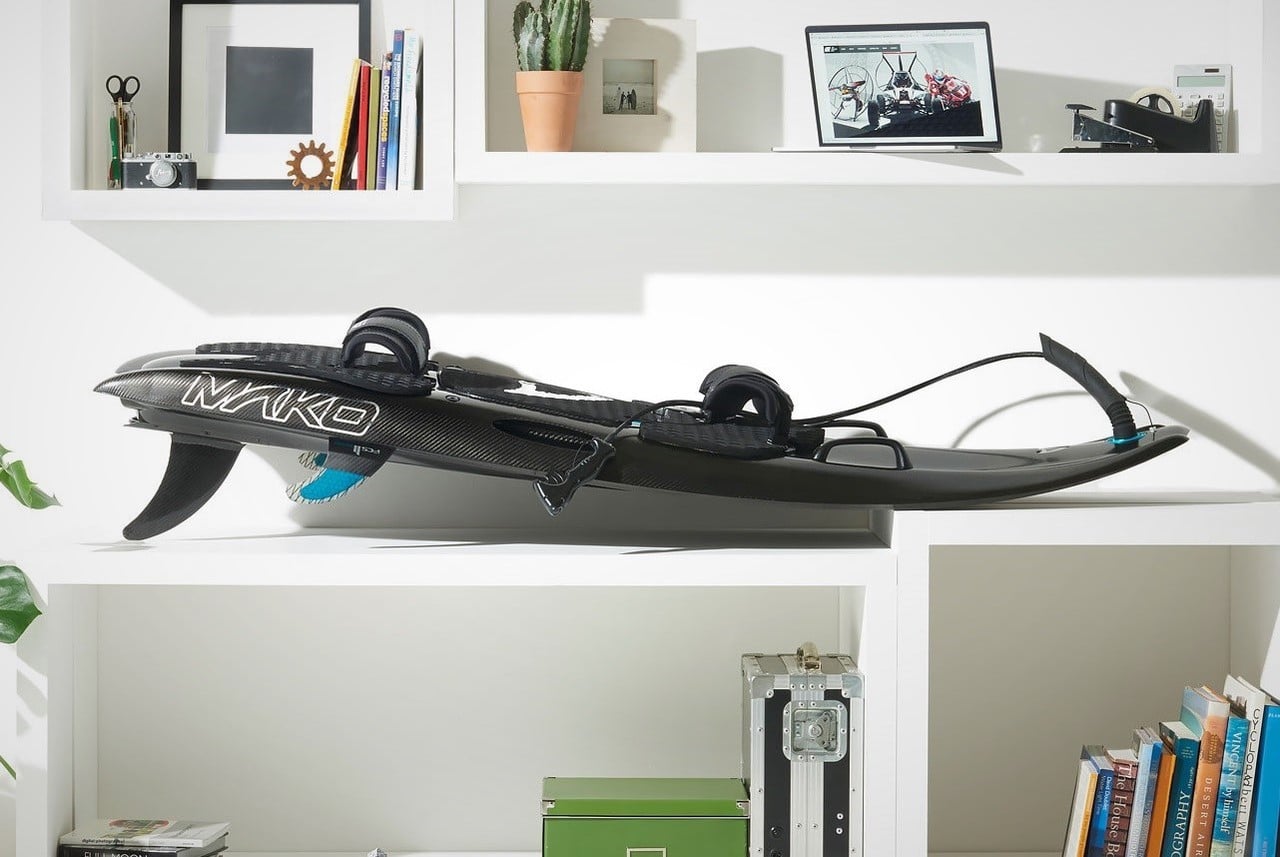 The sleek carbon-fiber body has been designed by naval engineers for maximum stability over numerous water surface conditions. The Slingshot is 72″ long, 23 1/2″ wide, 17 1/2″ tall, and weighs a manageable 43 pounds. It can easily fit car roof racks to get to even the most remote jetboarding locations.