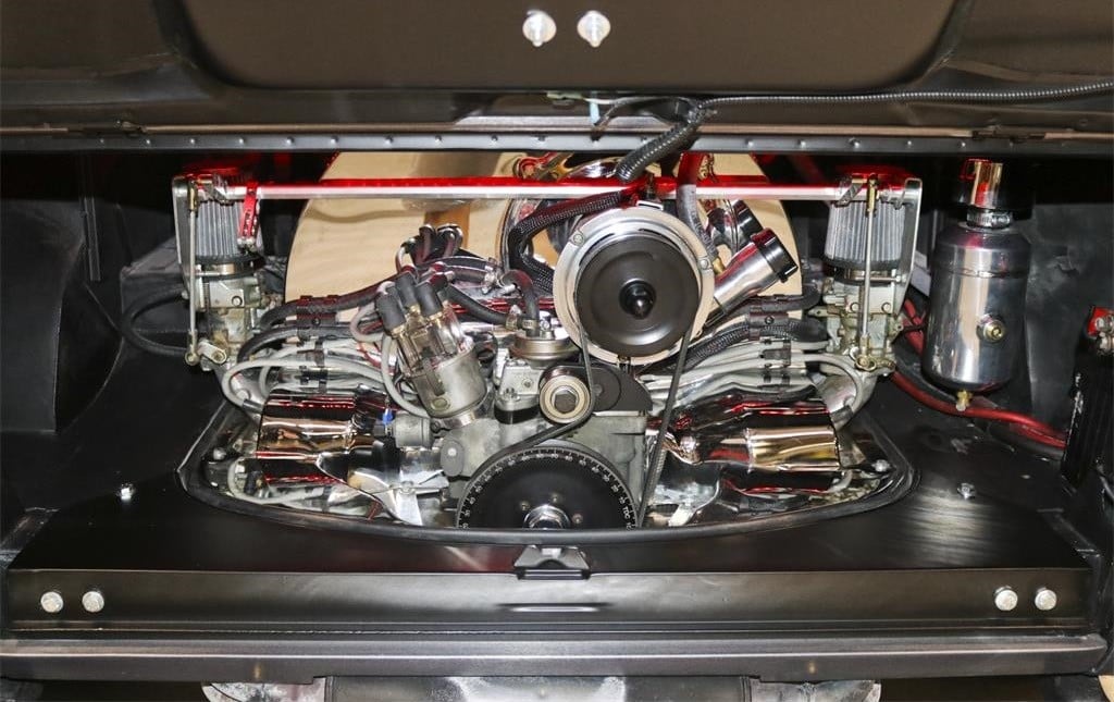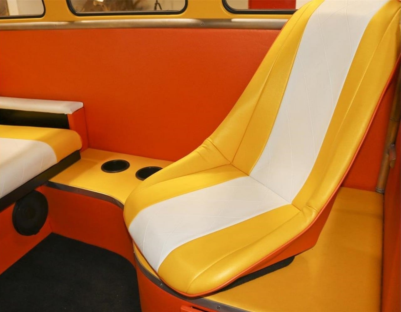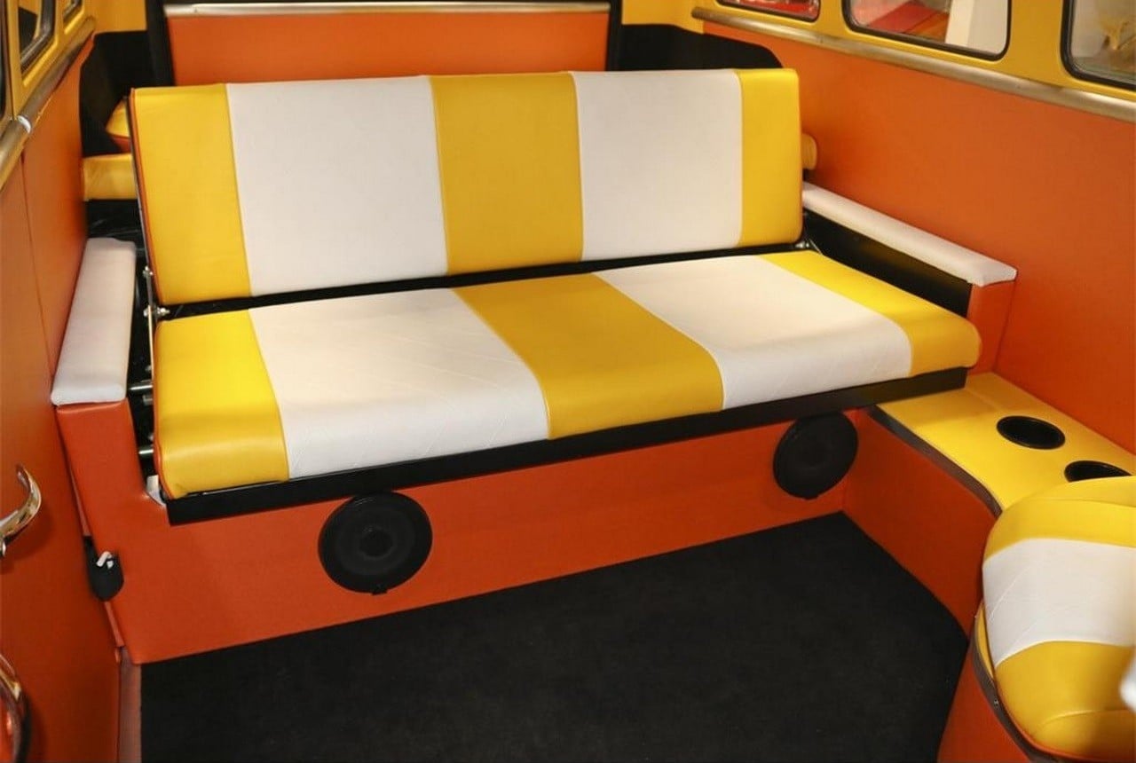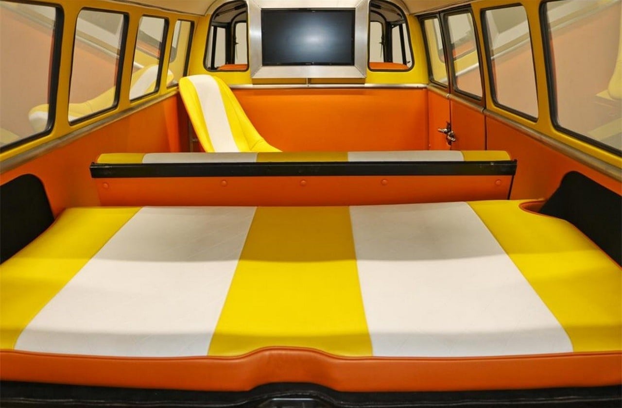 Besides the sleek grey and silver color scheme, the ‘Back to the Future’ VW Bus has been outfitted with DeLorean style gullwing doors. Inside, the bus has been redone in a “quiet” orange and yellow color combination. The rear seats are placed for viewing the TV also installed in the back. To maintain the futuristic motif, there are a number of details tucked discretely throughout including blue light tubes coiled around the engine.