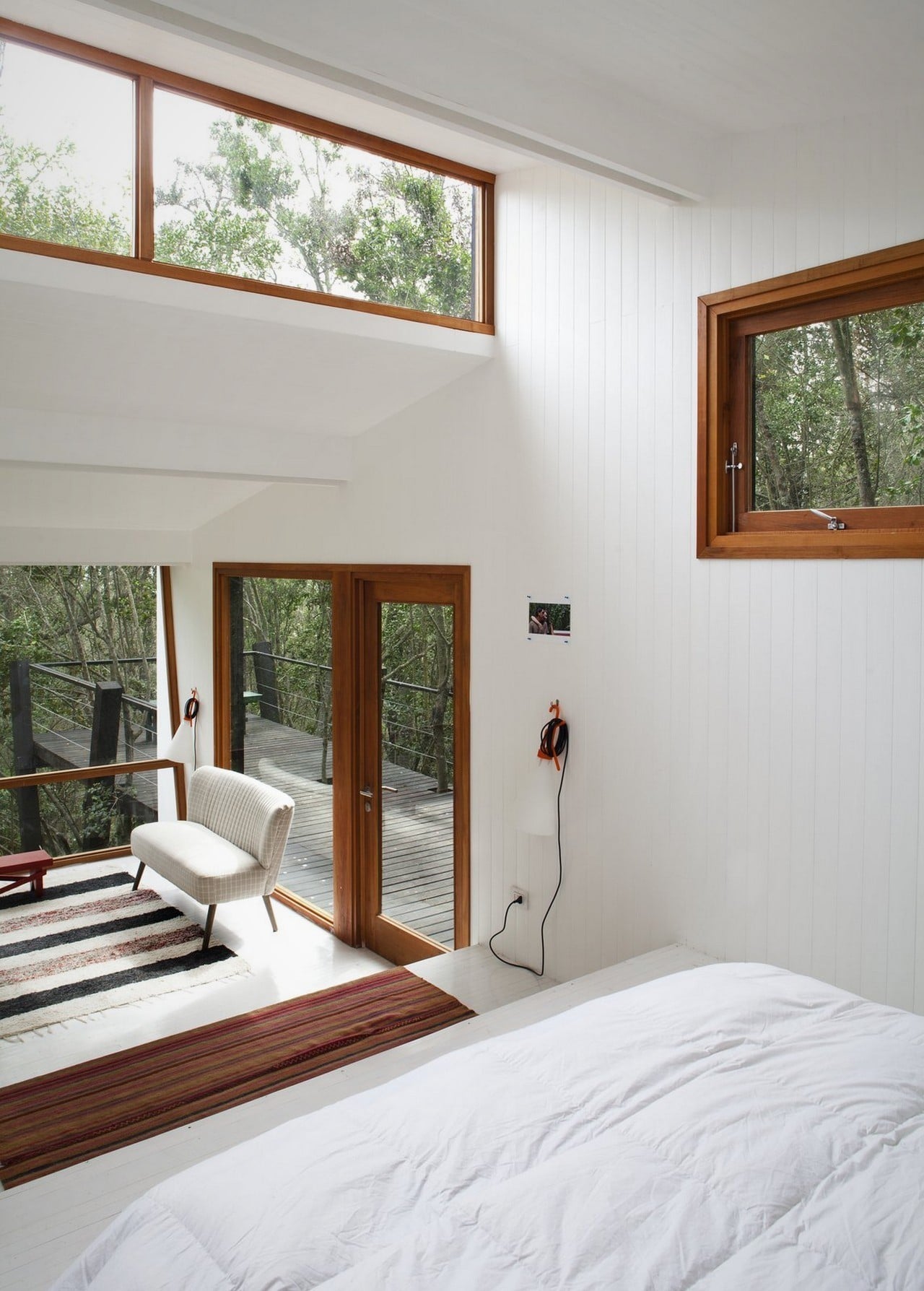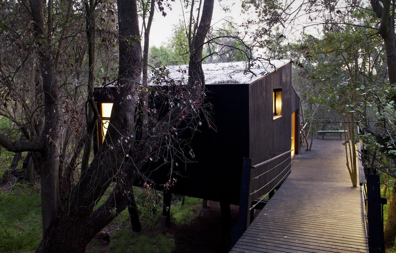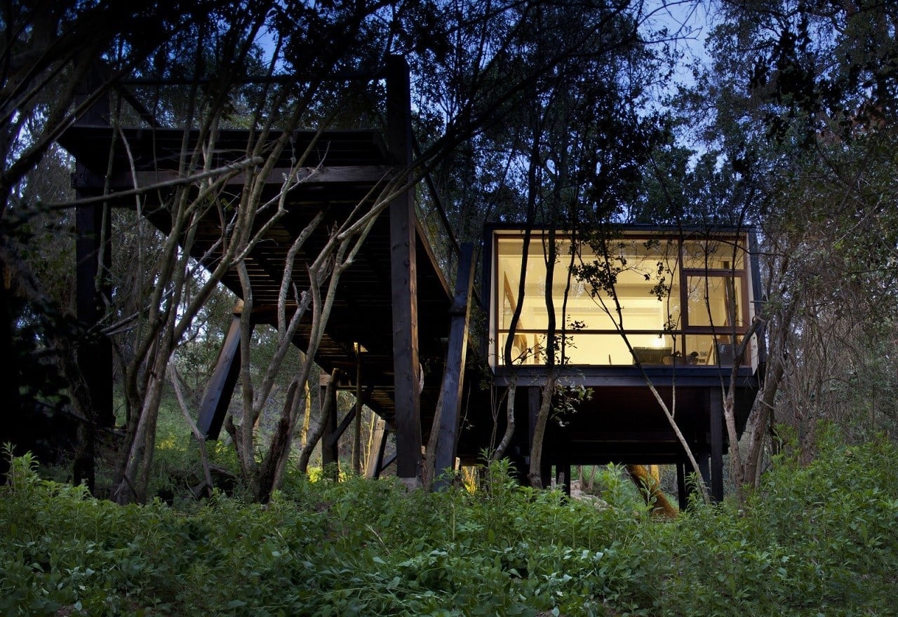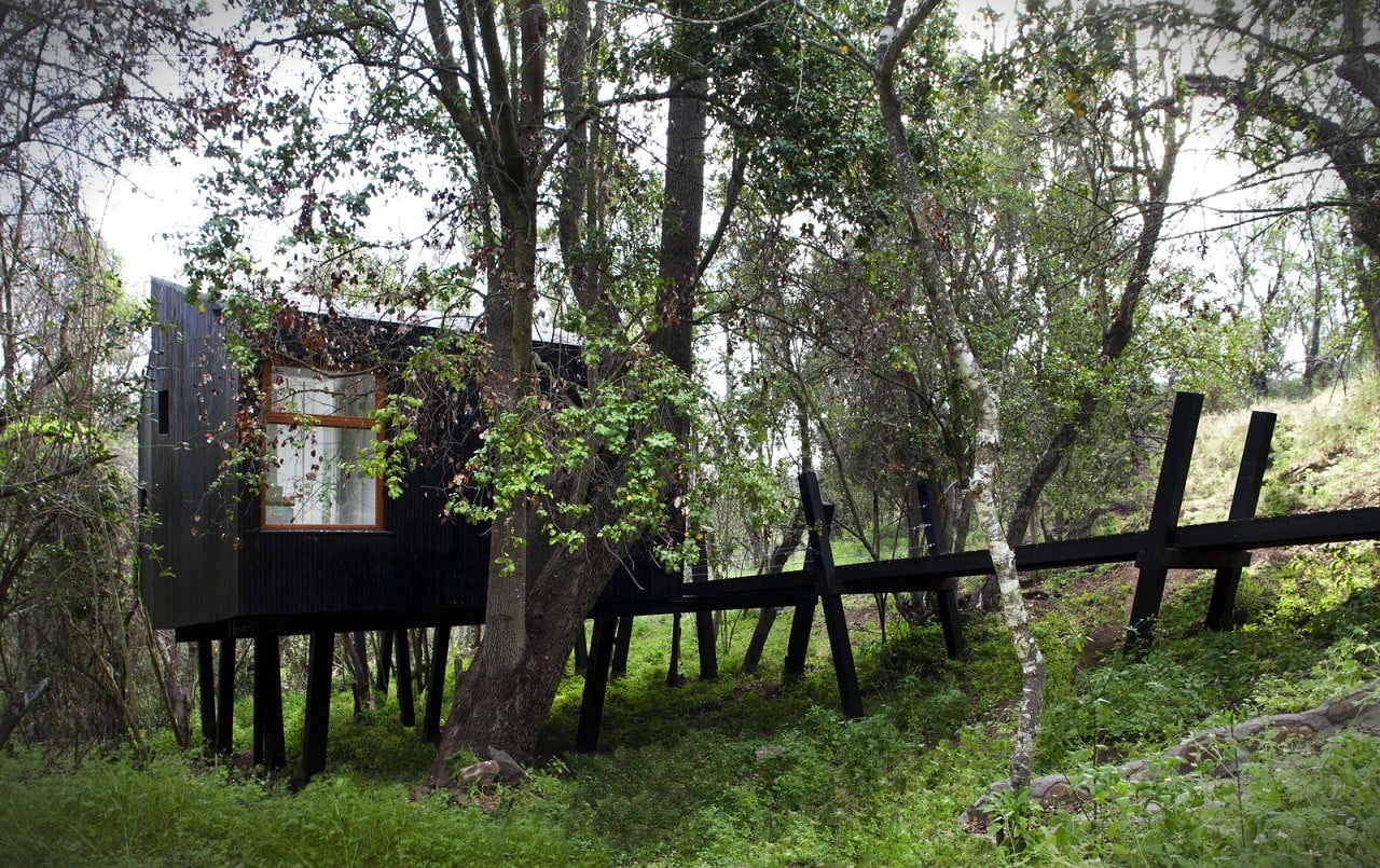 Set along a creek, close to Curacaví, Santiago (Chile), the Casa Quebrada is elevated on slanted poles and accessed via a bridge walkway with trees growing through its deck. From the inside, views to the middle of the surrounding trees offer a feeling of coziness and safety, just like being inside a bird’s nest.