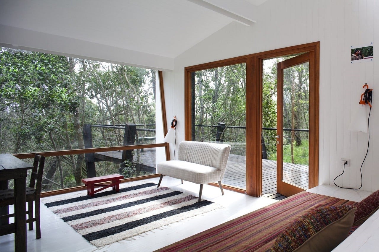 The 431 sq ft compact treehouse contains a living area, dining room, and kitchen in one section, while a second, smaller area includes the bedroom and bathroom. The interior has a crisp white interior that contrasts tastefully with the black-painted pine facade and the dark wood deck. From the living-dining lounge & kitchen, an extensive glass wall allows for natural lighting to penetrate and frames arresting views, connecting the inhabitants with the pristine forestal environment.