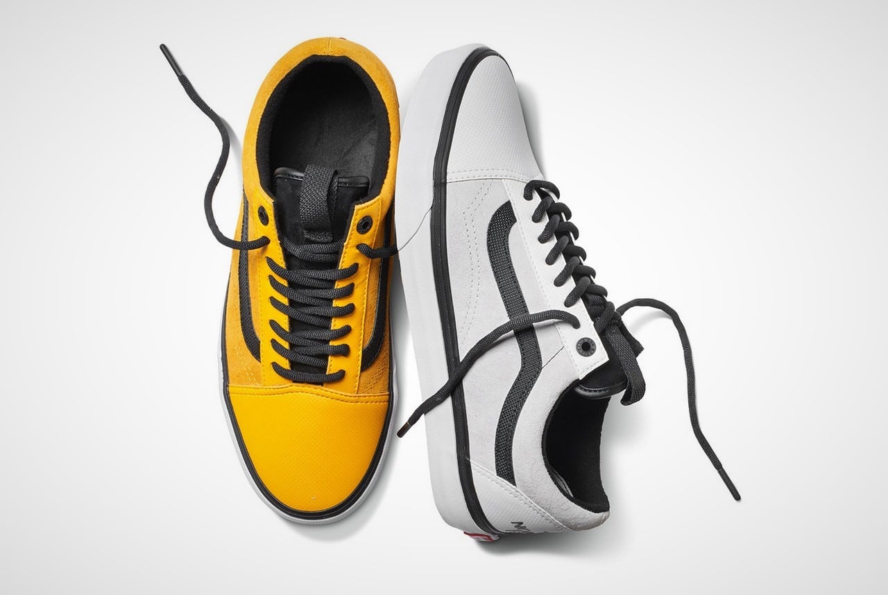 Featuring the proven Thermoball insulating technology, the Torrey Jacket also has lightweight synthetic PrimaLoft to keep the heat in under extreme winter conditions. The quilted jacket comes in colorways of red, black, and yellow with a co-branded embroidered patch on the front. Also included in this exclusive assortment, there are four variations on the Vans’ Sk8-Hi and Old Skool sneakers. All four versions feature custom eyelets, a checkerboard pattern lugged outsole, and branded by The North Face on the heel.