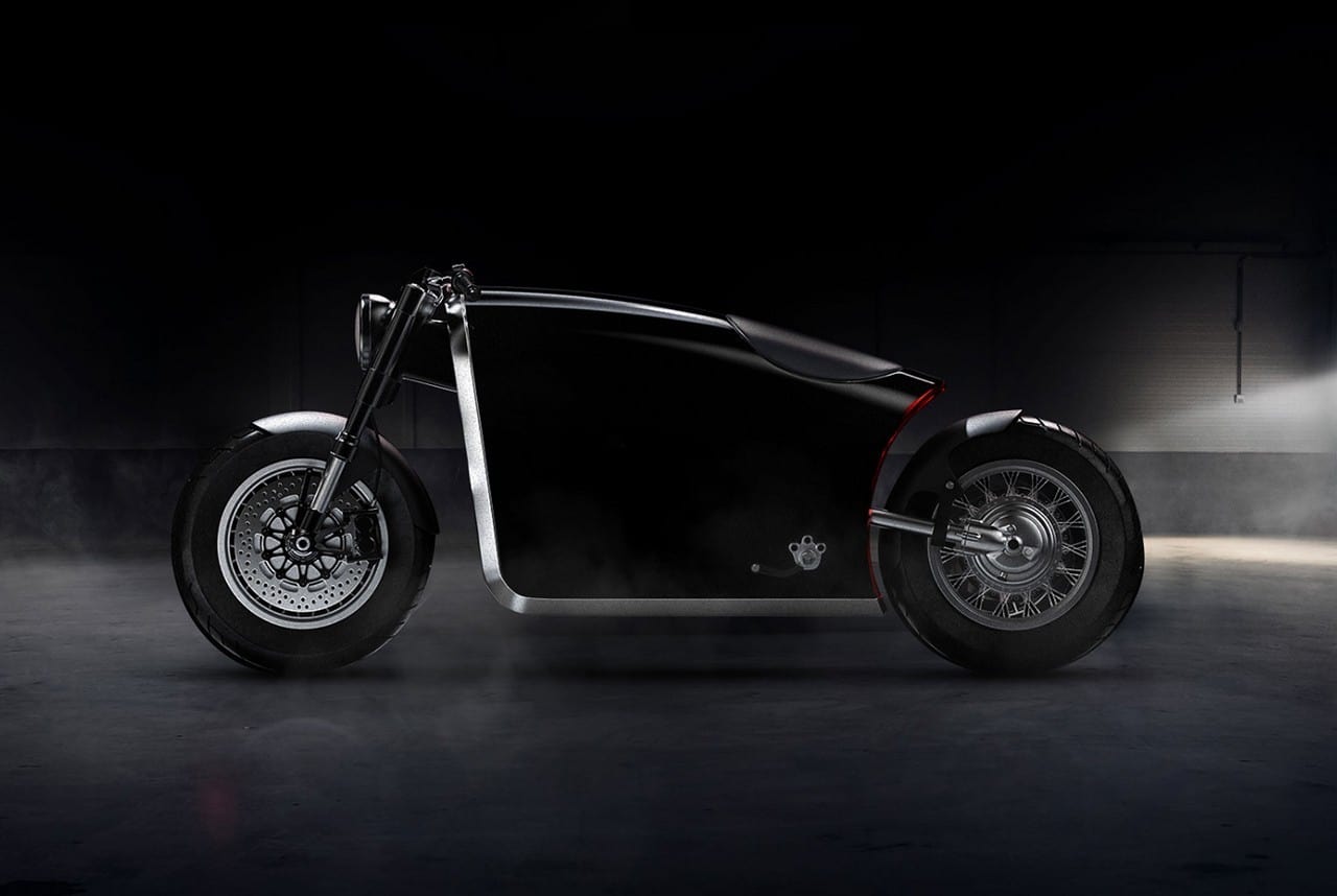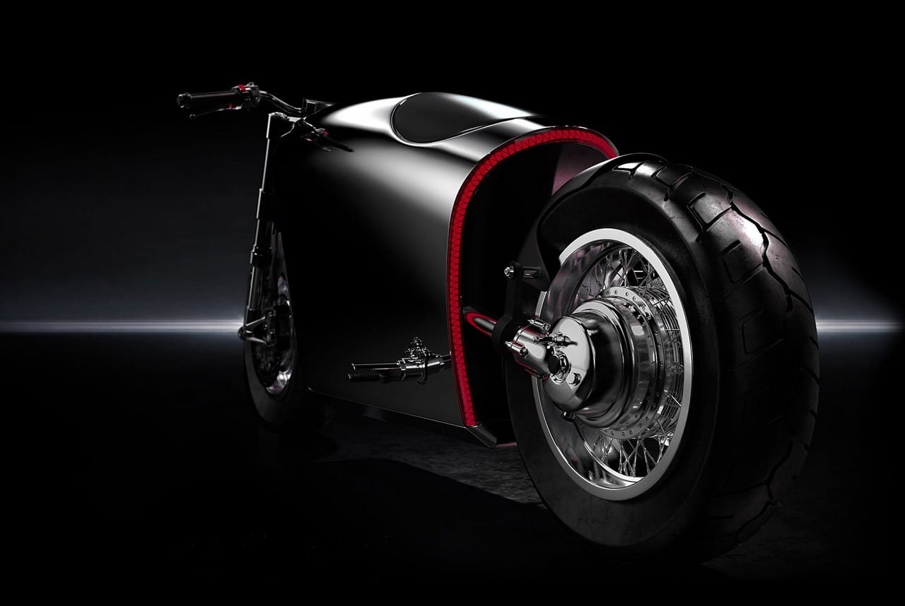 The monolithic steel shell can hold either a dual-drive electric engine or a 1400cc v-twin engine.
