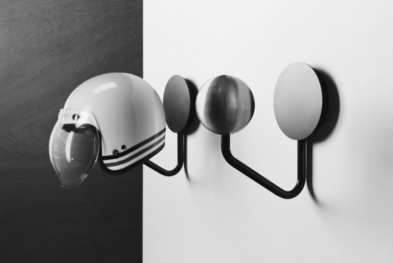 The minimalist rack has a circular base and a J hook pipe with a spherical brushed stainless steel sphere that besides looking super sleek, it also holds your brain bucket perfectly, without tearing and distorting its lining like traditional racks do. Proudly made in our city — Barcelona, Spain.