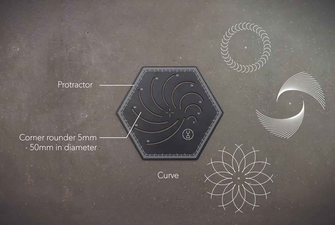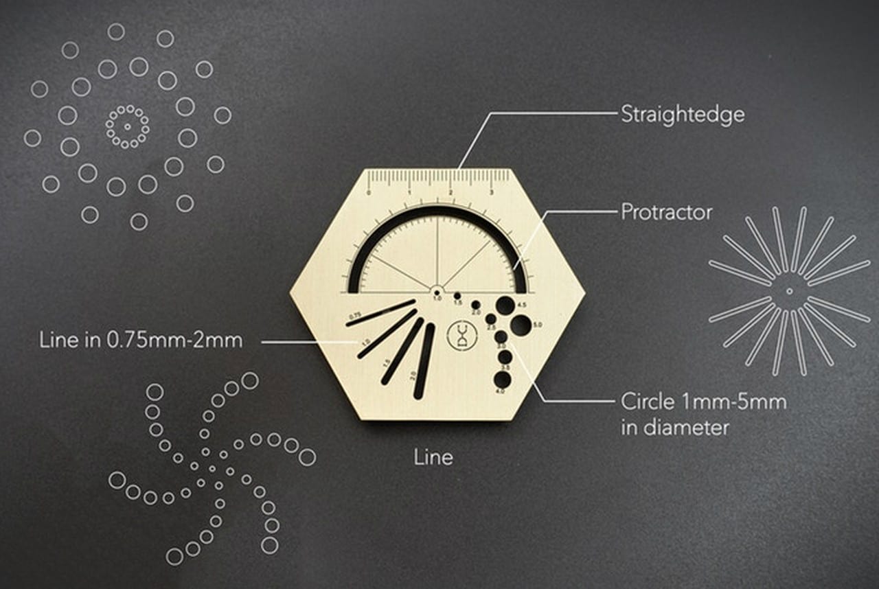 The compact tool is only 72x62mm and offers diverse, precise-etched multiple functions like a compass, protractor, template ruler, spirograph pattern and more. The hexagonal ruler is available in either matte black electroplated stainless steel with white painted graduations, or brass with black markings.