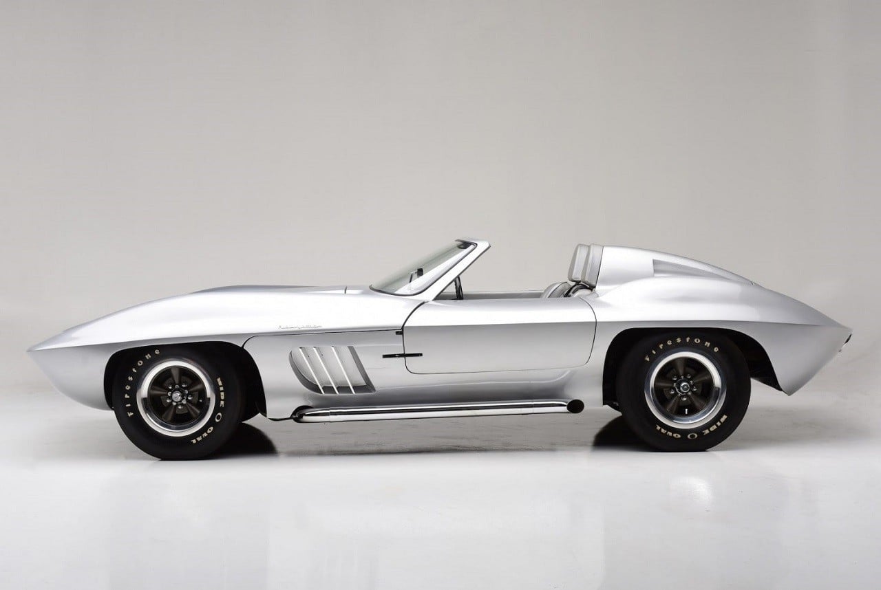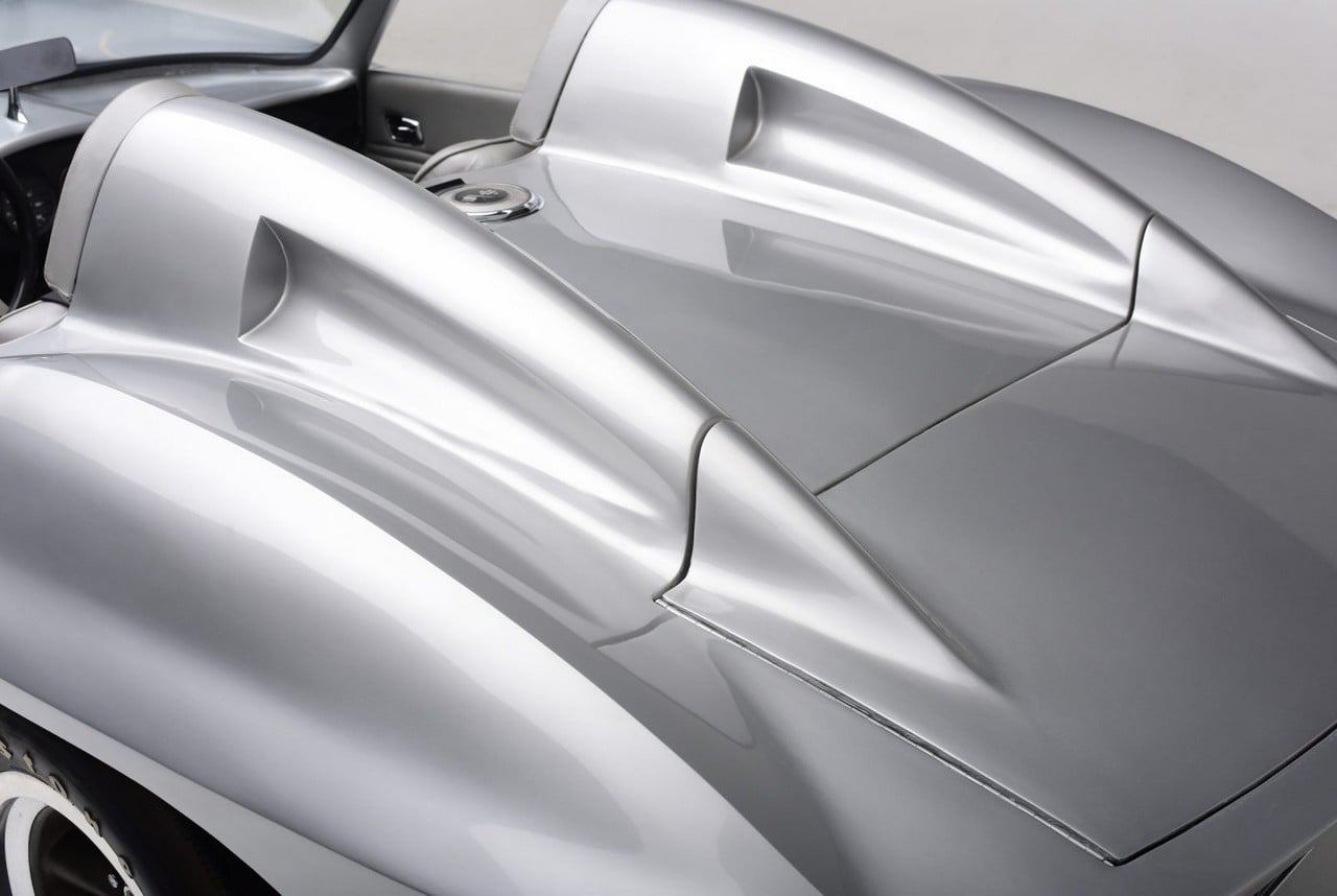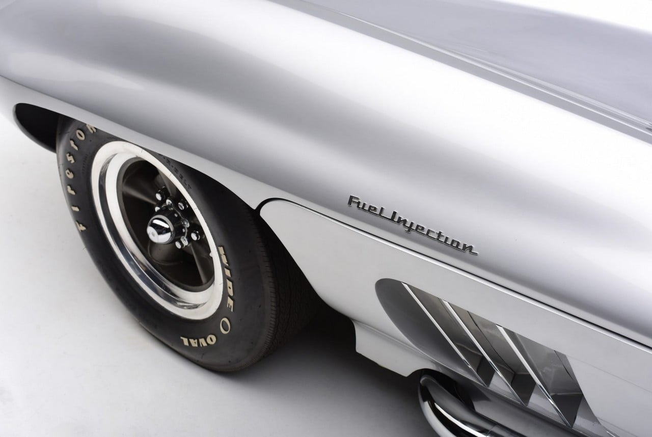 Recently restored and finished in striking Inca Silver, the car has shark gill pipes on the sides of the engine bay and dual headrest fairings on the rear deck, while the wheel arches are oversized with high sills. The interior has a massive tachometer and a speedometer mounted in the very middle. Power comes from a Rochester fuel-injected 283ci 8-cylinder engine with a 1962 Corvette 4-speed manual transmission.