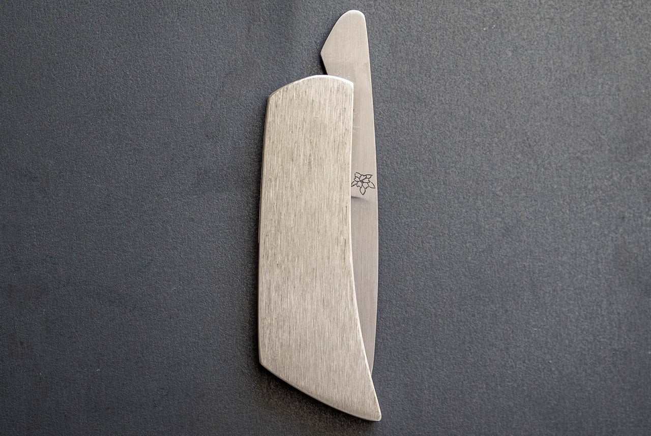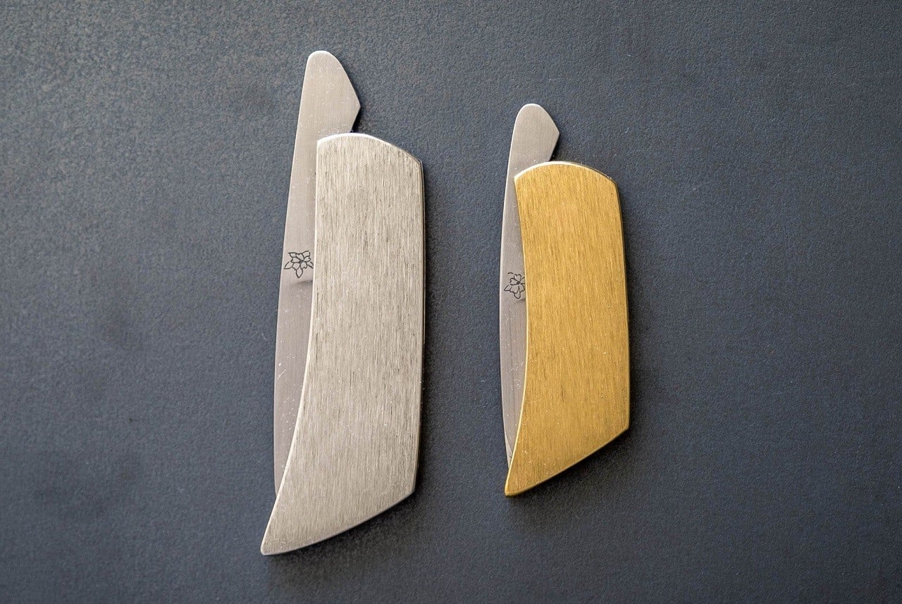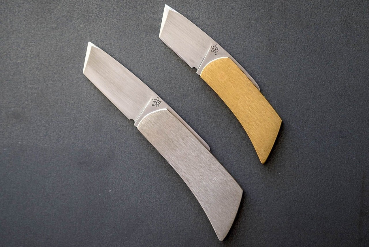 With a 1.7″ tanto-style blade made of sturdy DIN 100 MnCrW4 tool steel (60 HRC), the knife sports a hidden detent spring inside to prevent the blade from swinging loose. The handles and pivots are stainless steel, the washers are phosphor bronze, and the gently curved design offers a comfortable in-hand feel while still being very pocketable & easy to carry.