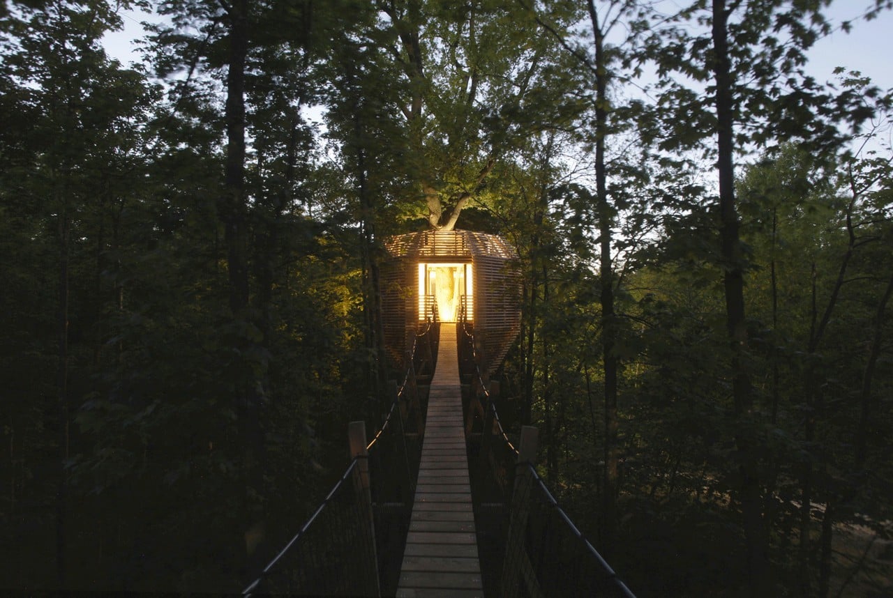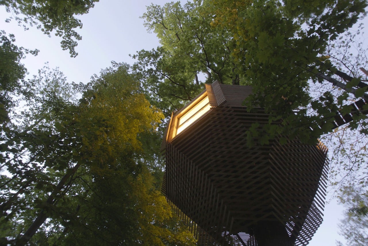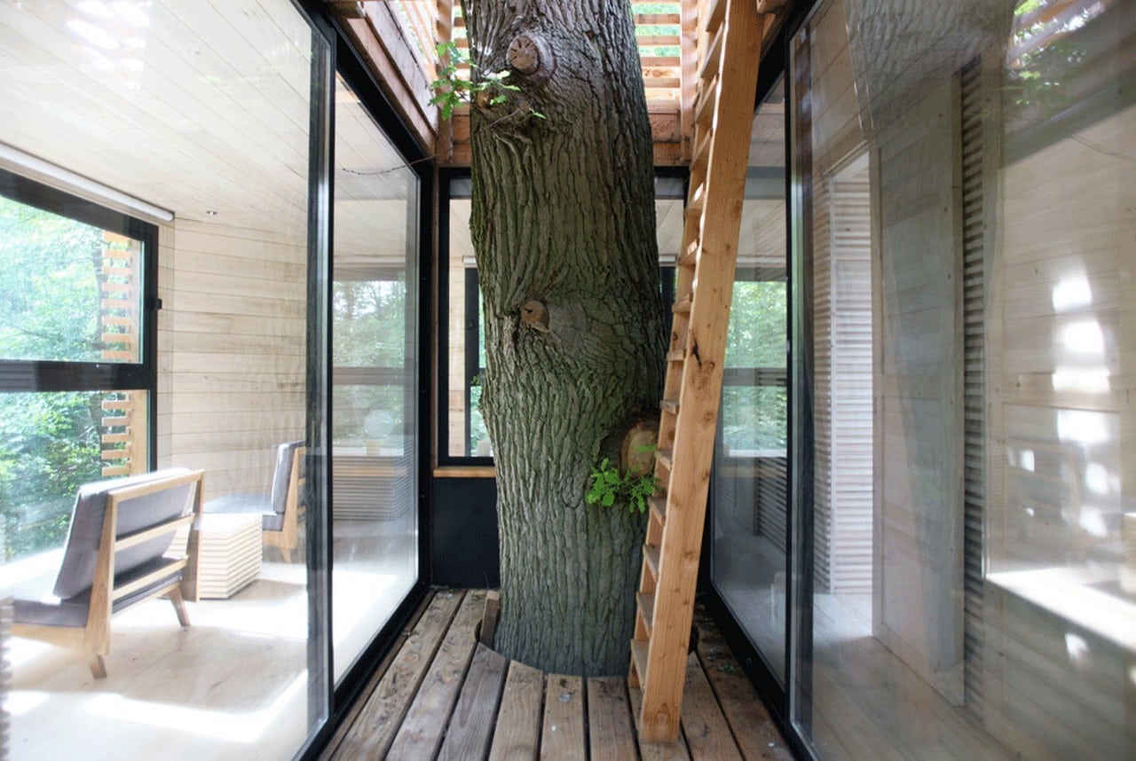 Constructed around a 100-year-old oak tree in Raray, France, the Origin Treehouse was created as a functional and comfortable hotel room that offers an intimate connection with nature and stunning treetop views.