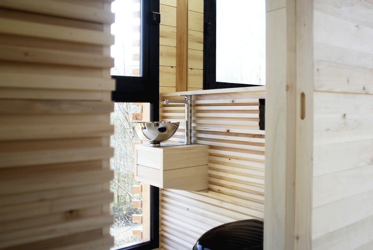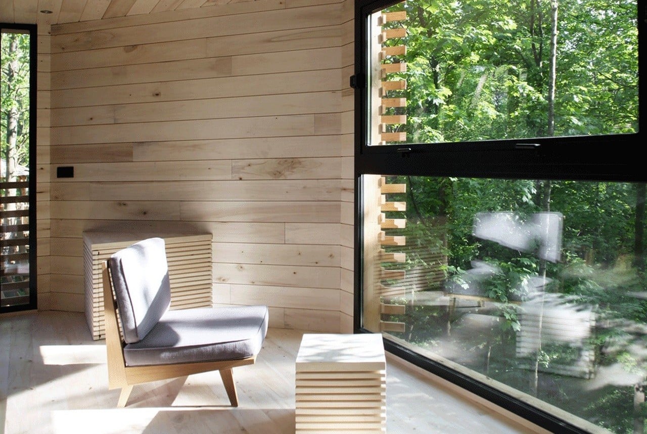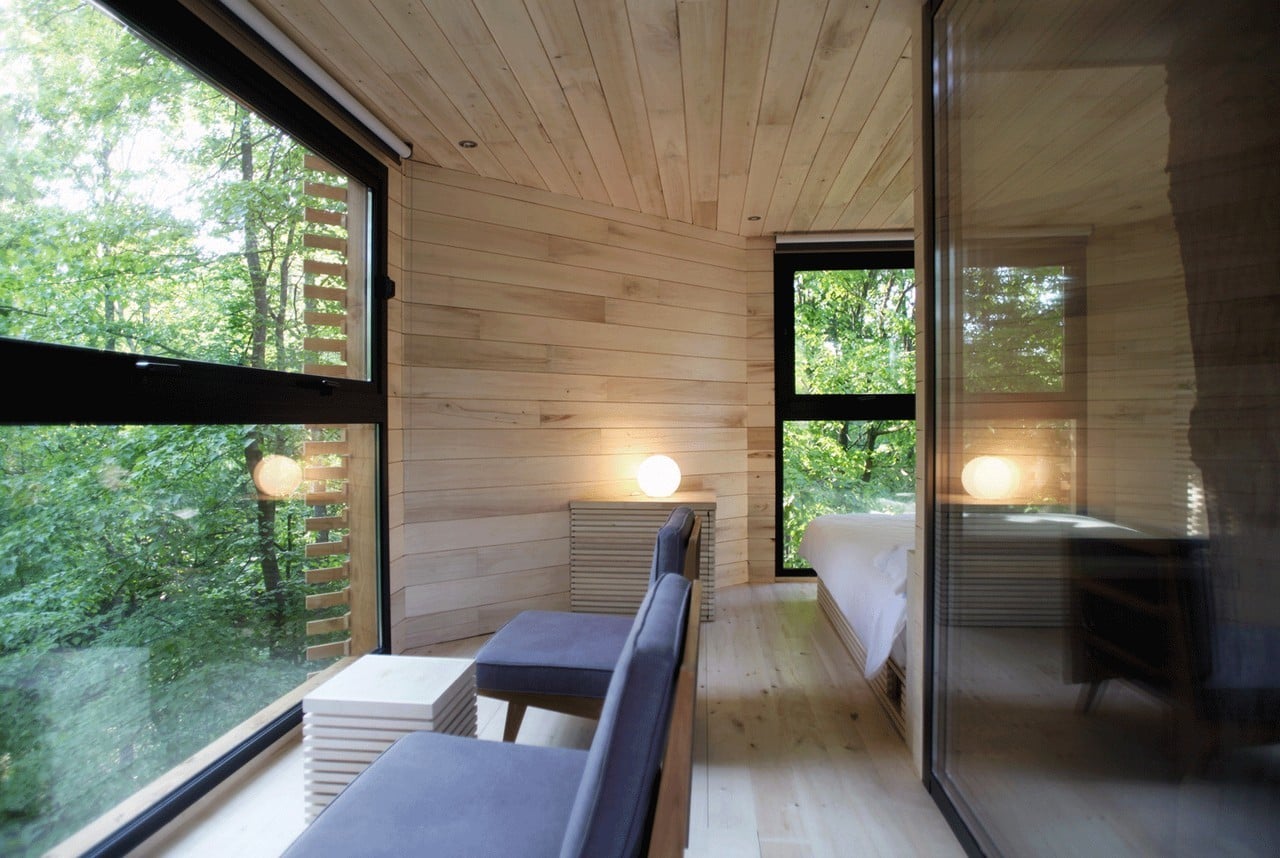 The timber-clad interior has inbuilt wooden furniture and large glass panels and features a lounge area, double bedroom, dressing room, fully equipped bathroom, and a rooftop terrace with 360-degree vistas across the dense forest.