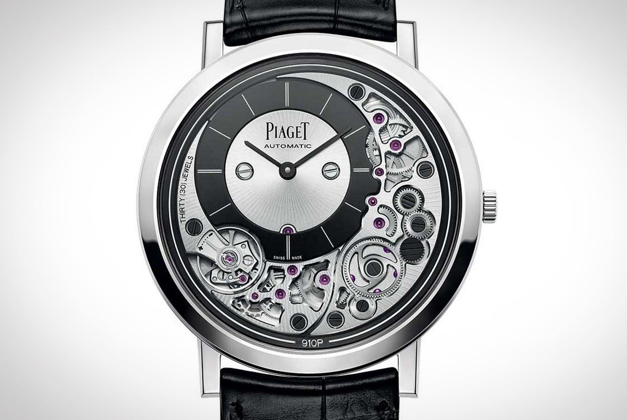 With the thickness of a nickel (just 2mm), the Piaget Altiplano Ultimate Concept is the world’s thinnest self-winding watch. Its unconventional design uses a 41mm-wide case that doubles as the foundation for the movement.