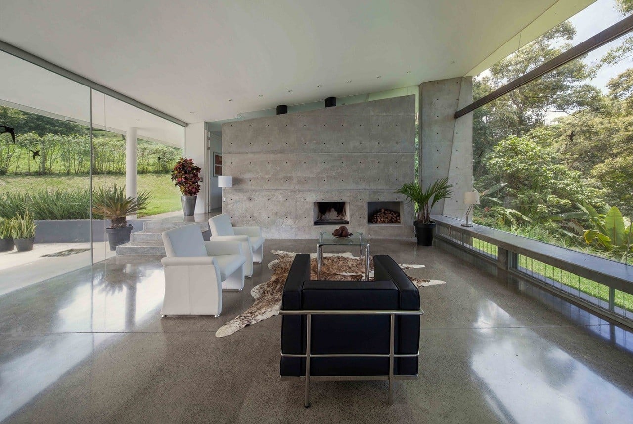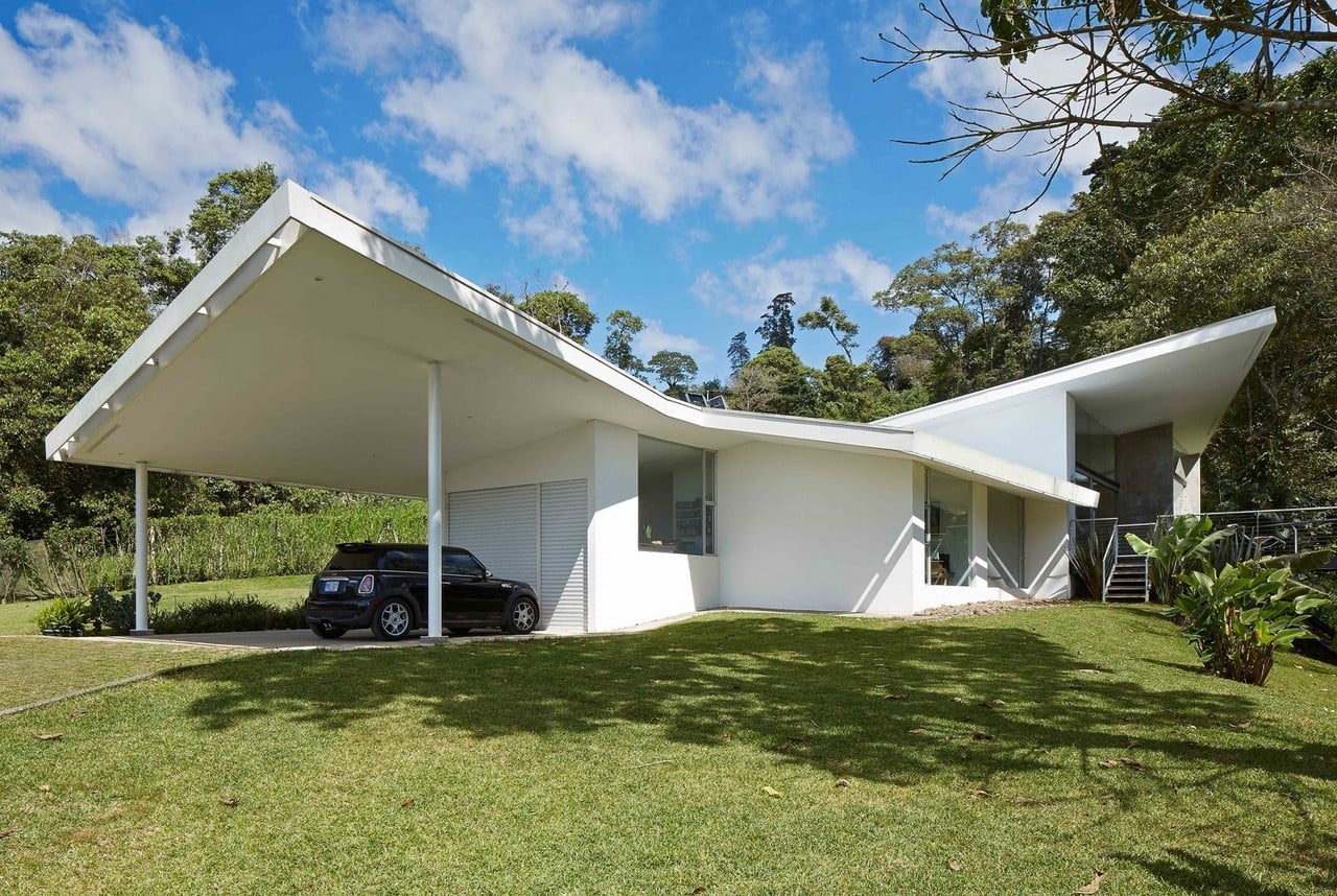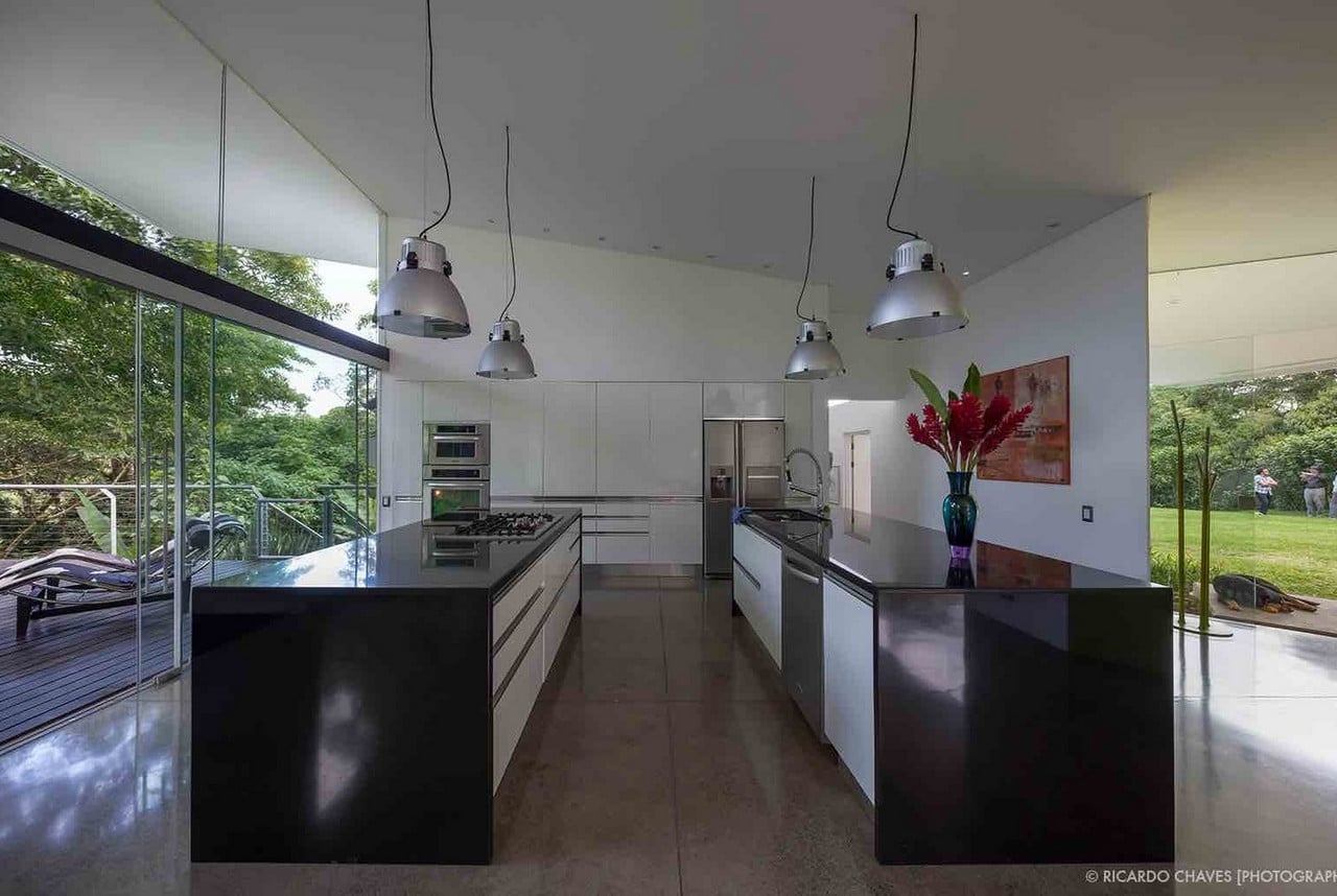 Constructed in an elongated shape, the abode offers arresting views of the lush forested environment, from each of its areas. The spaces inside include an ample social area with dining room and living room, a large kitchen, the parents’ bedroom on one end and the children’s bedrooms on the other end. The focal point (and the most frequented space of the house) is the terrace which is accessed through sliding glass, connecting the inhabitants to the magnificent outdoors and the old Yos tree.
