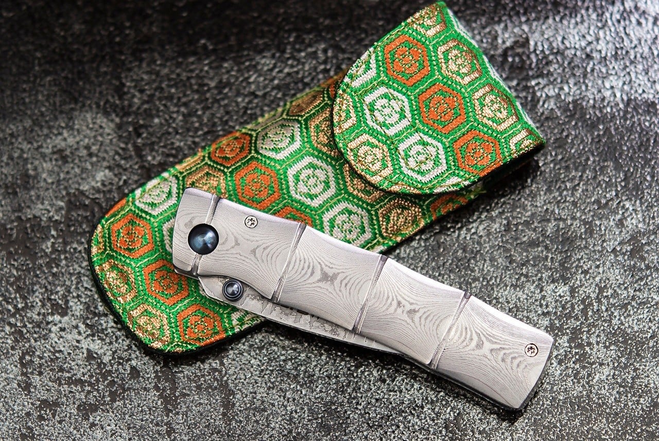 Fitted with an ambidextrous, one hand opening mechanism with liner lock, each Take folder comes with a decorative woven Nishijin pouch.