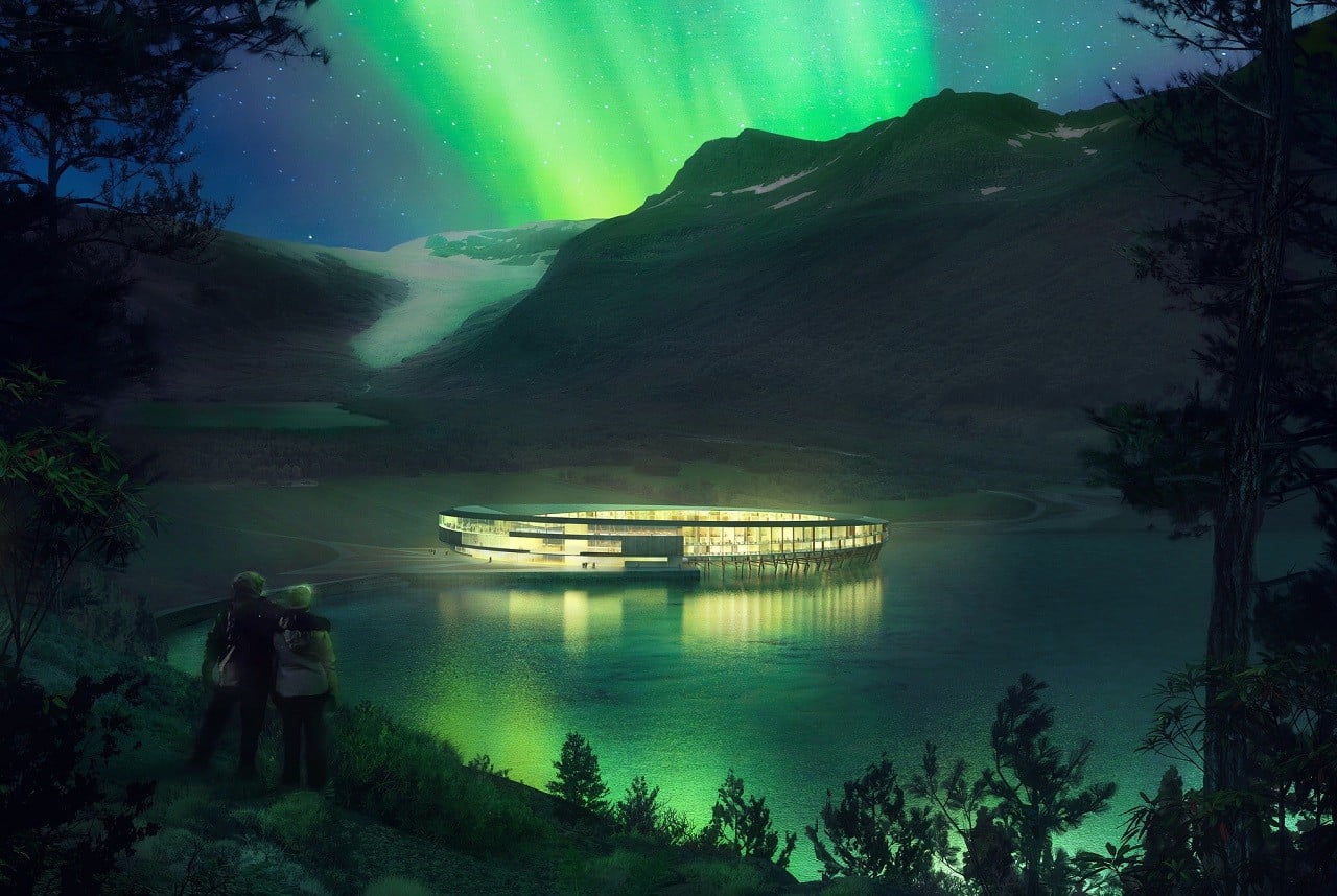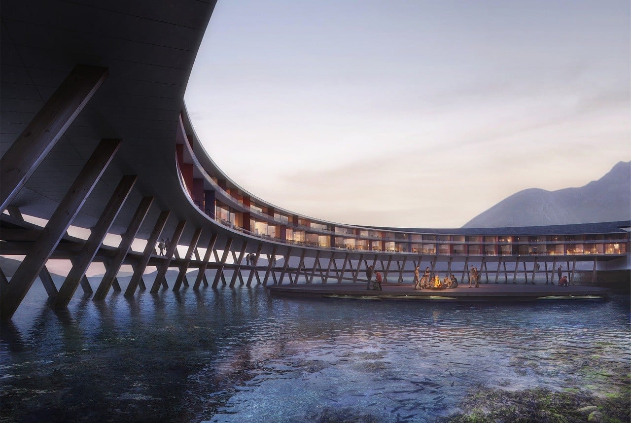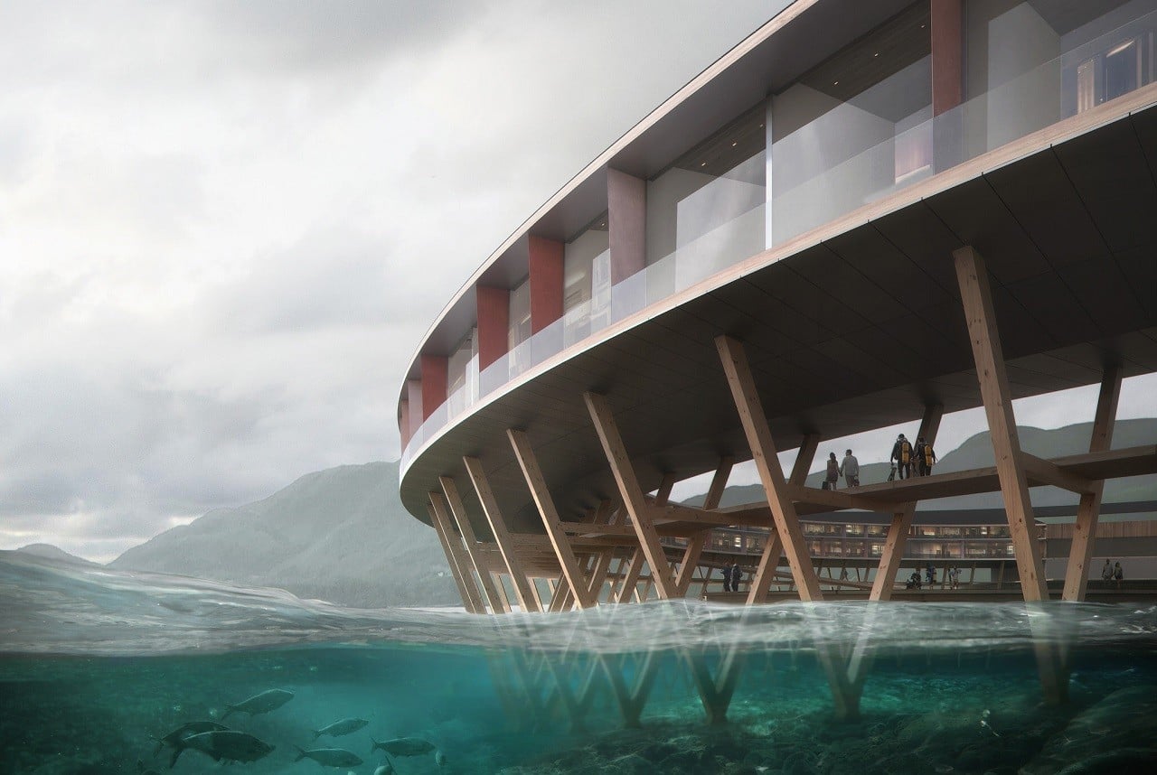 The sustainable building is designed to leave a minimal environmental footprint on its pristine surroundings. Its circular body extends from the shoreline into the clear waters and provides 360-degree views of the fjord, while the supporting structure, built from weather-resistant wooden poles, stretches several feet below the surface of the fjord.