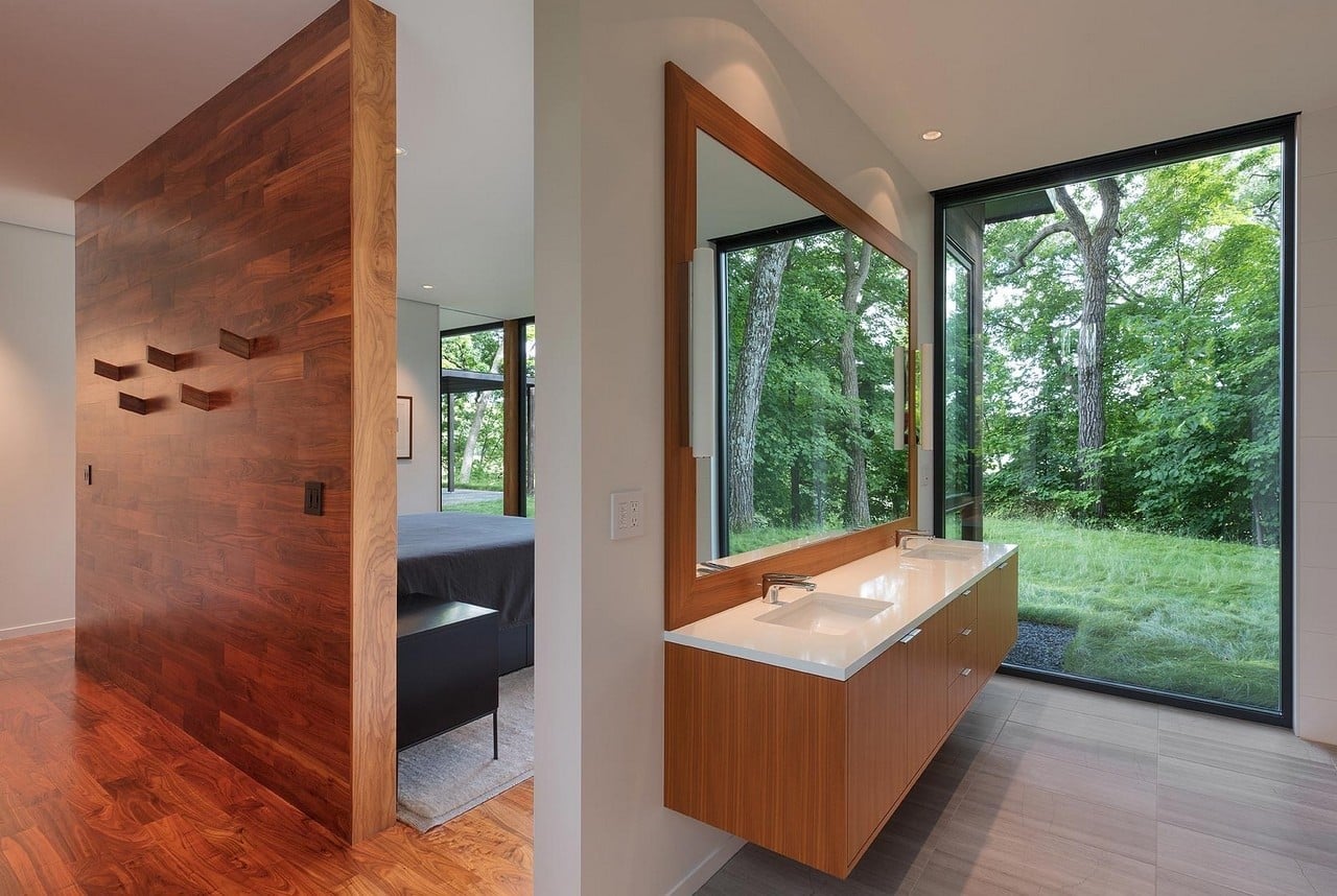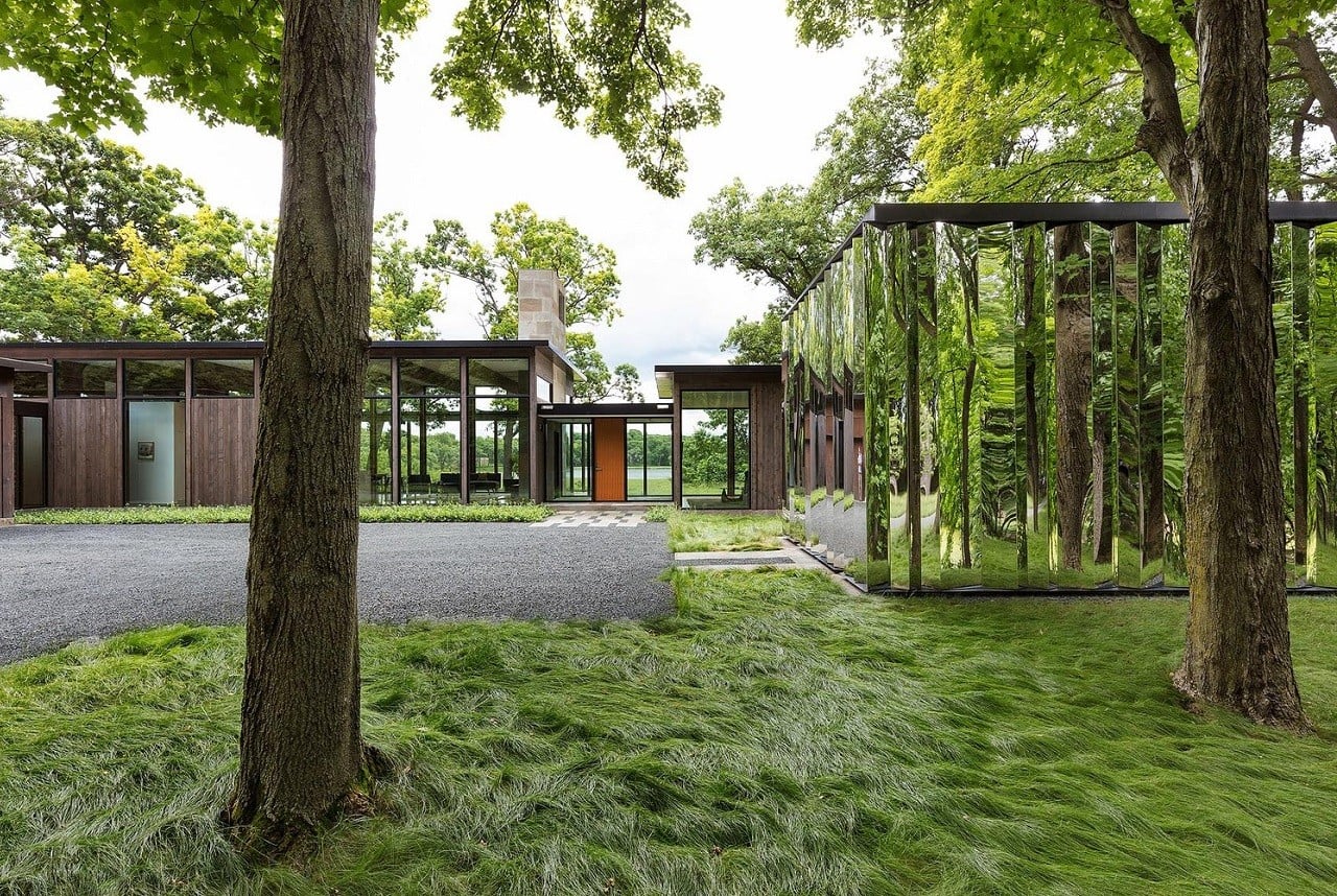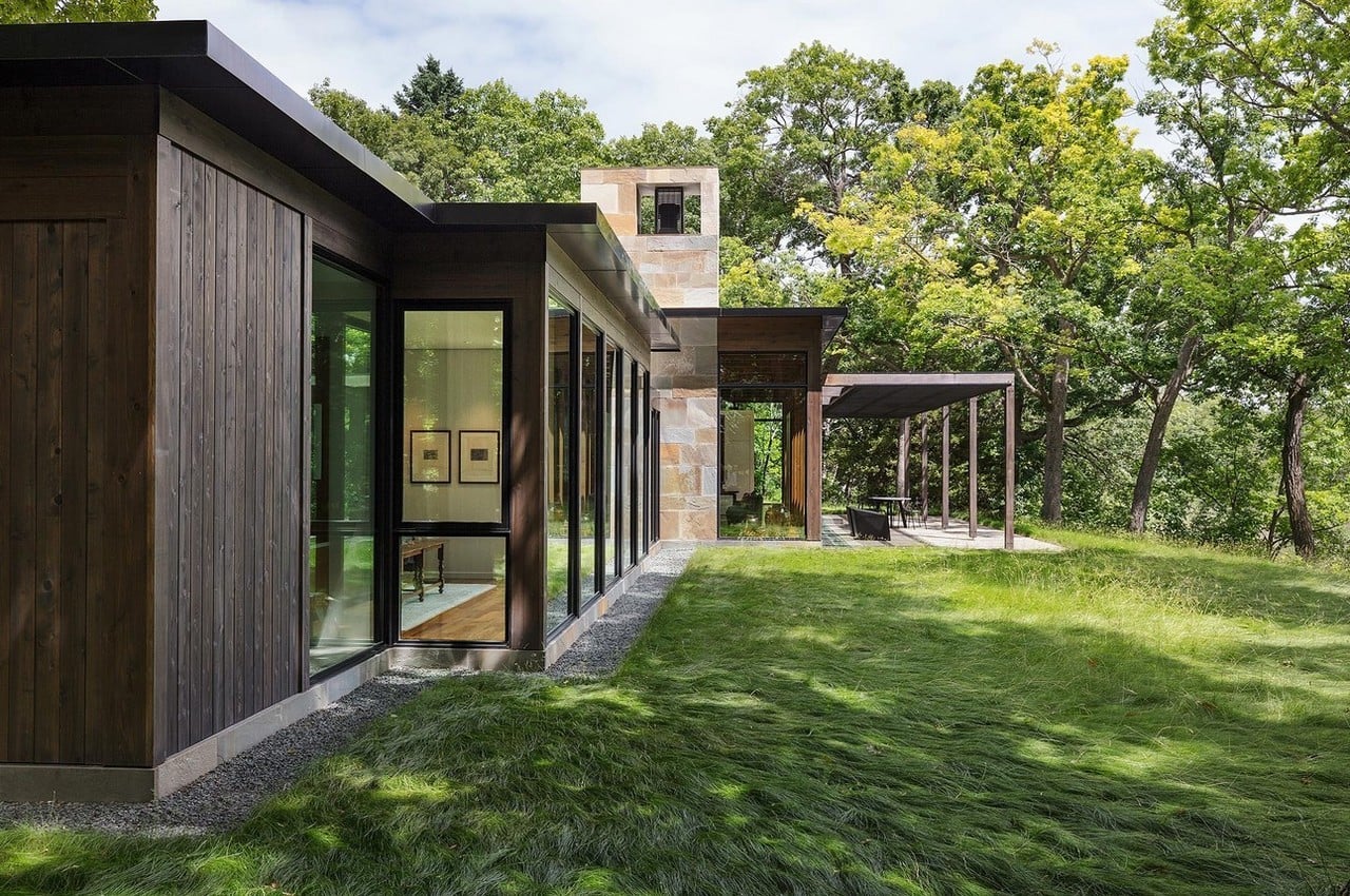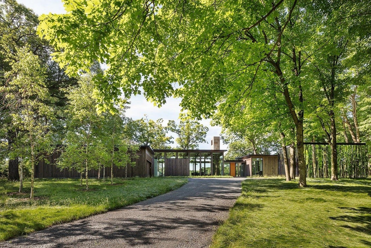 Placed on a wooded plateau in Woodland, Minnesota, the residence overlooks a wetland and Lake Minnetonka beyond. The construction is laid out as a single-level and is formed by three cedar wood wings that are connected by large glass entry links. The dark-stained exterior makes the dwelling blend in with the nearby trees while a separate shiny storage shed adds a counterpoint to the house and seems to dissolve into the woods by flashing fragmented reflections of the surroundings.