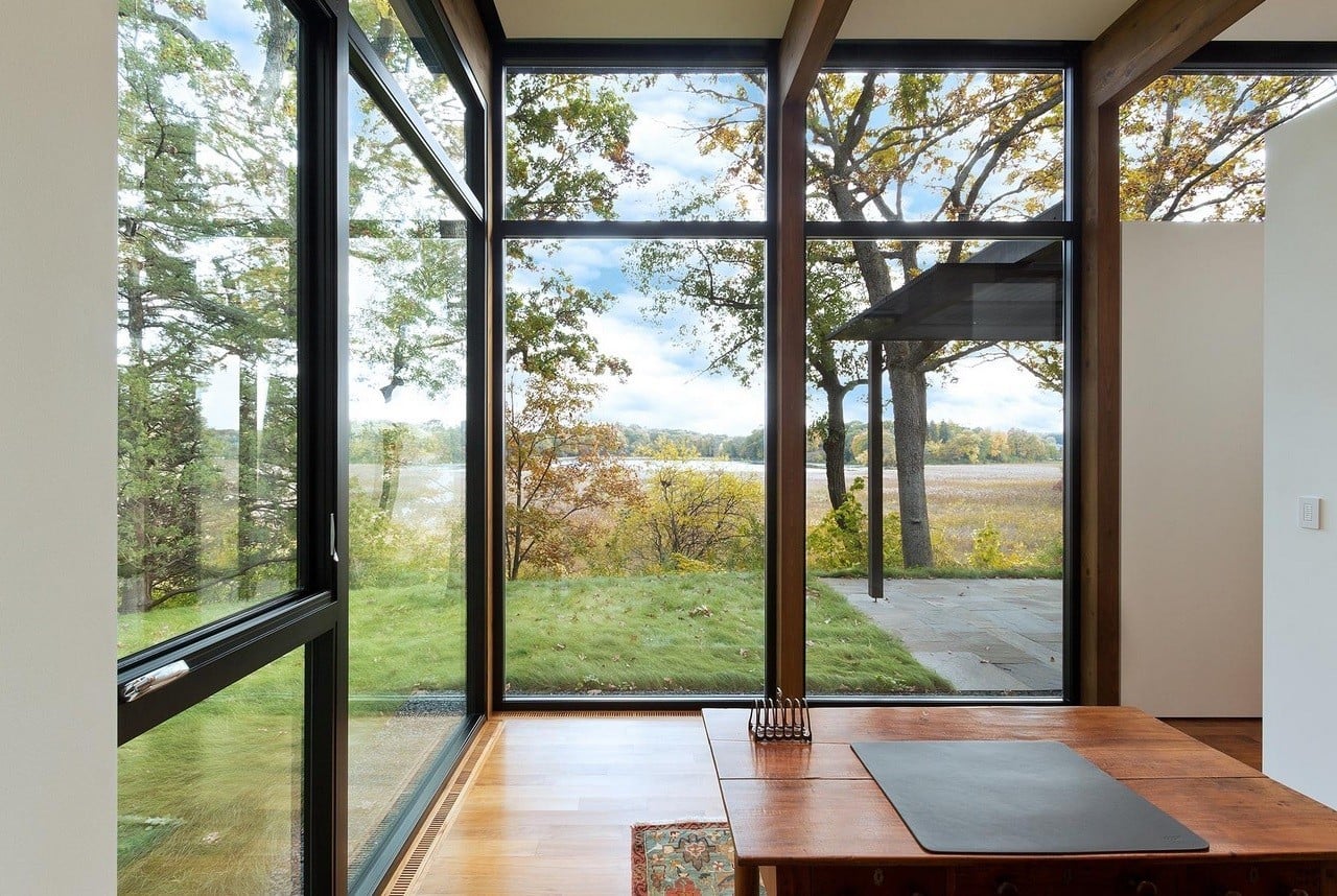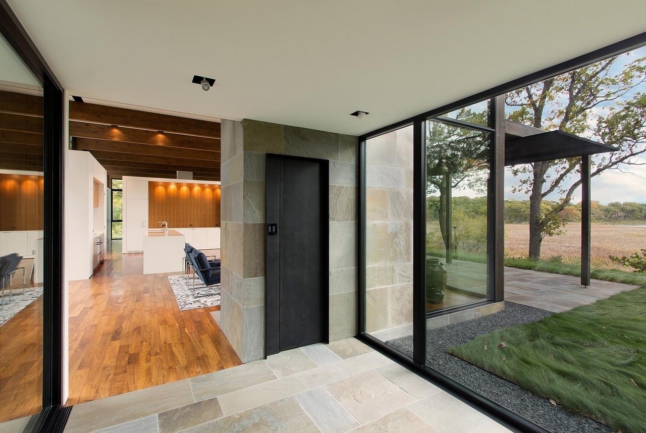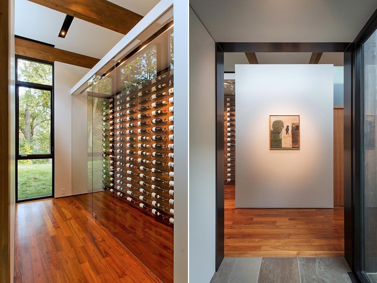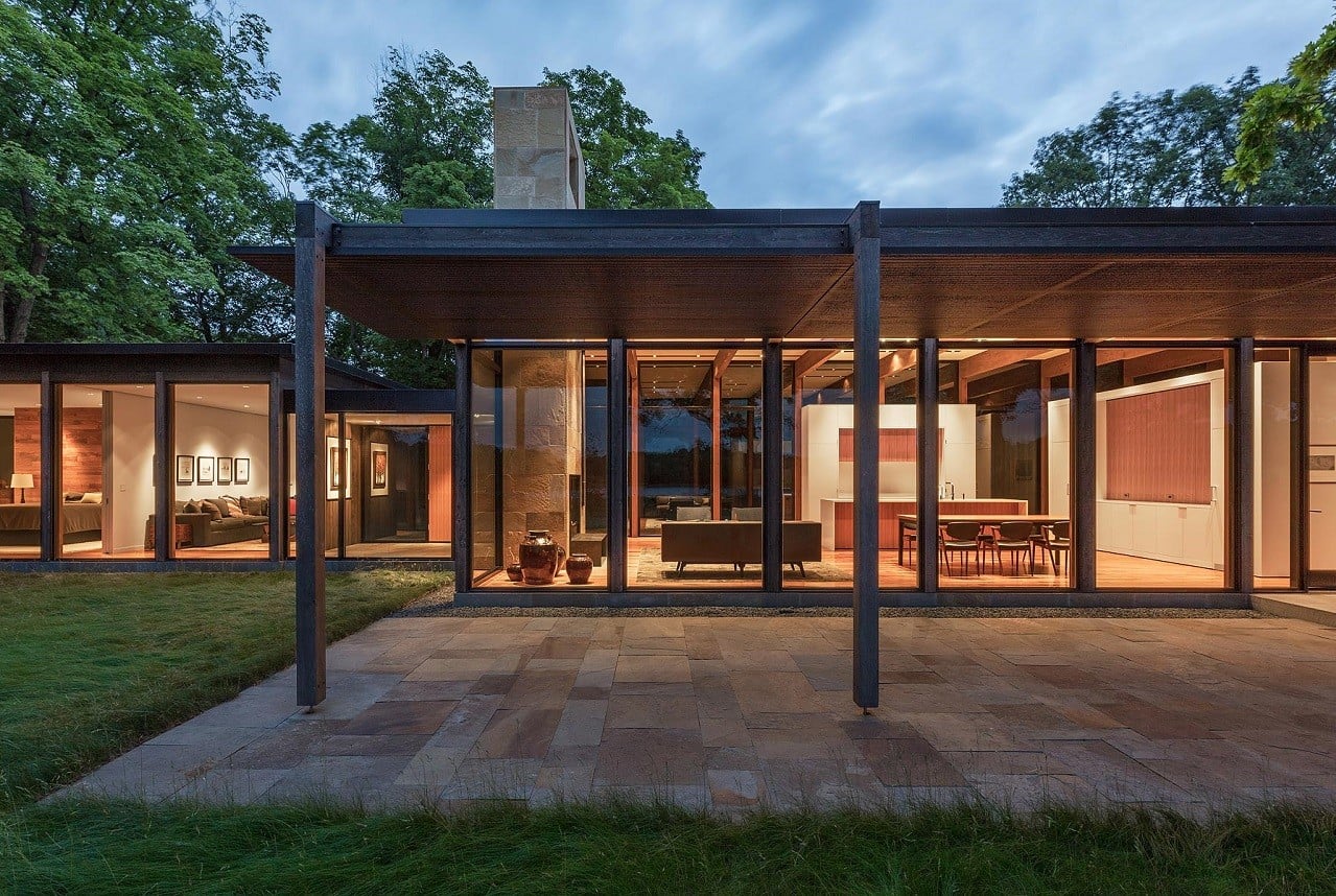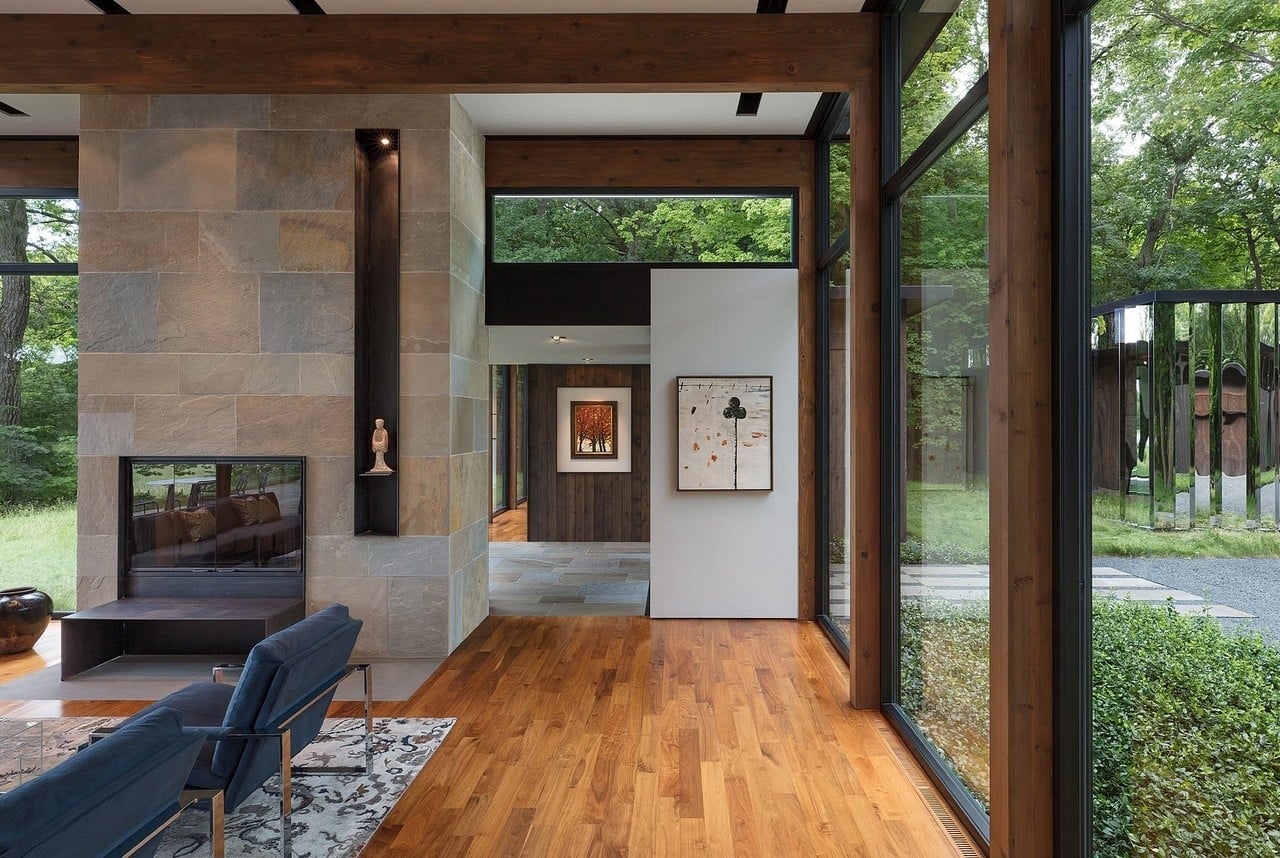 Placed on a wooded plateau in Woodland, Minnesota, the residence overlooks a wetland and Lake Minnetonka beyond. The construction is laid out as a single-level and is formed by three cedar wood wings that are connected by large glass entry links. The dark-stained exterior makes the dwelling blend in with the nearby trees while a separate shiny storage shed adds a counterpoint to the house and seems to dissolve into the woods by flashing fragmented reflections of the surroundings.