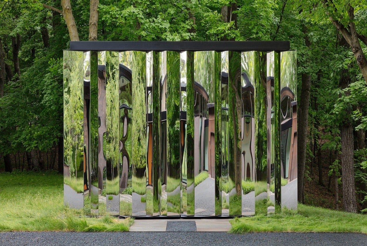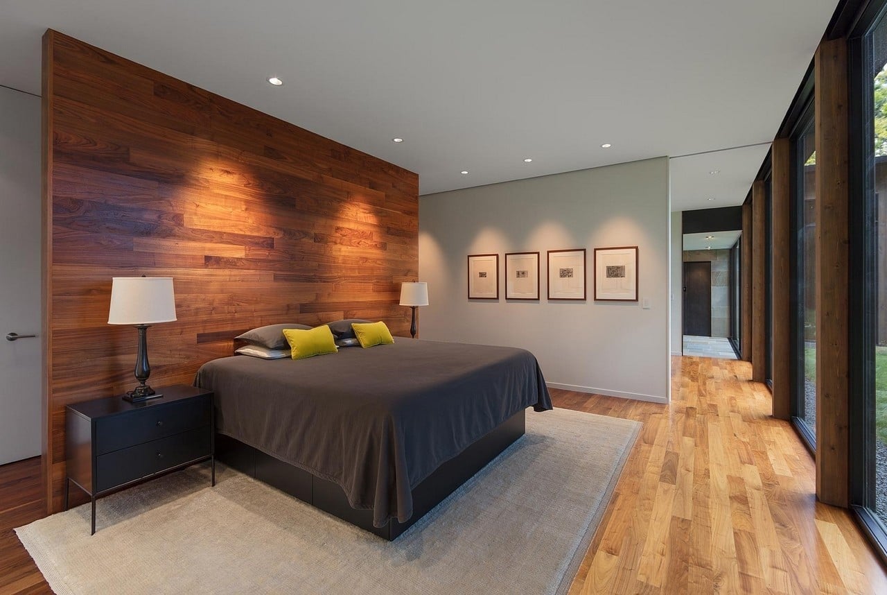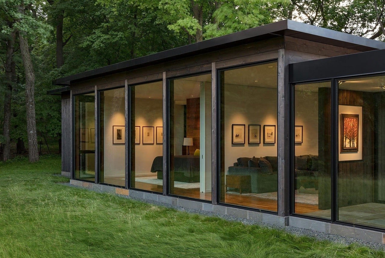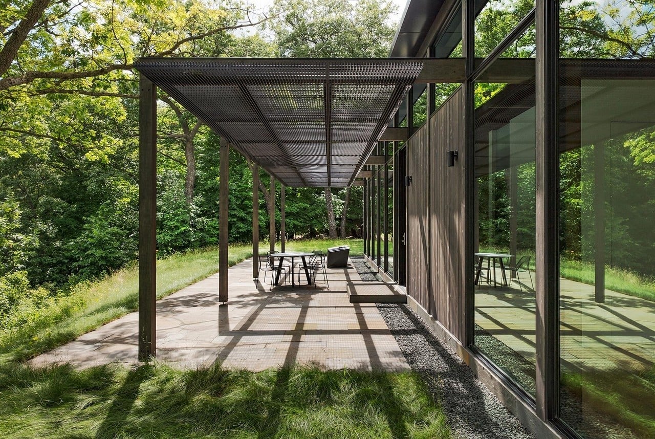 Placed on a wooded plateau in Woodland, Minnesota, the residence overlooks a wetland and Lake Minnetonka beyond. The construction is laid out as a single-level and is formed by three cedar wood wings that are connected by large glass entry links. The dark-stained exterior makes the dwelling blend in with the nearby trees while a separate shiny storage shed adds a counterpoint to the house and seems to dissolve into the woods by flashing fragmented reflections of the surroundings.