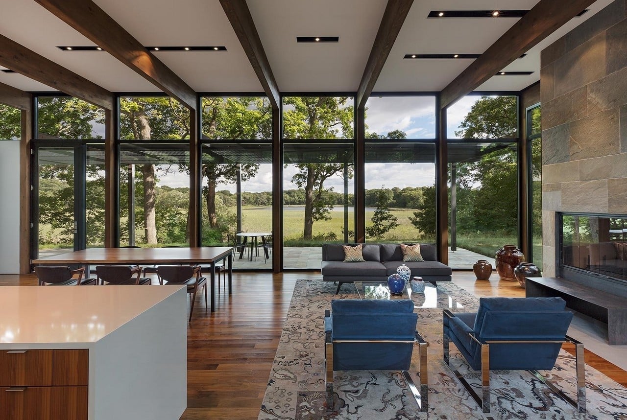 Inside, you’re welcomed by an uncluttered living space, warmed by a generously-sized bluestone fireplace. Walnut flooring and exposed wood beams grant a comfy, raw character to the interior, which is a hushed contemplation point for the dynamic external landscape.