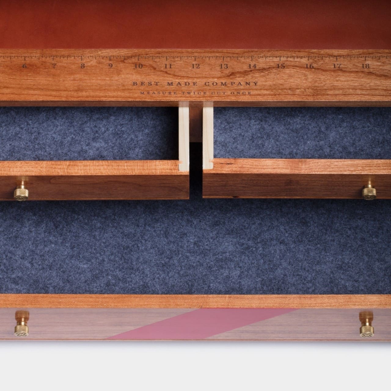 The exquisite piece is emblazoned with Best Made’s classic motifs – a red sash and laser-etched BMC ruler.