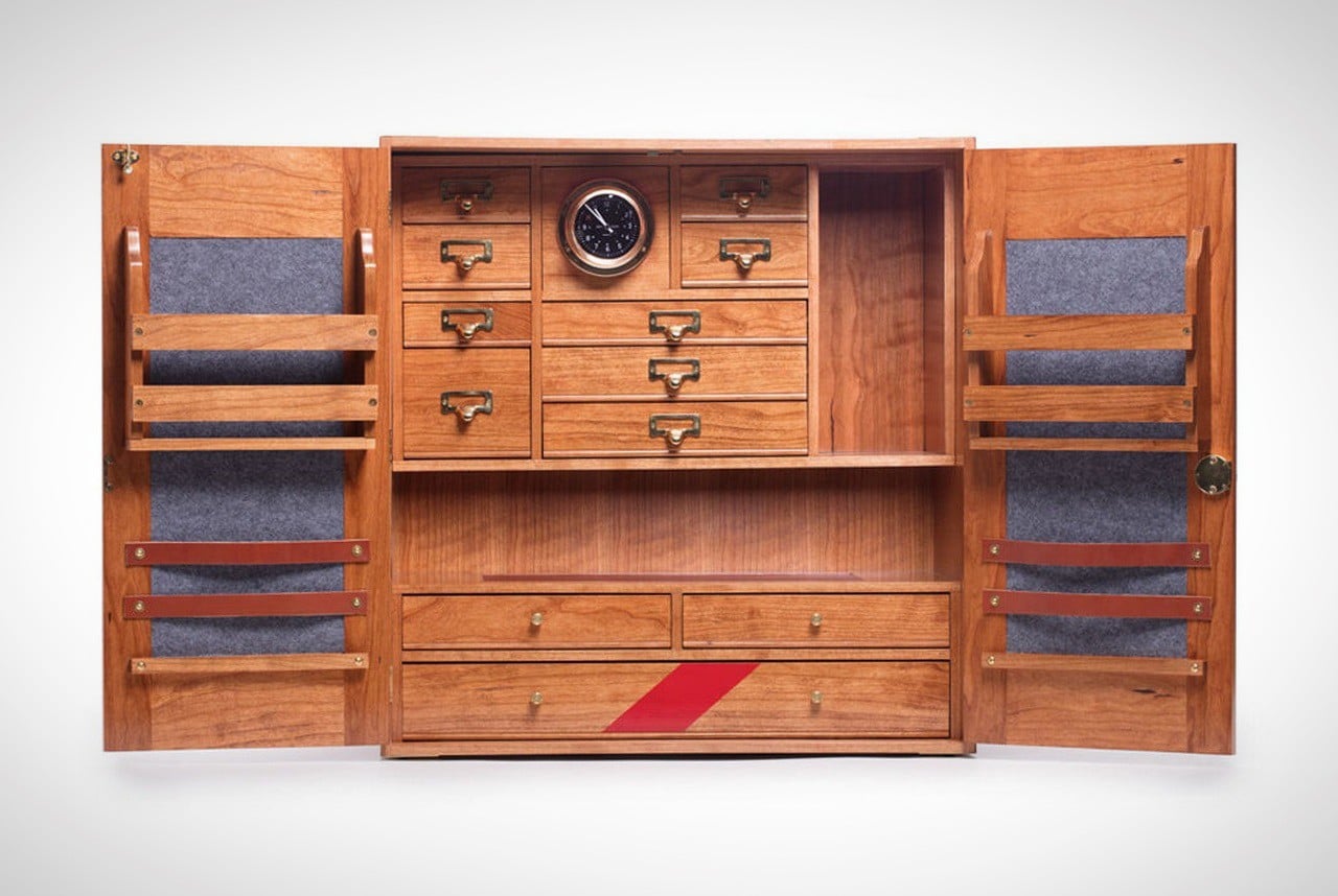 Built by the venerated Gerstner & Sons in Dayton, Ohio, the impeccable chest is made from American cherry with hand-fitted joinery, brass hardware, and 6-oz. leather details. It features 12 uniquely sized drawers (some with knurled brass knobs, while the others have library pulls with card slots), a book cubby, storage inside the doors, a custom-made German centerpiece clock, and a secret compartment behind the back paneling.