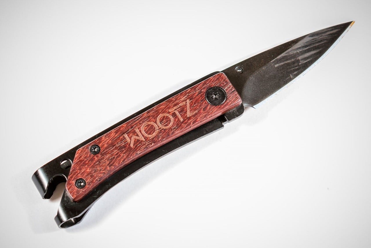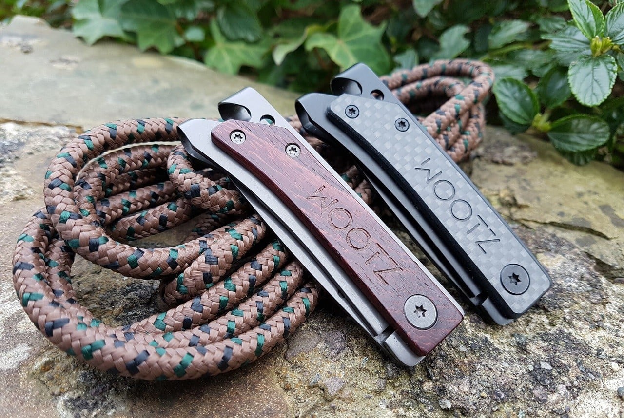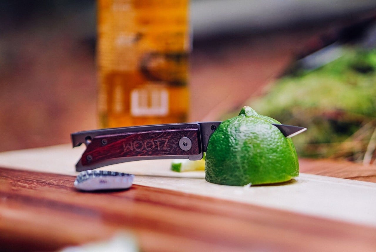 Constructed of tough high-carbon 440C stainless steel, the tool includes a razor-sharp & rust-proof folding blade, bottle opener, a hole for split rings, and a side clip that can be attached to a belt or pocket, or used as a money clip. The light tool can be smoothly operated with one hand, and handles the most common camp functions, including whittling wood, cutting, fastening screws, and of course, opening beers. Available in 6 styles, with micarta, carbon fiber or hardwood handles, in gray, black or titanium coating.