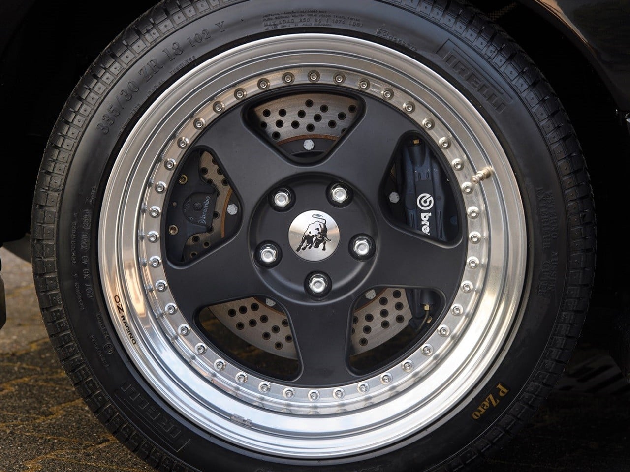 Other details include a carbon fiber front air dam with large brake ducts, huge air extractor in the front luggage compartment lid, widened fenders, rear carbon fiber diffuser & spoiler, ram air duct protruding above the roof, and special 3-piece OZ wheels. Diablo GT’s stripped-down interior has carbon fiber panels and race-spec bucket seats with 4-point seatbelt harnesses, and probably smells like victory!