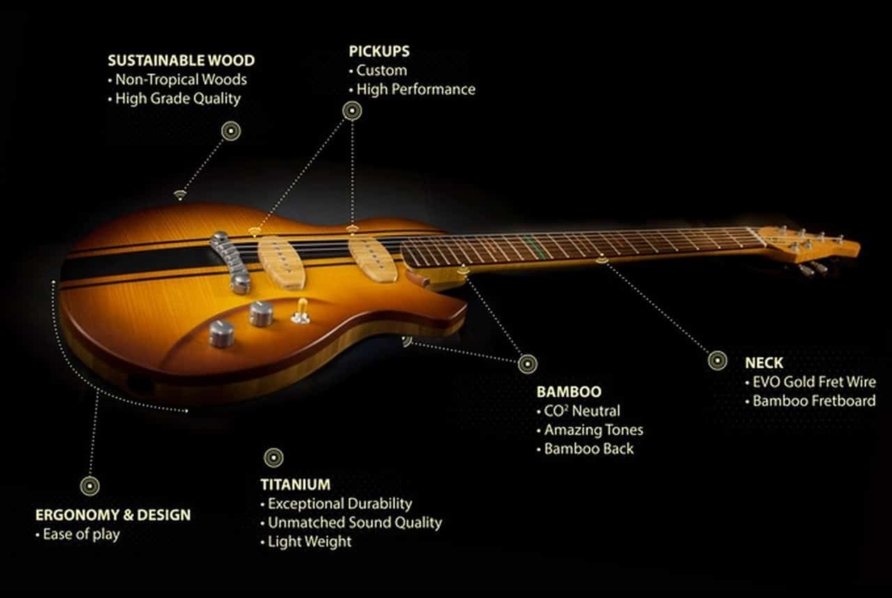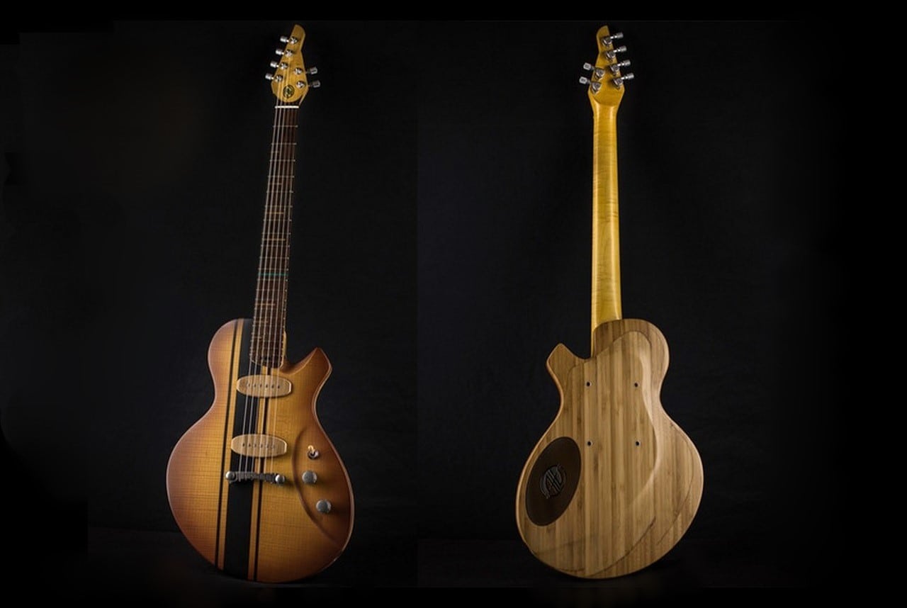 Featuring an ergonomic and avant-garde design, the guitar has its back and fretboard made of bamboo for an exceptional acoustic, durability and great looks. The top is flamed maple, while the 25.2-inch scale neck is made of maple with titanium reinforcement rod and parts.