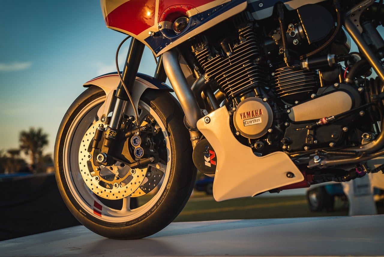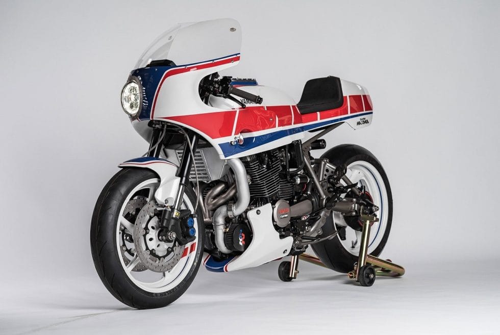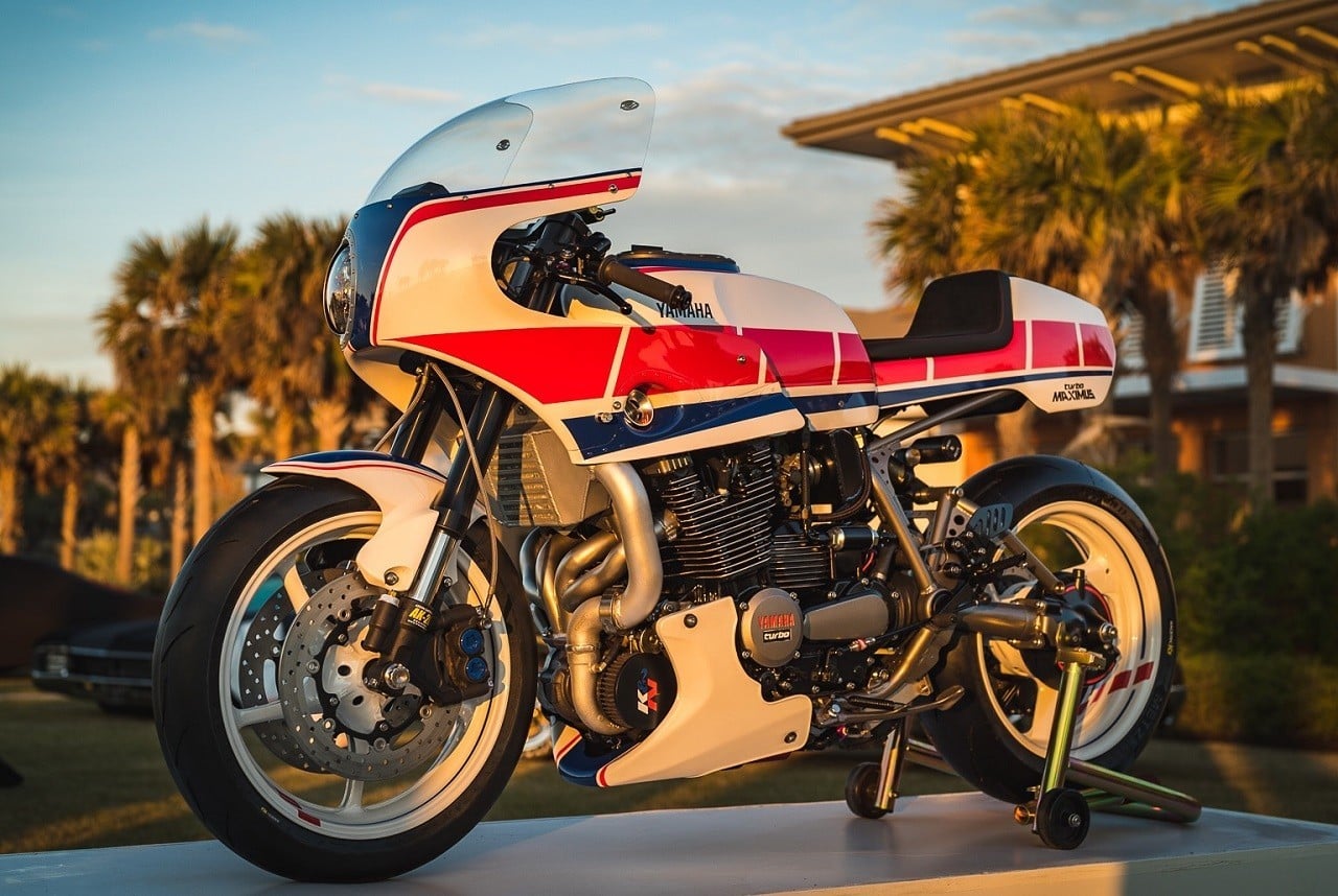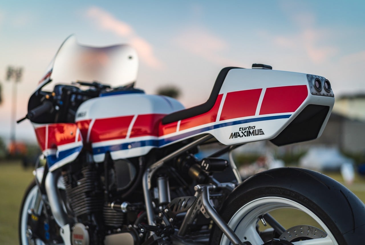 Based on a 1982 XJ750 Maxim, the 2-wheeler is inspired by a 1984 Yamaha track racing machine. It sports a fully rebuilt, turbocharged XJ900 engine pumping out 200-hp, a custom lockout clutch, Bell intercooler, stainless steel exhaust with titanium Akrapovic muffler, and a gas tank from a Yamaha XS750.