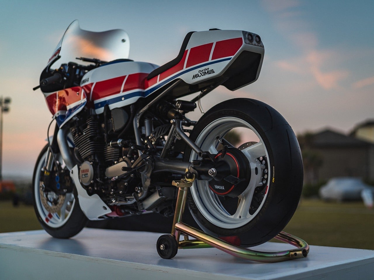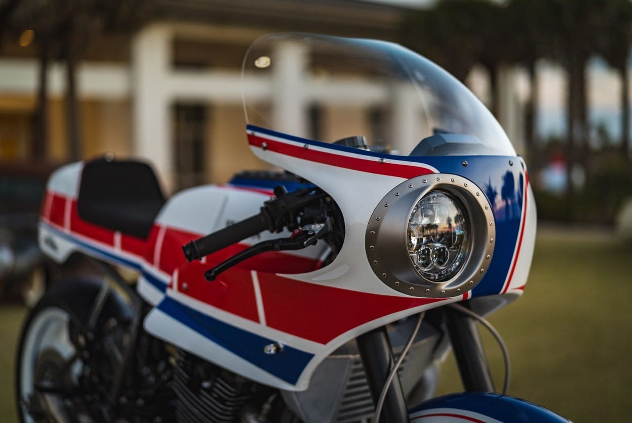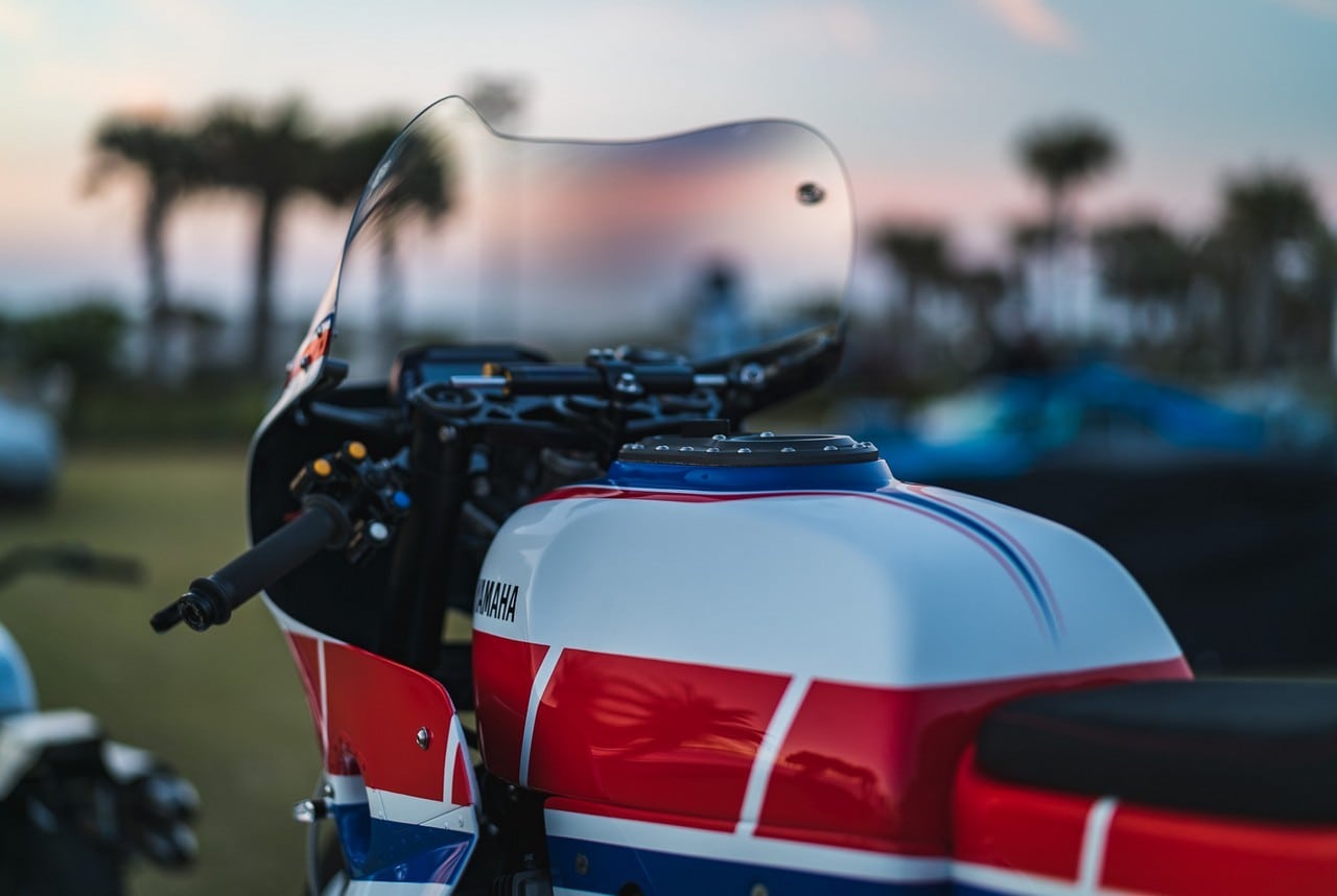 Based on a 1982 XJ750 Maxim, the 2-wheeler is inspired by a 1984 Yamaha track racing machine. It sports a fully rebuilt, turbocharged XJ900 engine pumping out 200-hp, a custom lockout clutch, Bell intercooler, stainless steel exhaust with titanium Akrapovic muffler, and a gas tank from a Yamaha XS750.