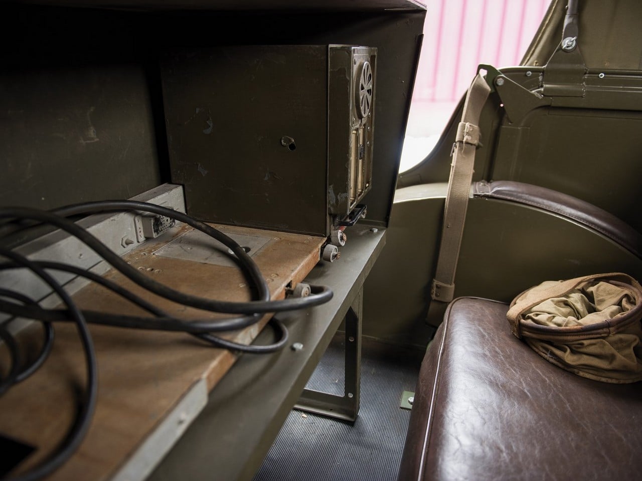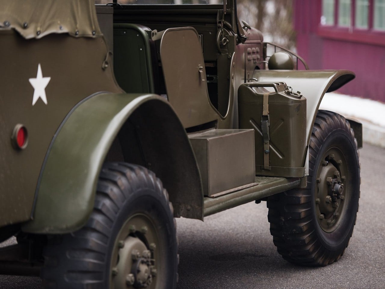 The truck you see here is powered by a Dodge T214, 6-cylinder engine producing 92-hp and 180 lb-ft of torque (max speed 53 mph), it weighs in at 5,335 lb, and has a 1,750 lb payload. It comes with a heavy-duty winch, an entrenchment tool and axe mounted at the rear, a jerry can next to the passenger side door, Signal Corps Radio in front of the rear seat, and a 12-volt electrical system.