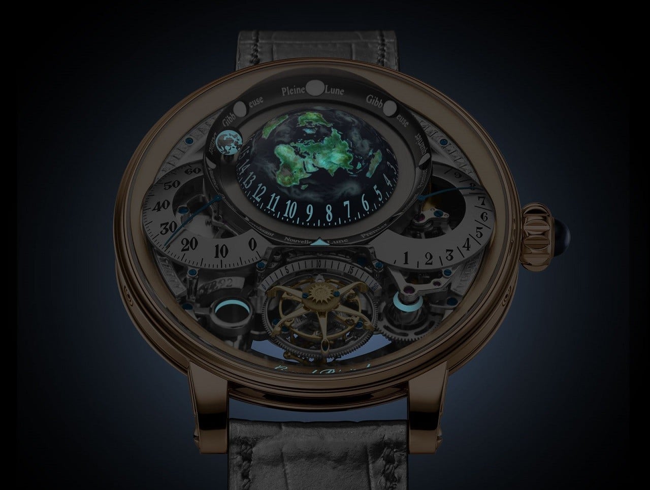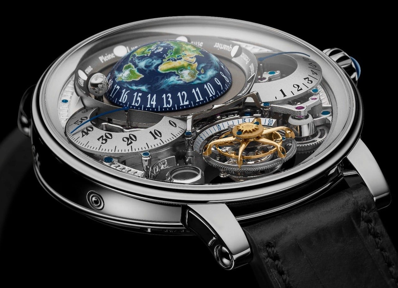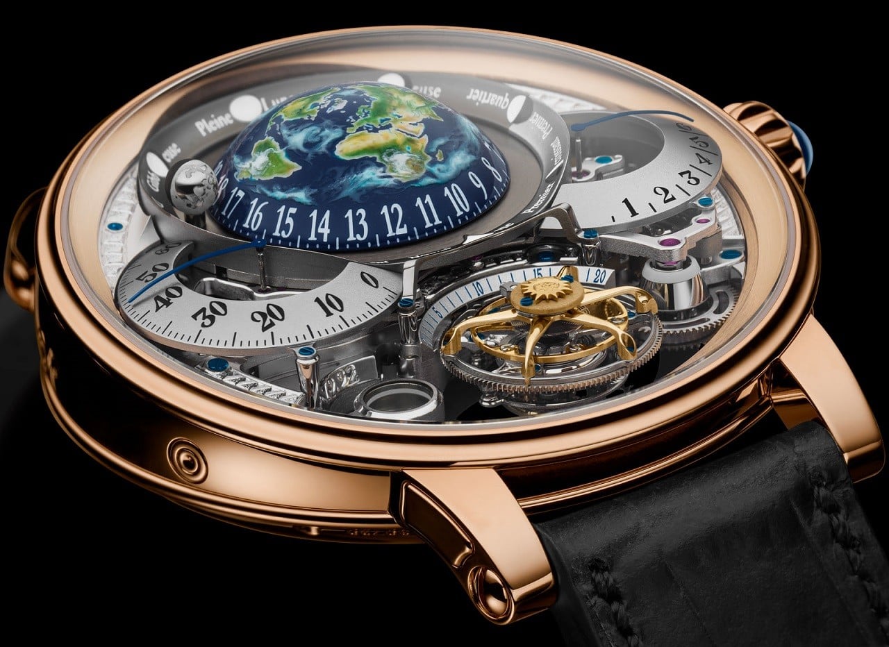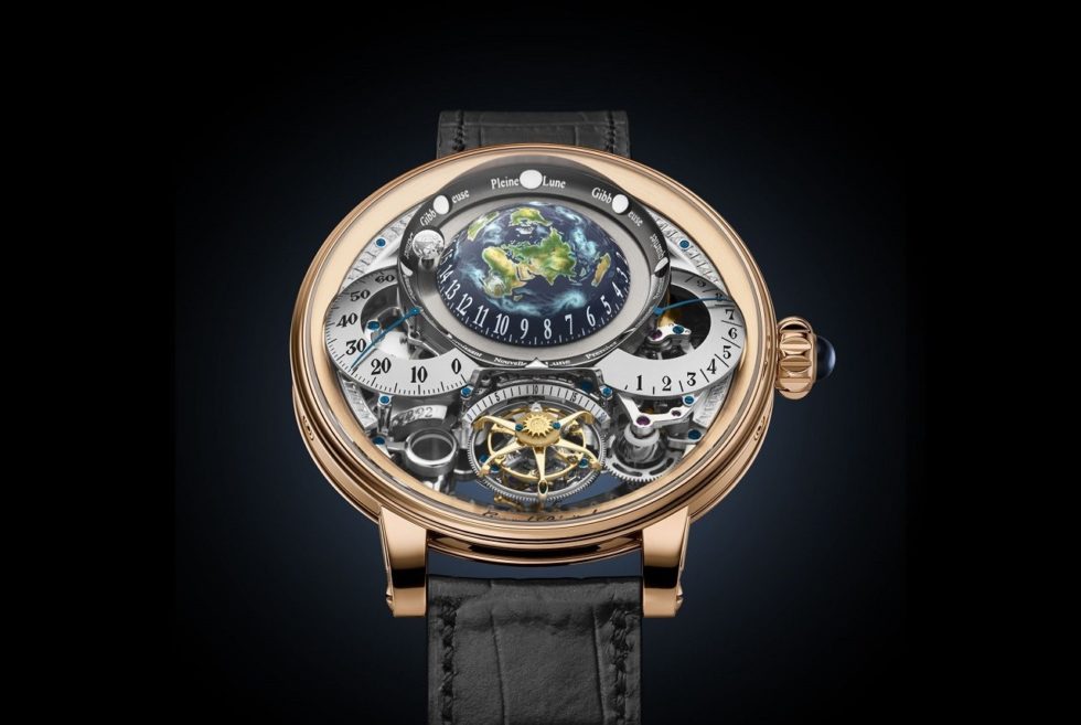 More than just a time-showing wristpiece, the handcrafted Swiss watch displays with perfect accuracy the movements of the Earth, Sun, and Moon. On the back of it, is a perpetual calendar, while a manually-wound caliber with 472 components, flying tourbillon, and a nine-day power reserve, ticks at the heart of this haute horlogerie timepiece.