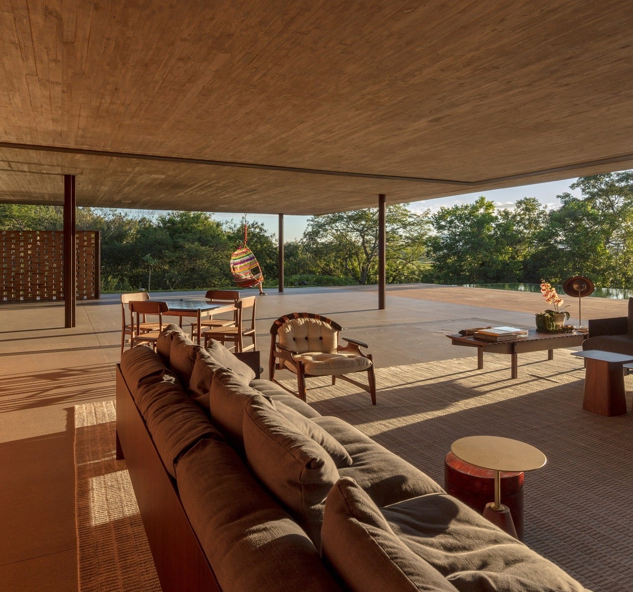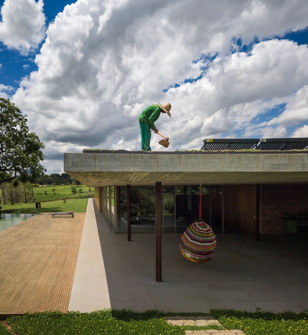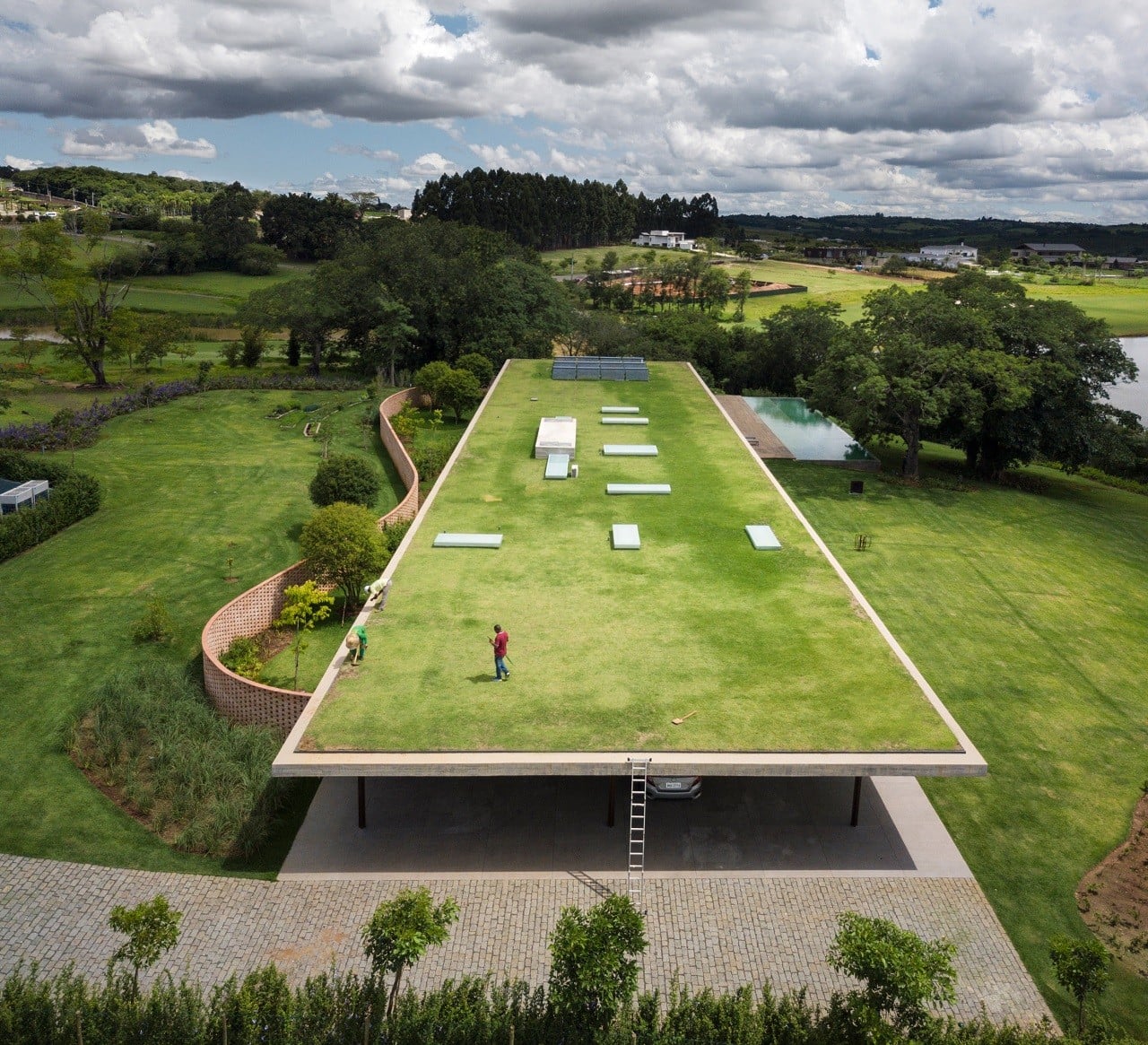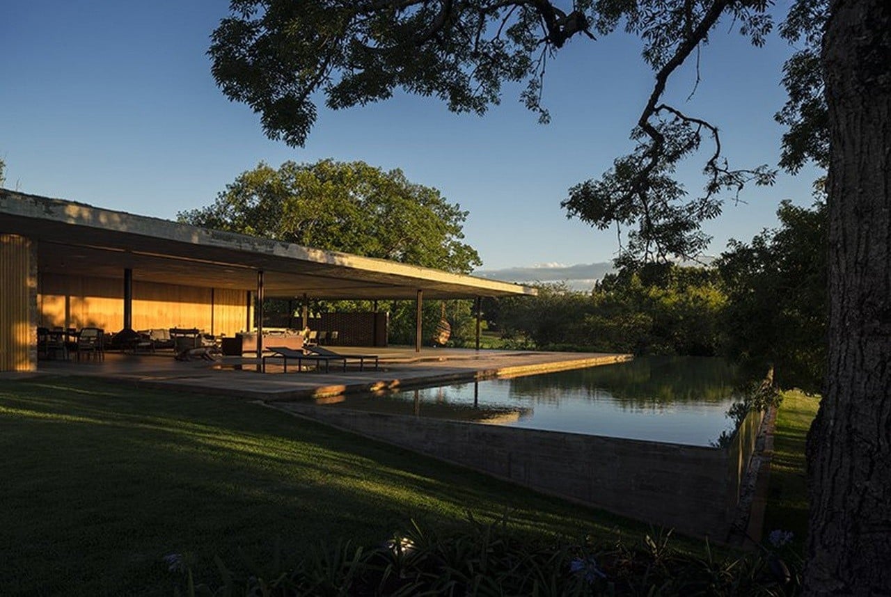 Located in Brazil’s Porto Feliz, the abode is a solid concrete slab that blends in with its pristine surroundings. Inspired by “the elegant proportions of Miesian architecture, the home rests directly on cross-shaped metallic pillars distributed modularly in three axes.