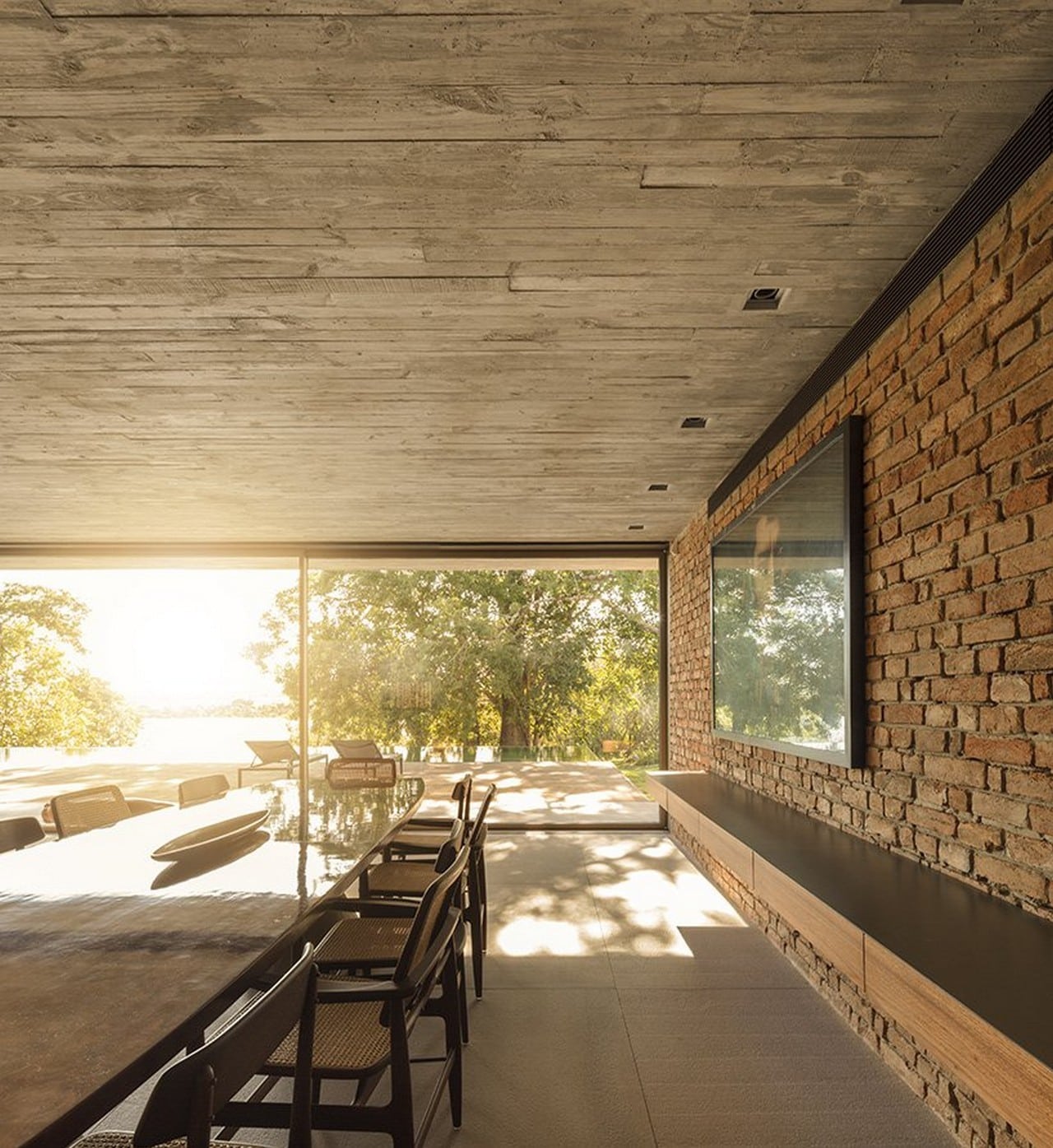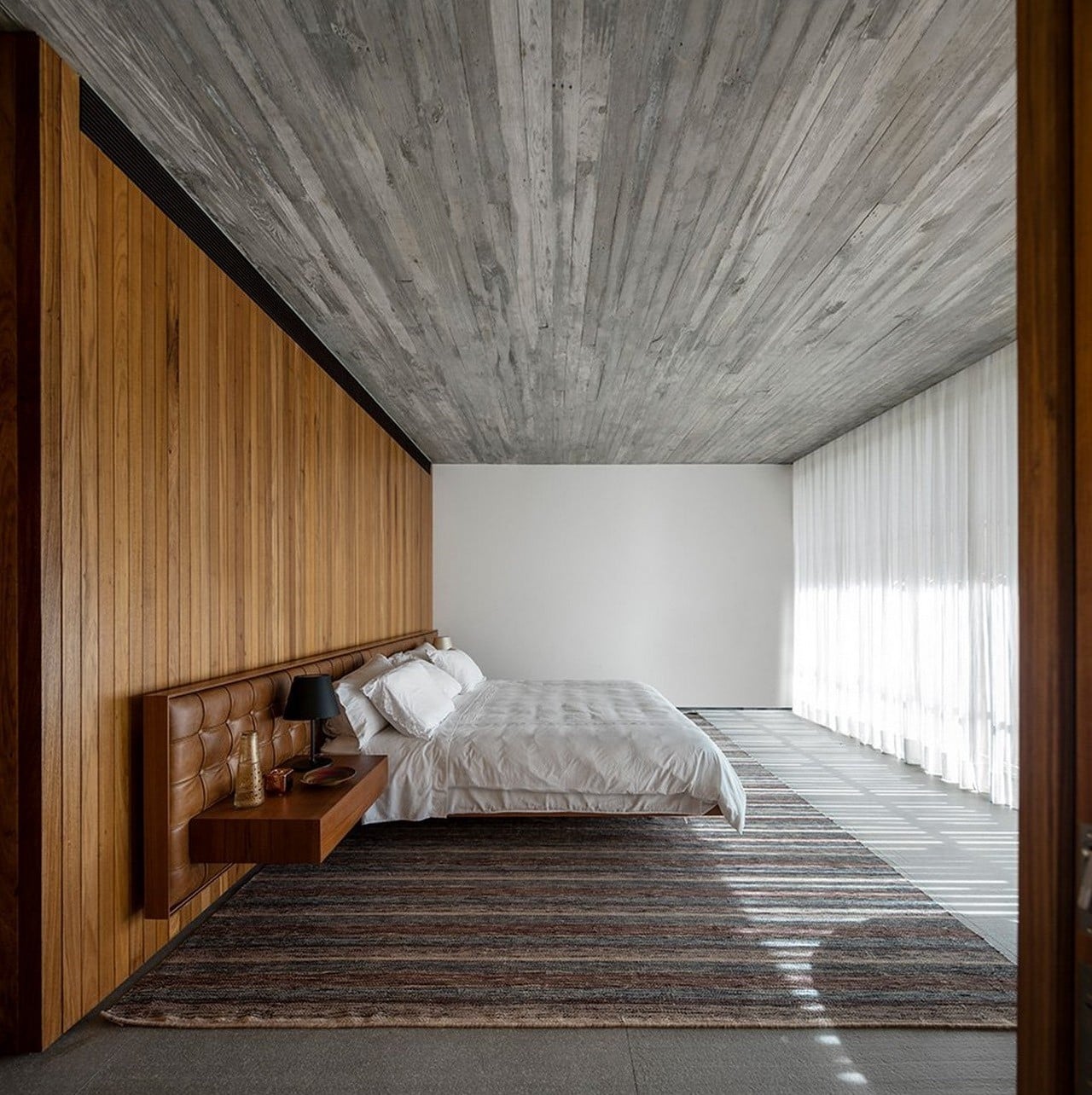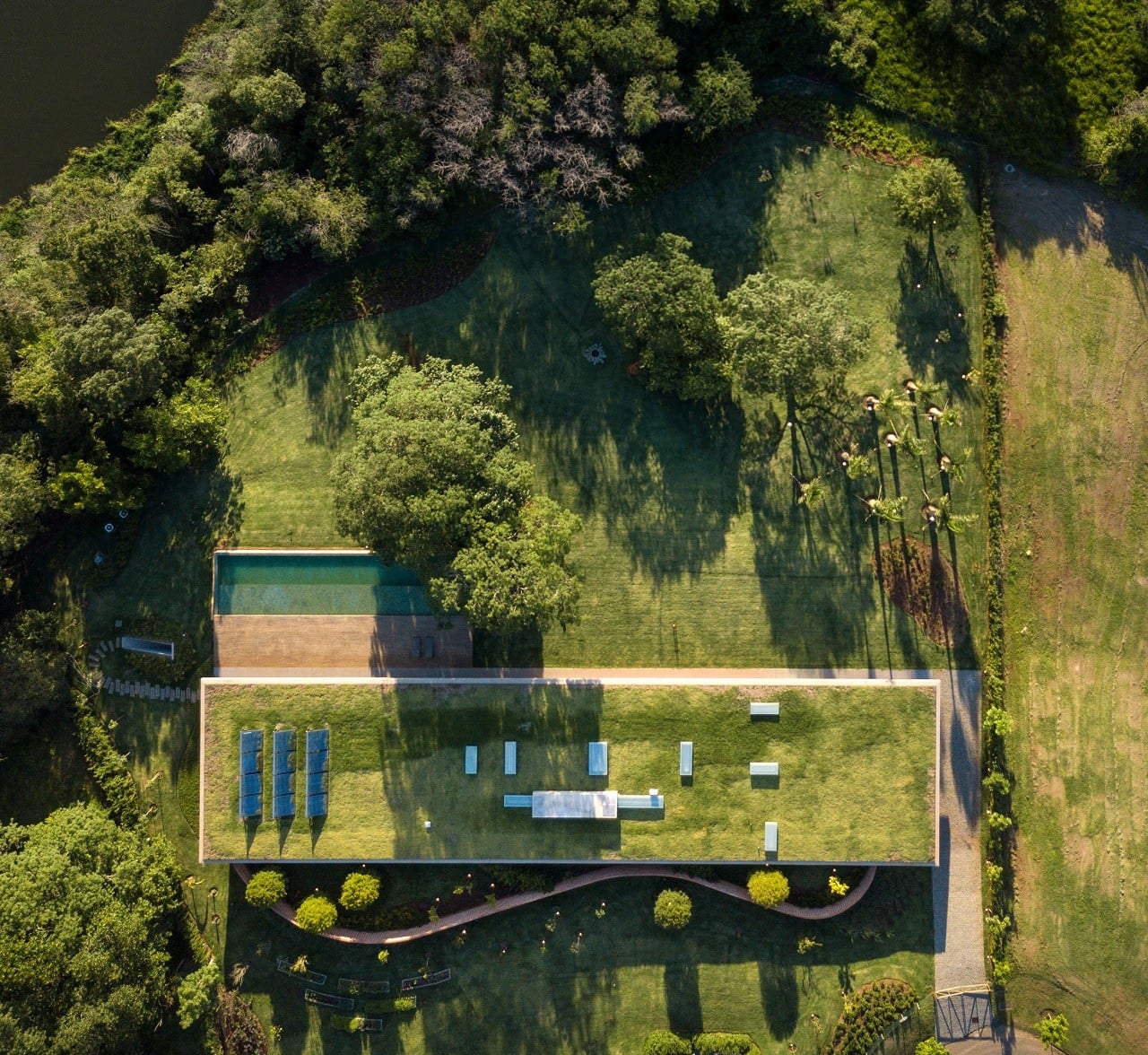 Located in Brazil’s Porto Feliz, the abode is a solid concrete slab that blends in with its pristine surroundings. Inspired by “the elegant proportions of Miesian architecture, the home rests directly on cross-shaped metallic pillars distributed modularly in three axes.