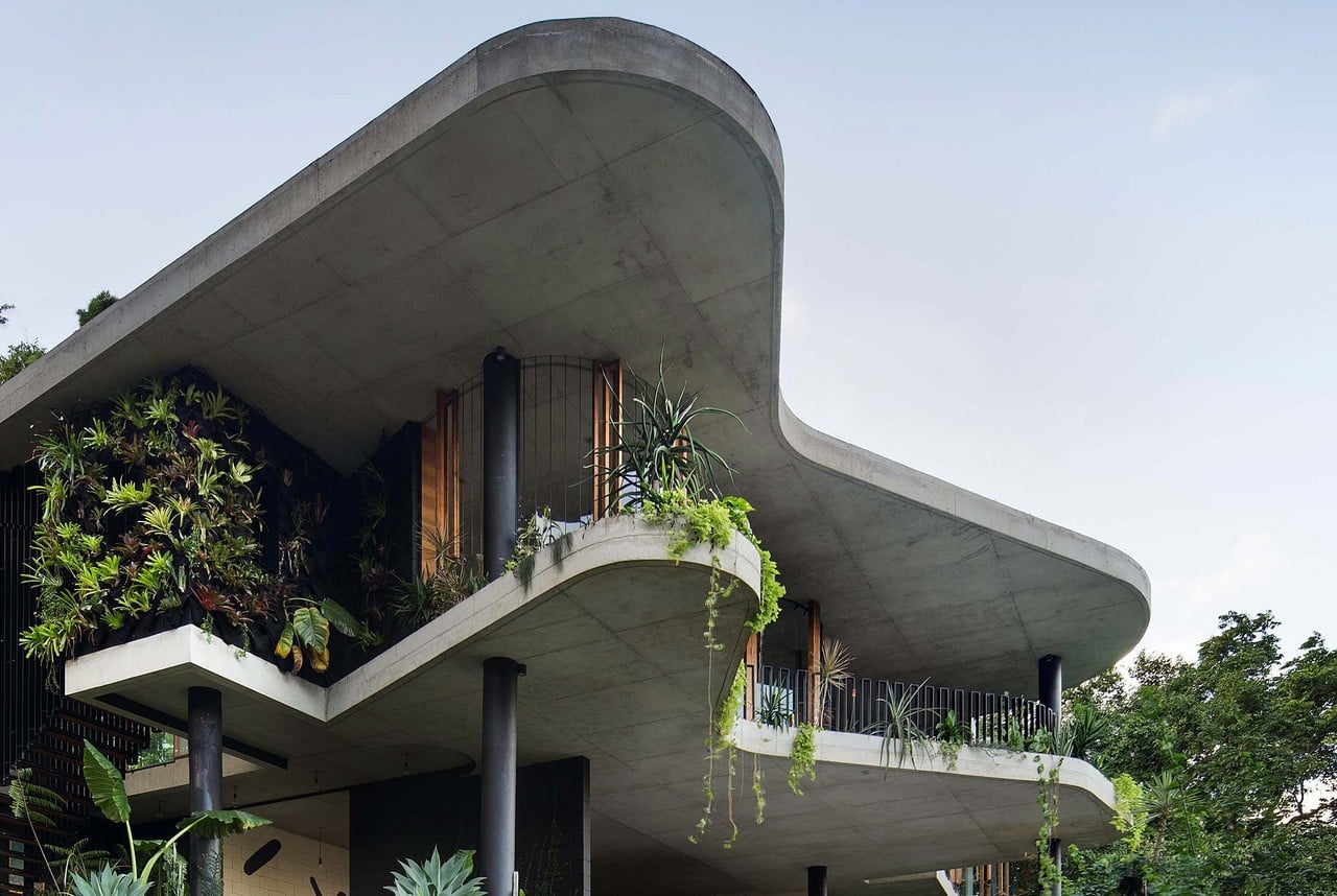 Wedged between two curved concrete slabs, the dwelling features floor-to-ceiling windows throughout letting natural light protrude and connecting the inhabitants to the lush exterior. The internal walls are also concrete, minimally adorned to maintain an open feel. Contrasting warm materials can also be found inside, like the brick and timber that form the bookshelves-lined wall that opens to reveal the master bedroom.
