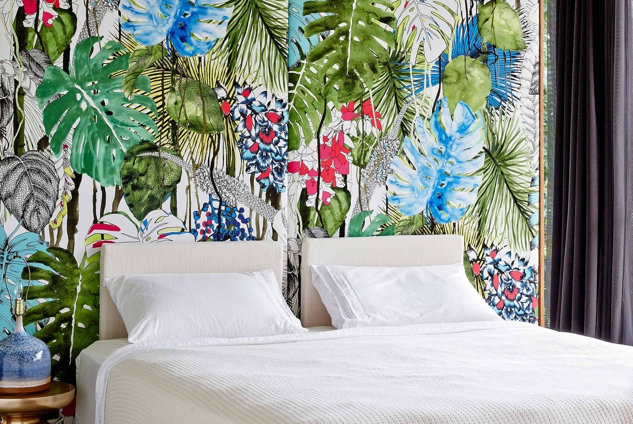 The outdoor space has an above-ground pool with an ornamental waterfall, while a toy-like bright yellow ladder provides access from the courtyard to the rooftop which is topped with tropical plants and allows for lounging and taking in more of the breathtaking views.