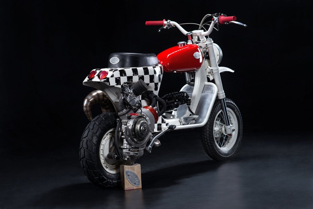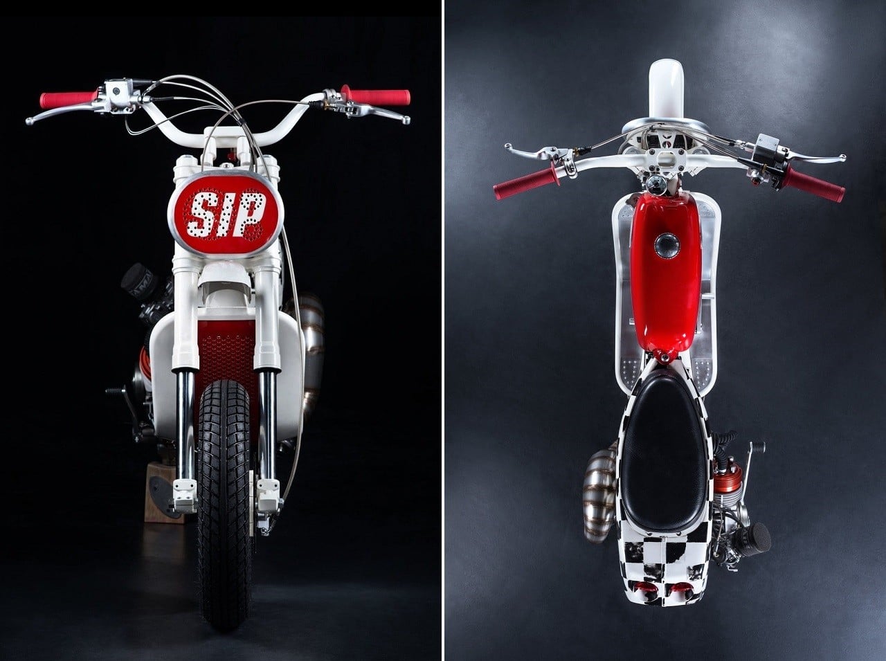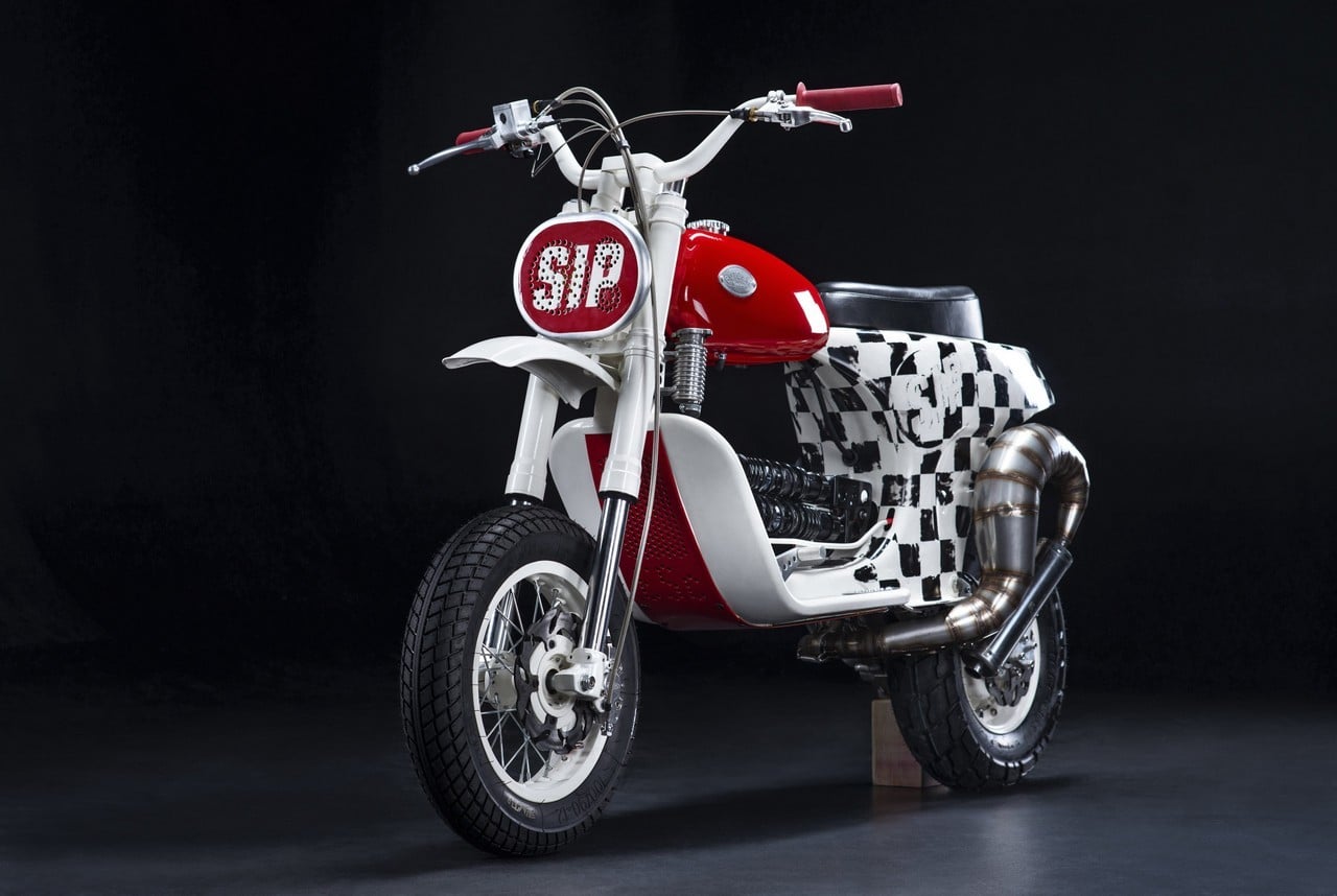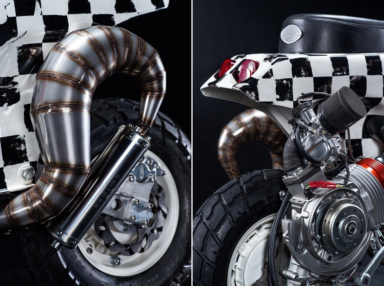 The lengthy list of upgrades also includes Fat Bars with Domino quick action throttle, a folding clutch lever, LED tail light, custom ‘curly’ exhaust tubes, plus new crankshaft, ignition, clutch and driveshaft. Finished in black, red and white with an ‘aged’ checkered rear section, this mad scooter has enough oomph to induce a permanent grin on the face of anyone brave enough to ride it.