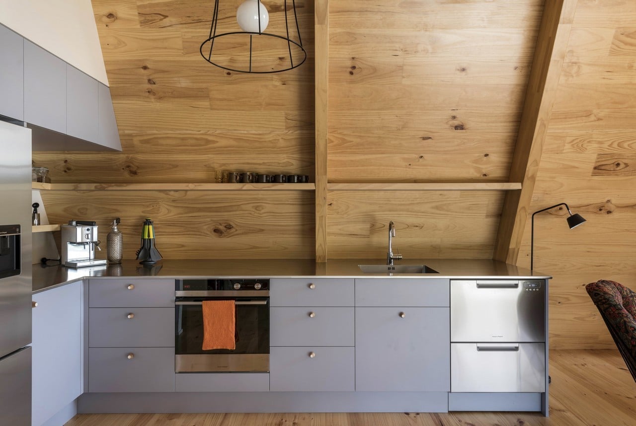 The home is composed of three timber cabins which are organized around a communal outdoor terrace. The cabins imitate the surrounding alpine setting and are placed around an elevated dining platform with fire pit, where the presence of the late sun and the captivating views of the area invite to connect with the outdoors. Externally, the cabins are clad in unfinished cedar ‘folly’ and contrasting dark-stained cedar, while the extensive use of timber brings warmth inside.