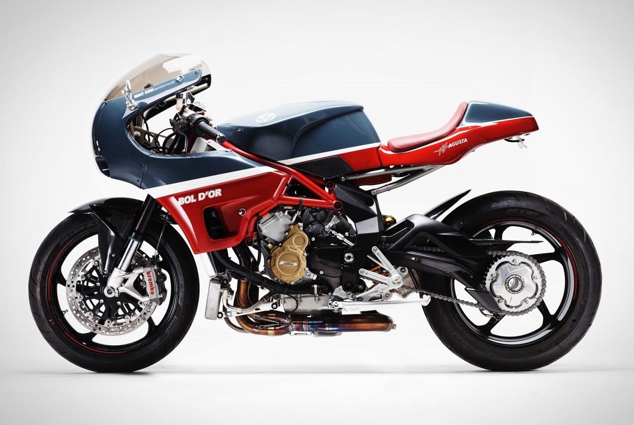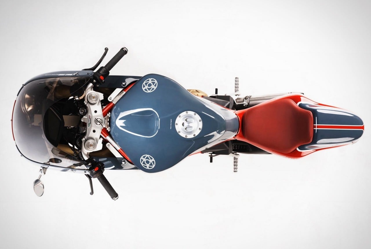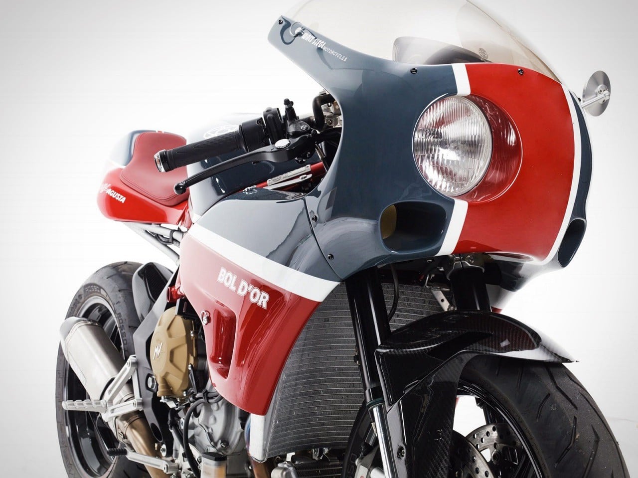 Built by one of the most talented bike-tunning specialists in the world, Walt Siegl, ‘Bol d’Or’ is based on an MV Agusta F3 model. At 381 lbs, the donor bike was already a light racer, but Walt took it a step further, shaving off 80 lbs, in order to boost the bike’s performance on the track. While the original frame remained untouched, the fairing, subframe, fuel tank, seat, rear cowl, fenders, and exhaust were all removed.
