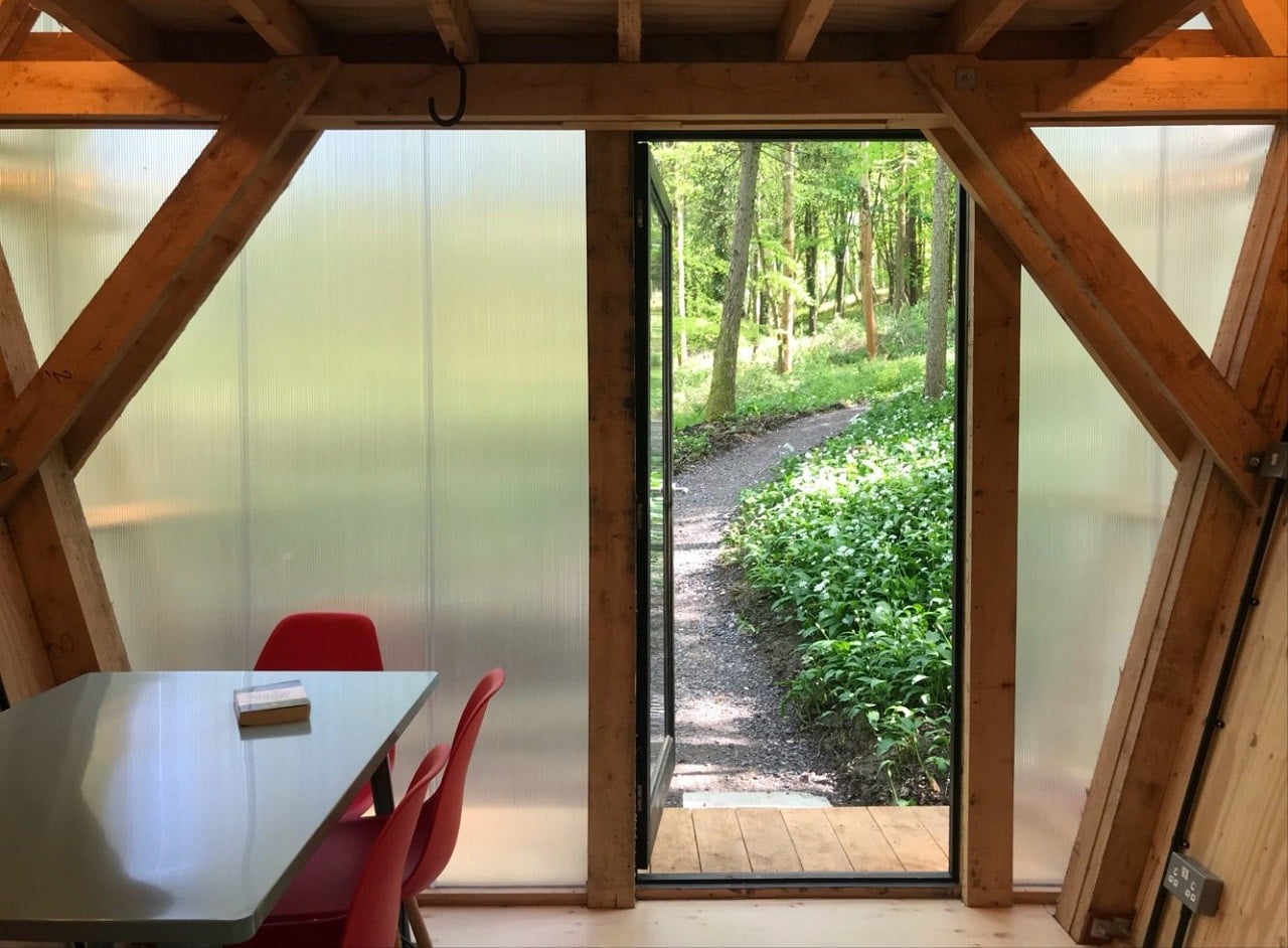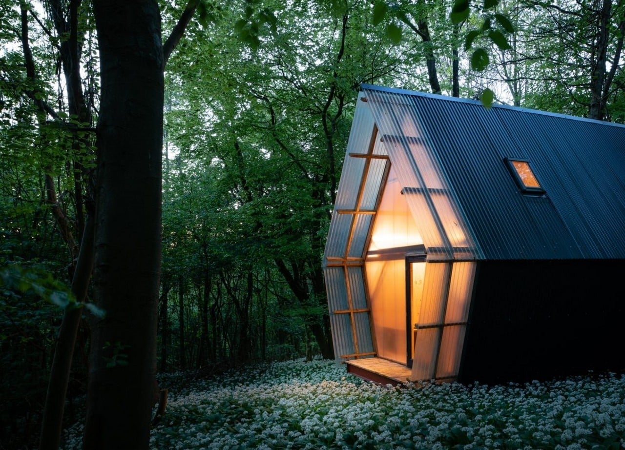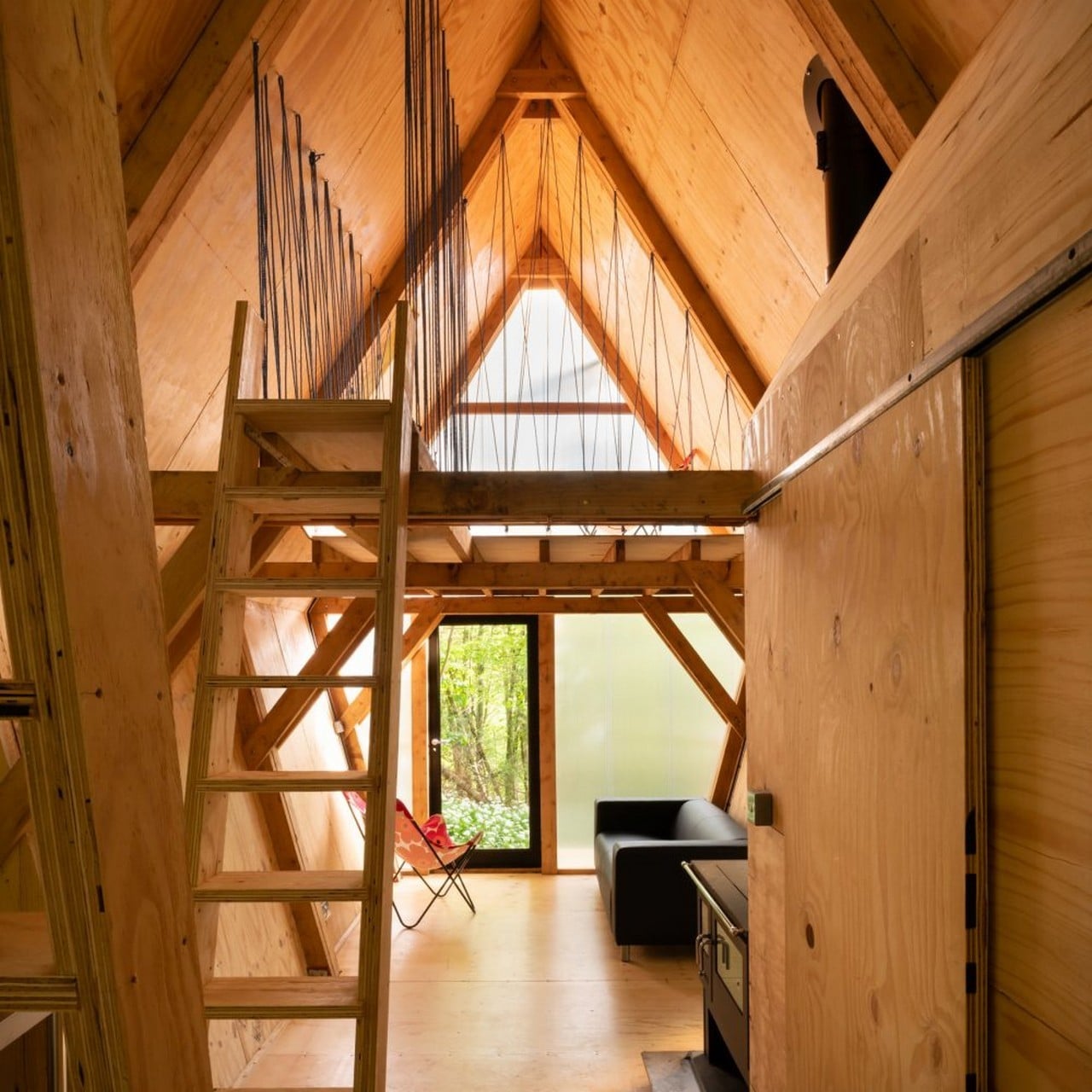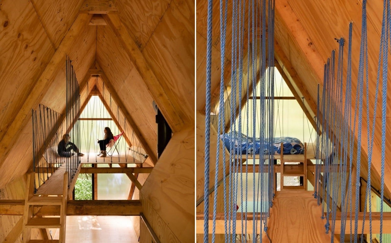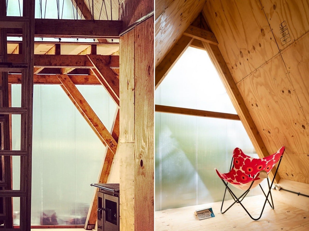 The interior makes effective use of timber, has scavenged insulation and is lined with shuttering ply, including the 2 staircases; handrails are constructed from offcuts of blue rope, and natural light gets through via gable ends which are ‘glazed’ with high-performance interlocking polycarbonate.
