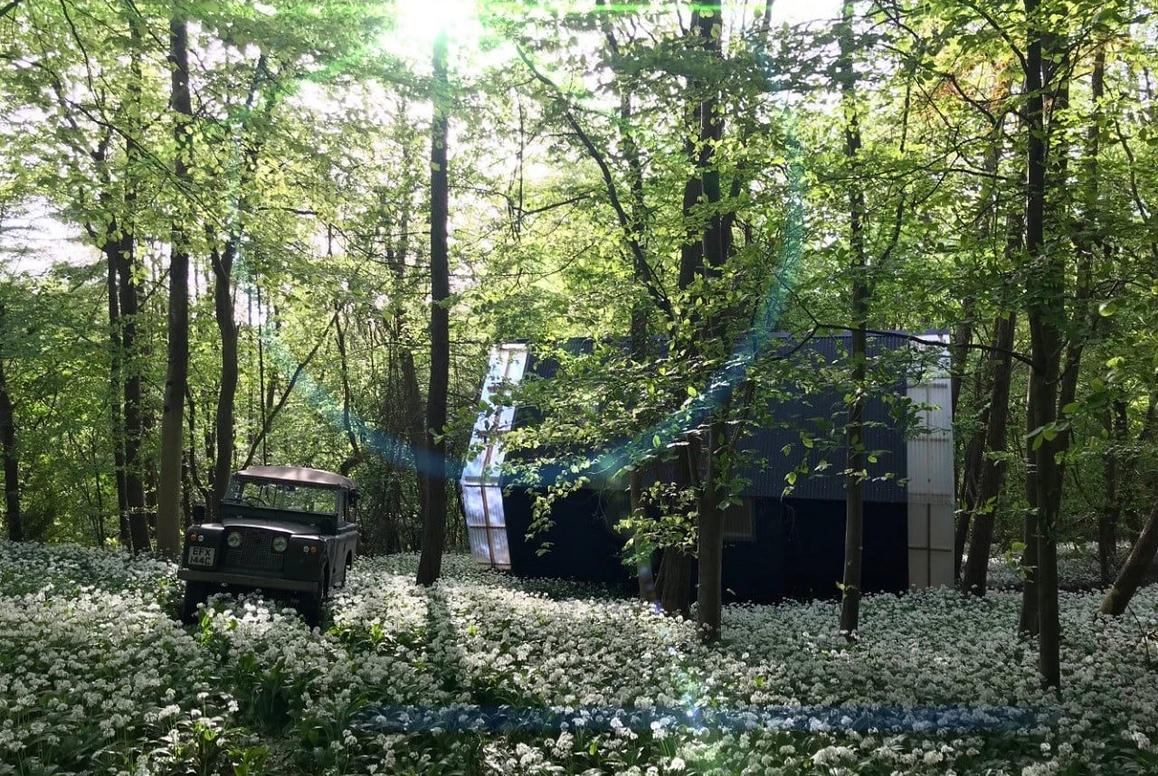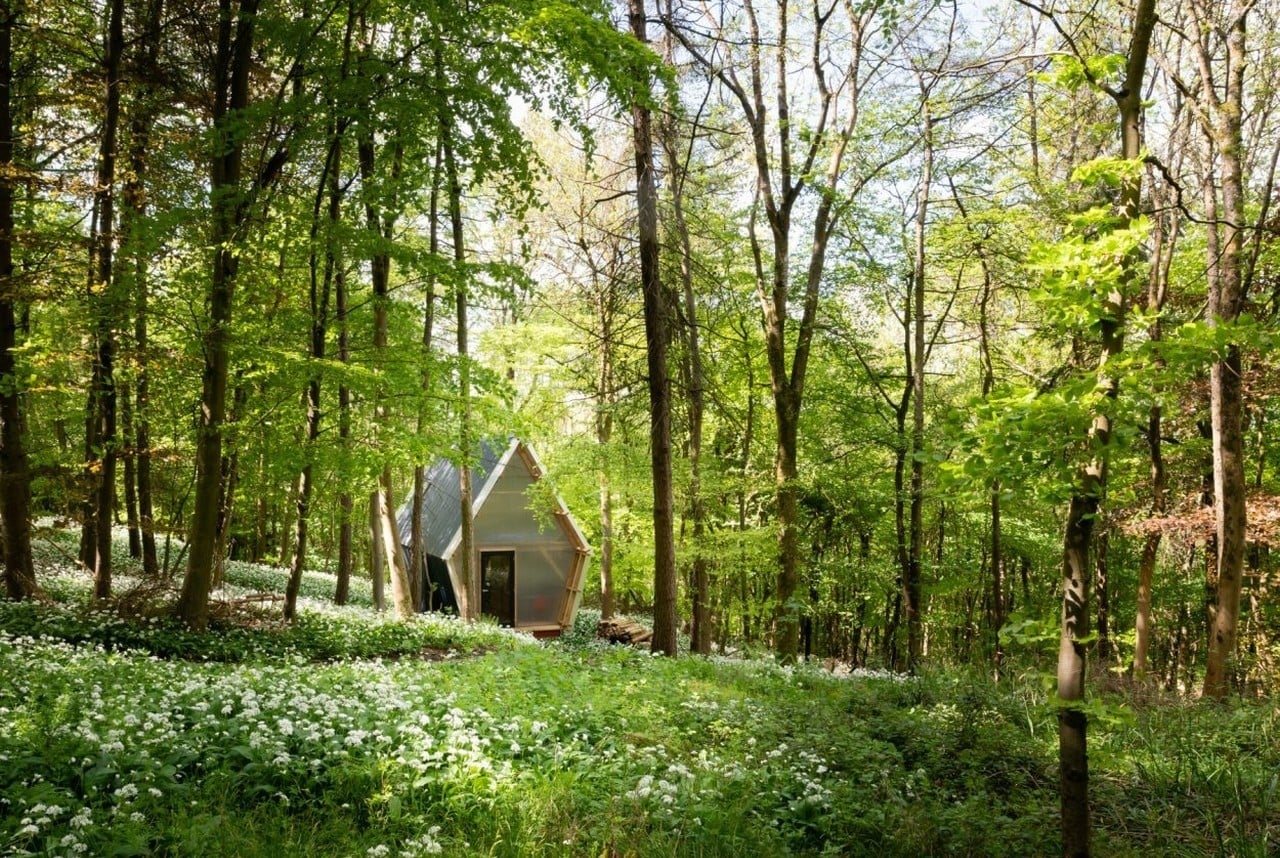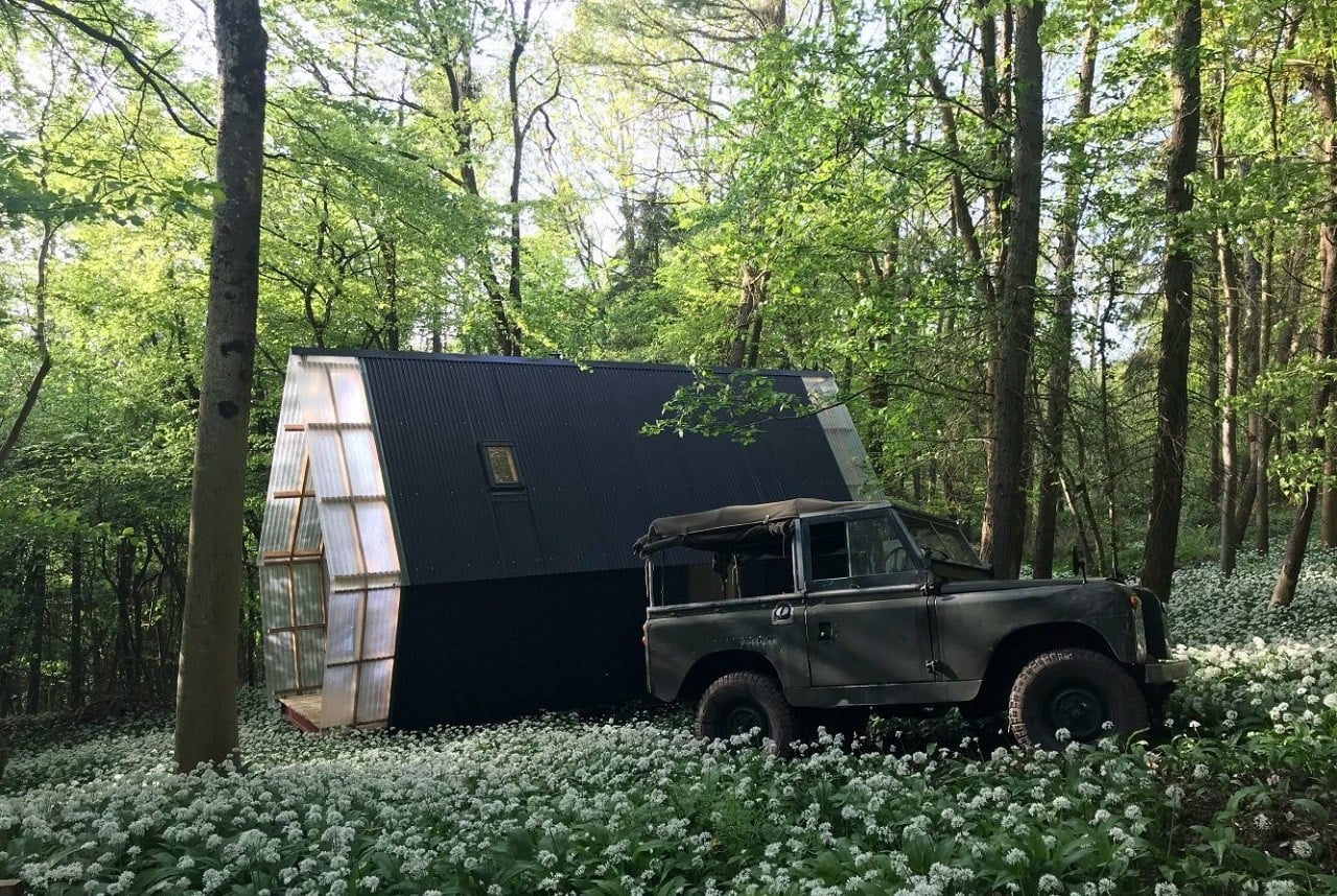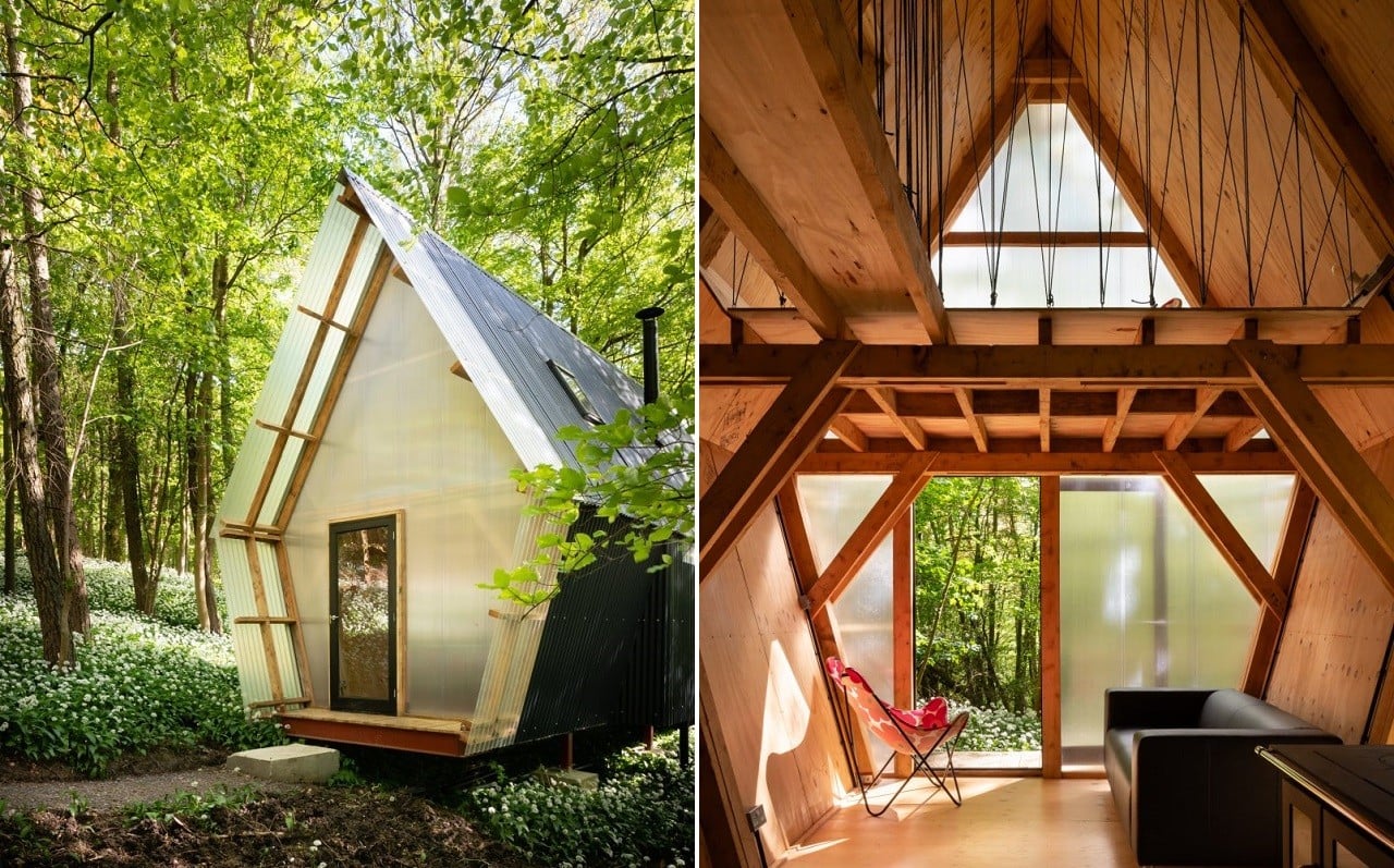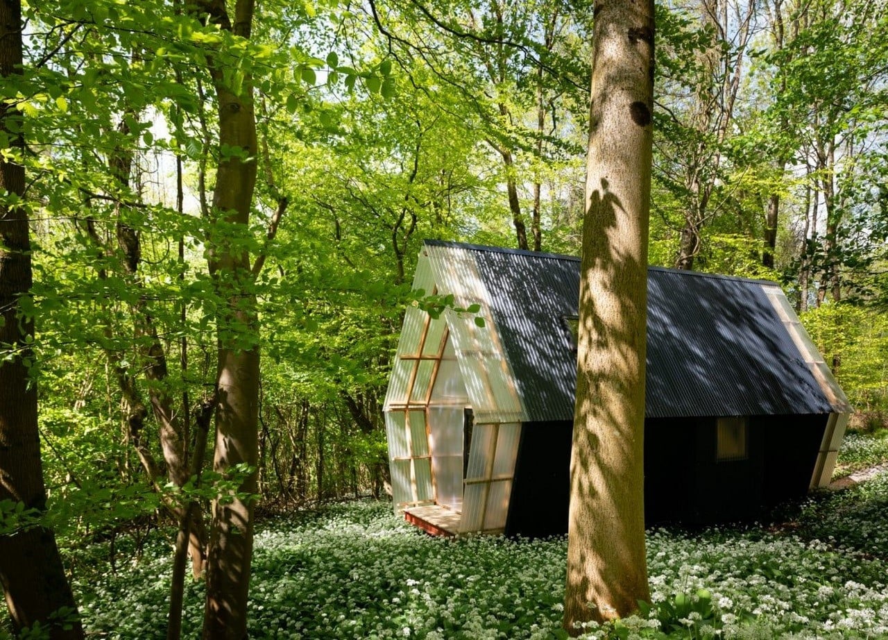 The interior makes effective use of timber, has scavenged insulation and is lined with shuttering ply, including the 2 staircases; handrails are constructed from offcuts of blue rope, and natural light gets through via gable ends which are ‘glazed’ with high-performance interlocking polycarbonate.