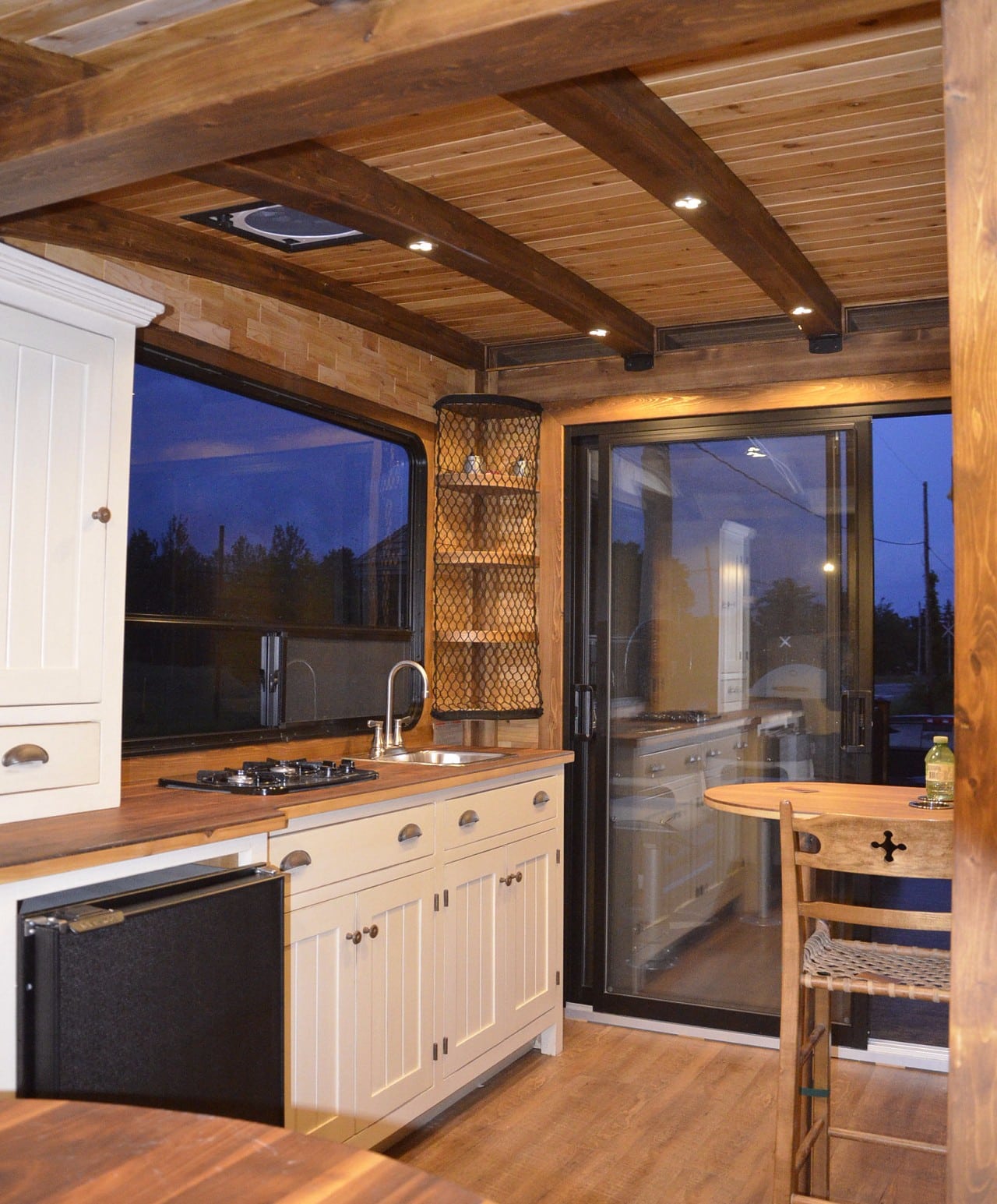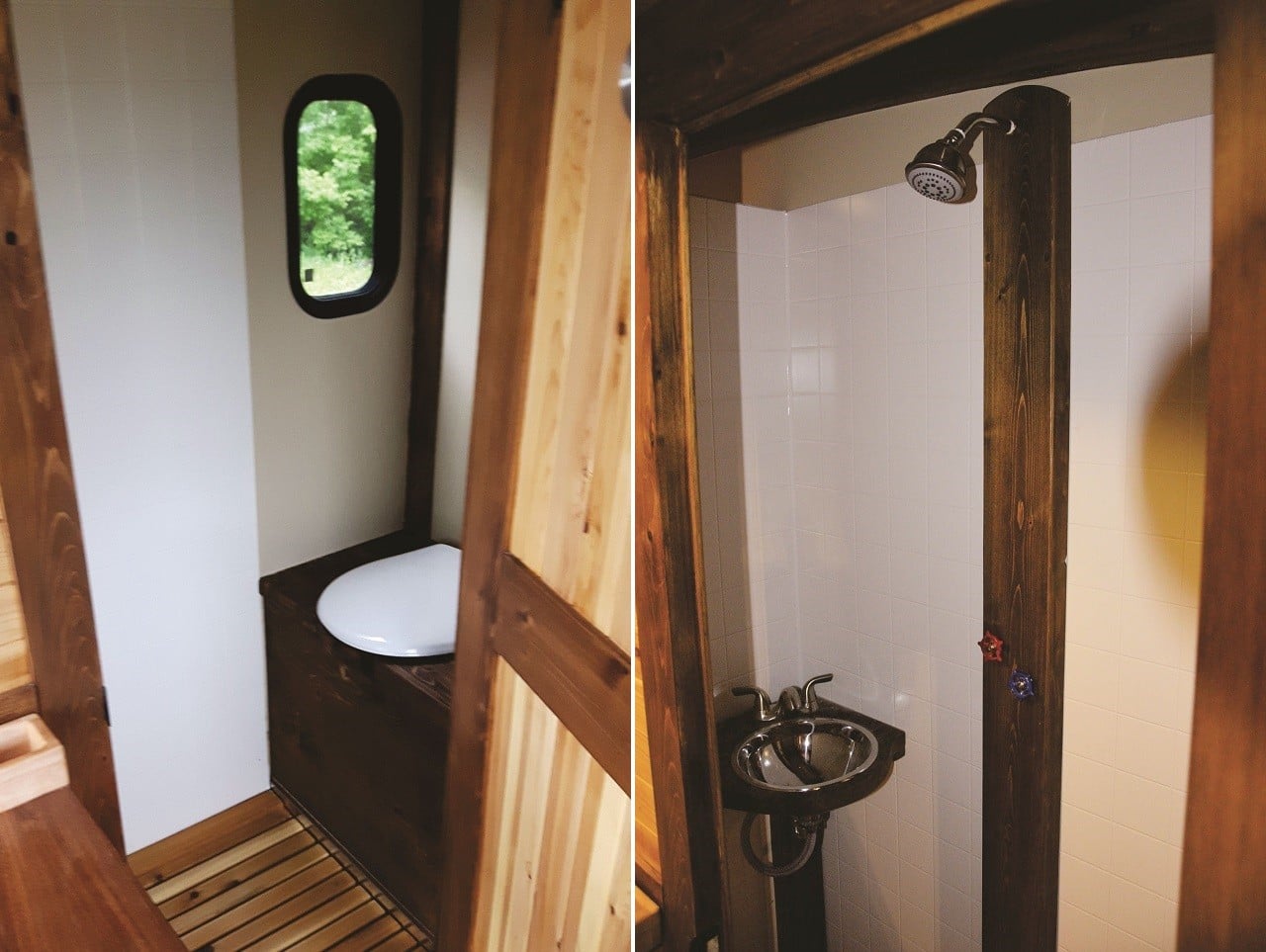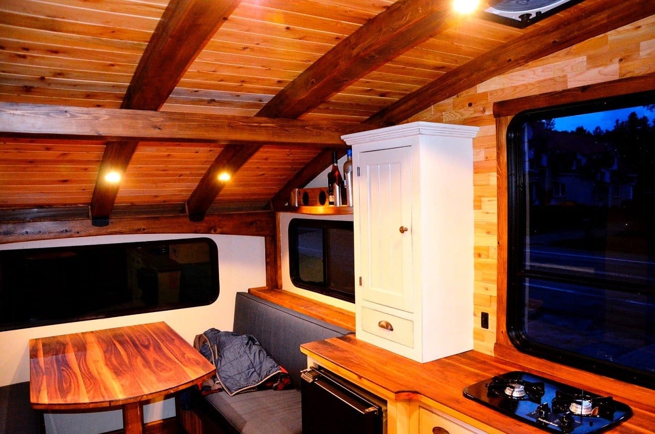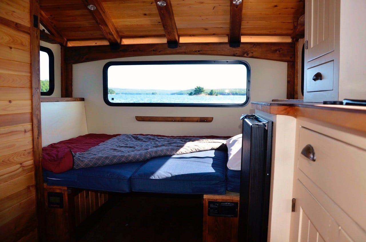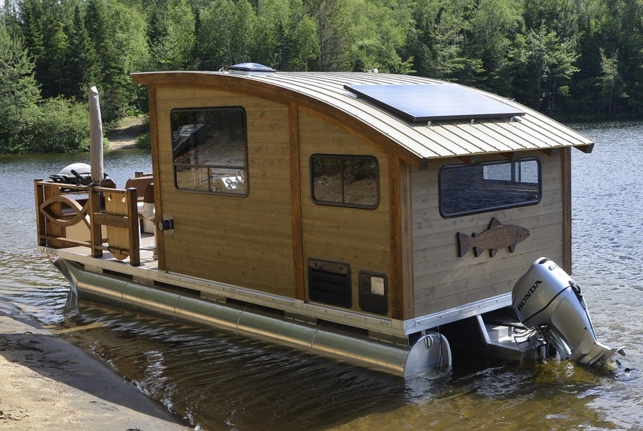 Mostly constructed from sustainably-sourced cedar and plywood, the 5,640 lb houseboat floats atop three aluminum pontoons. It’s powered by a 90-hp Honda BF90 VTEC outboard, while roof-mounted solar panels connected to batteries provide electricity.