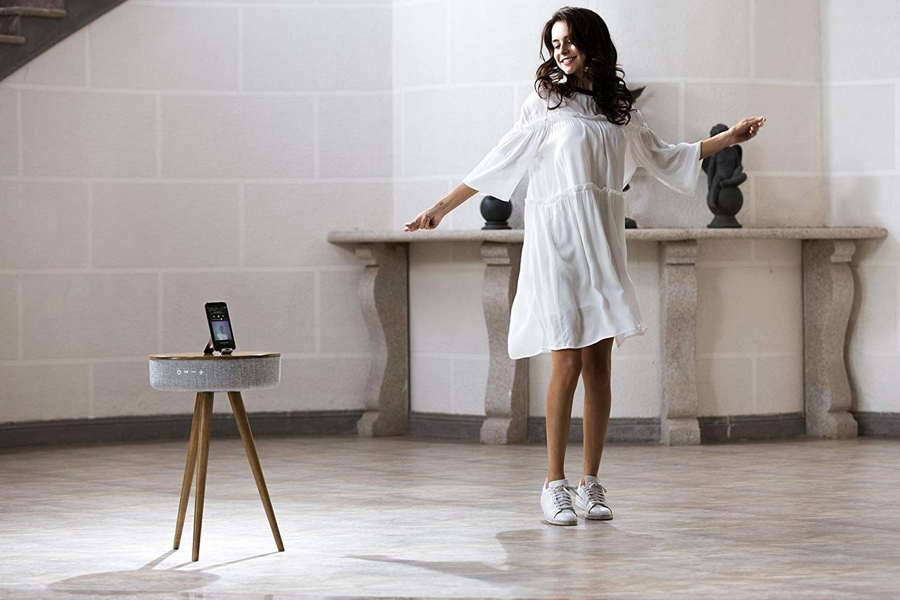The 360 surround speakers are wrapped in grey heather fabric and the table comes with a large rechargeable battery so you can move it for hours of wireless use.