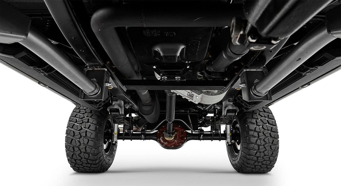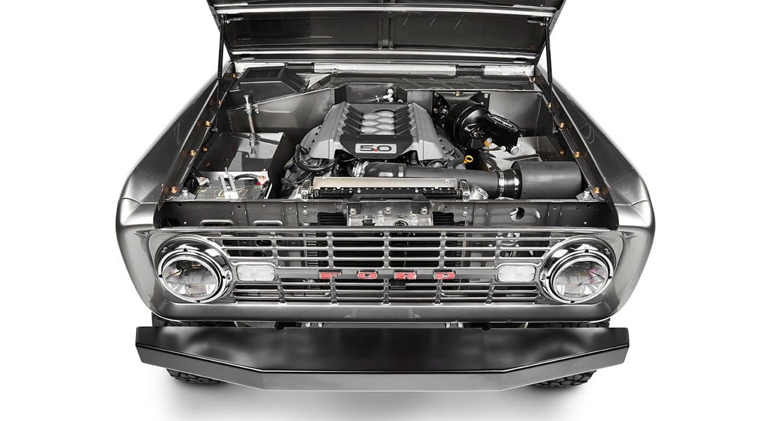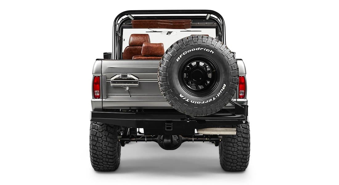 Pop the hood to see the powerful Coyote 5.0-liter engine that lies snugly within. Swampy terrain and off-road paths are easily conquered by its massive 33-inch BFG mud-terrain tires. Its custom-made roll cage, bumpers, and the soft top lend even more to its classic charisma. Crack the door open and peek inside to see the reupholstered seats covered in classy Smoked Tobacco leather.